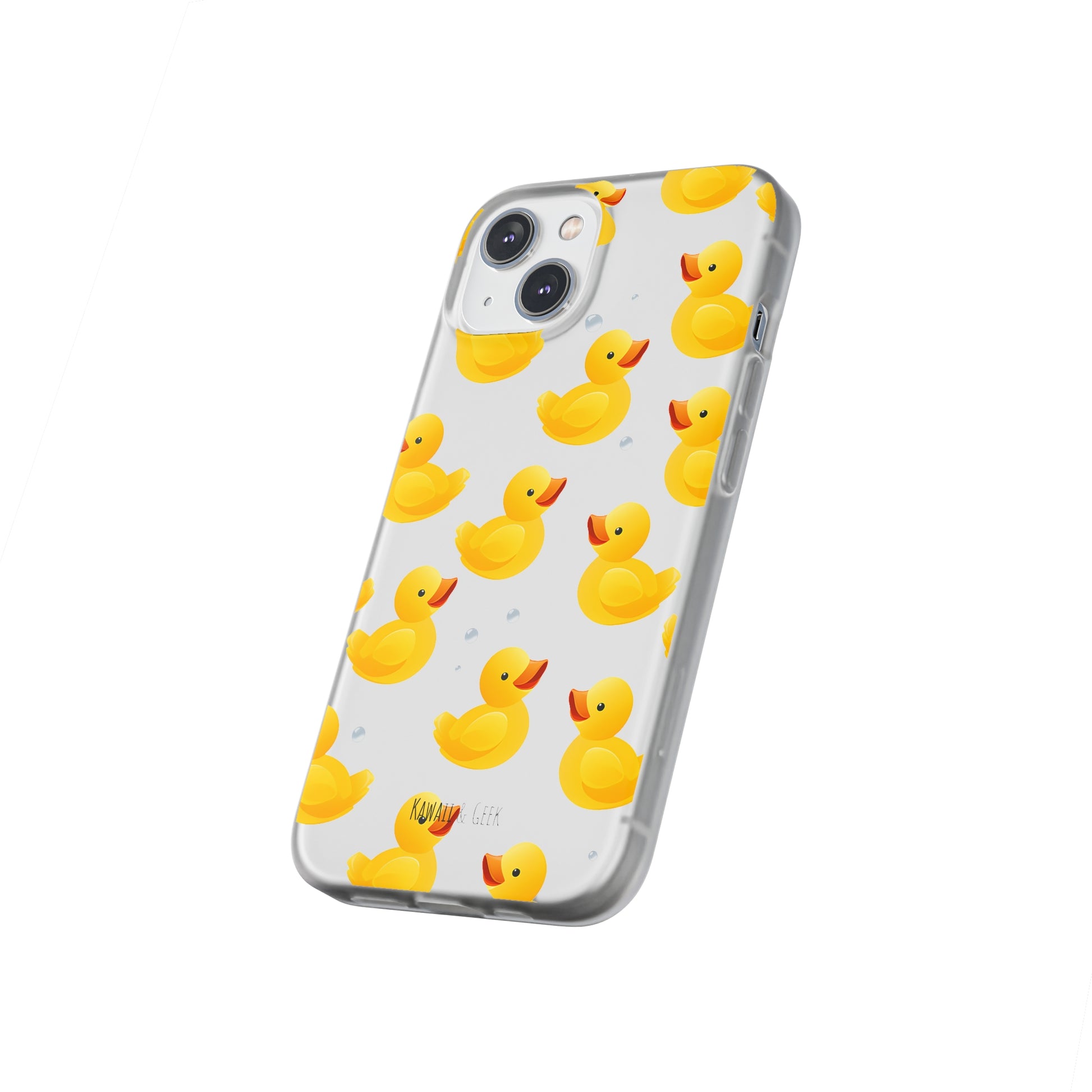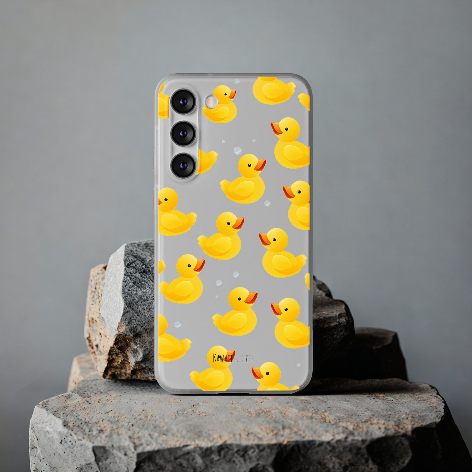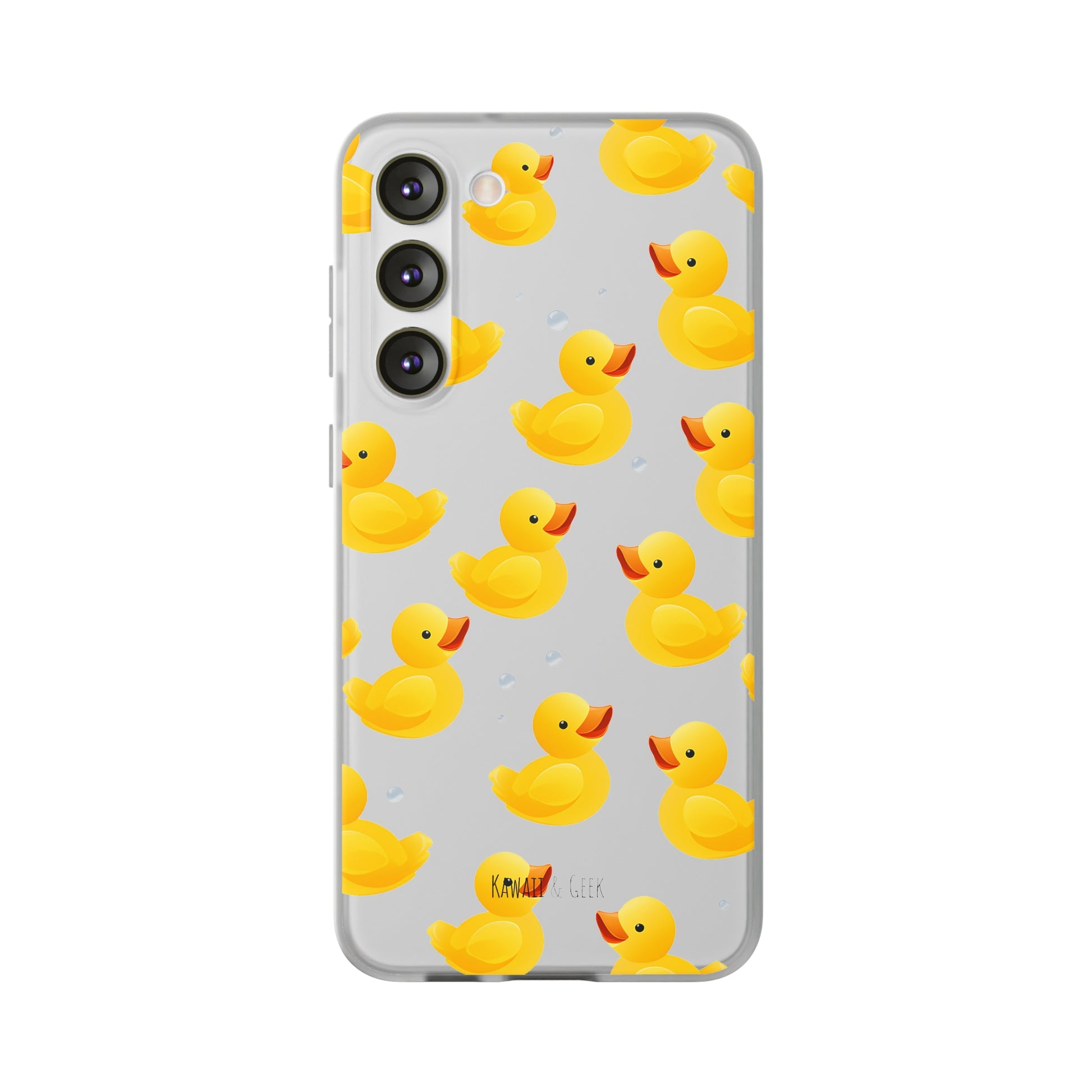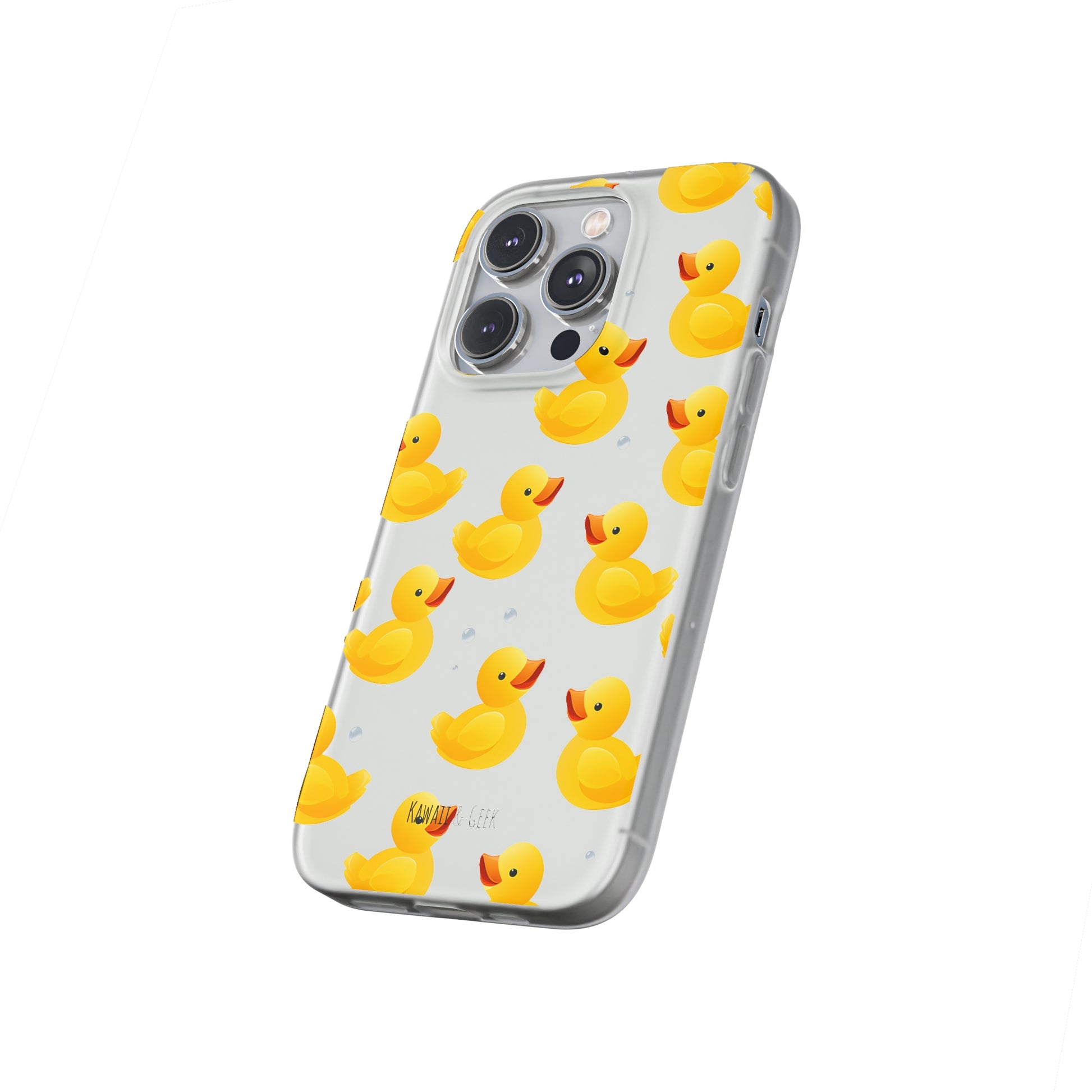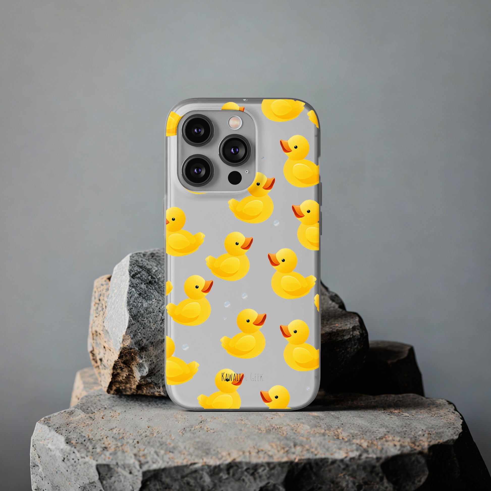 Keywords: Yellow duck case, Flexi phone cover, Transparent case, Playful design, Childhood nostalgia, Iconic ducks, Quirky style, Duck pattern, Premium protection, Retro vibe, Phone accessory, Classic design, Fun phone case.
