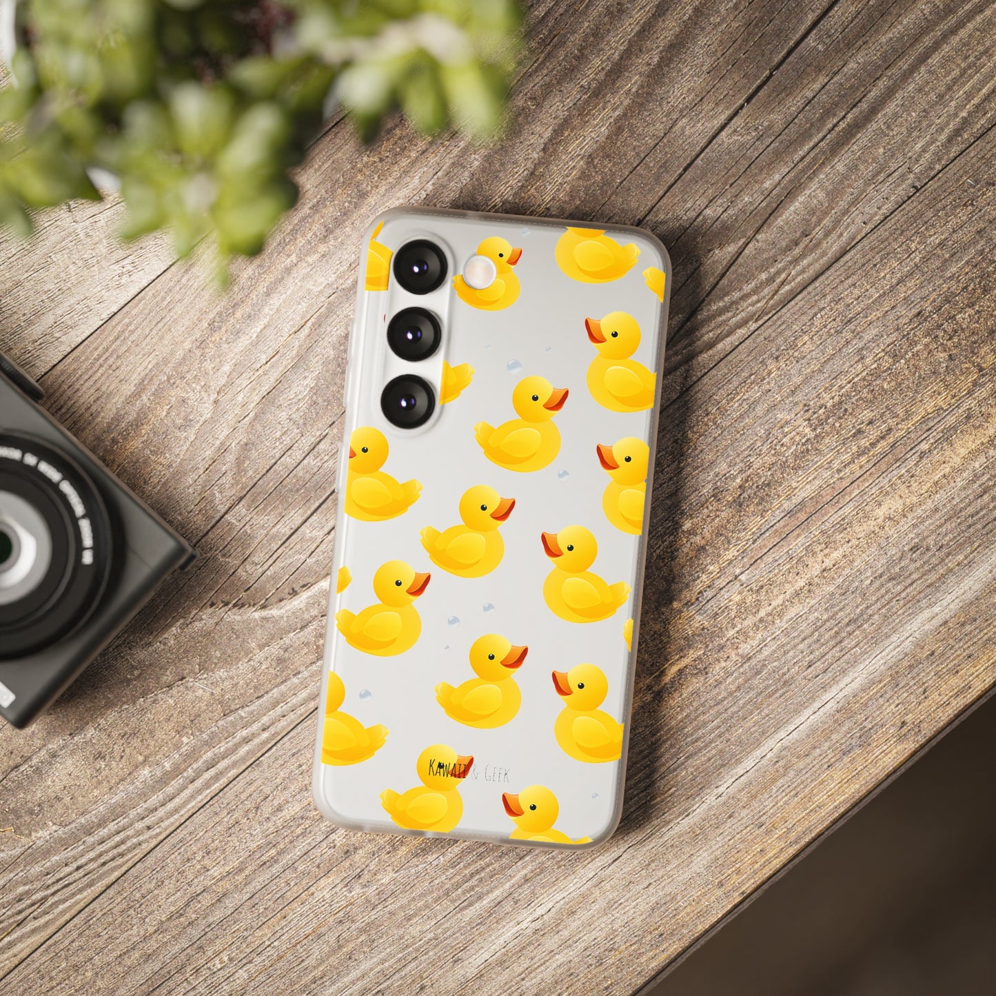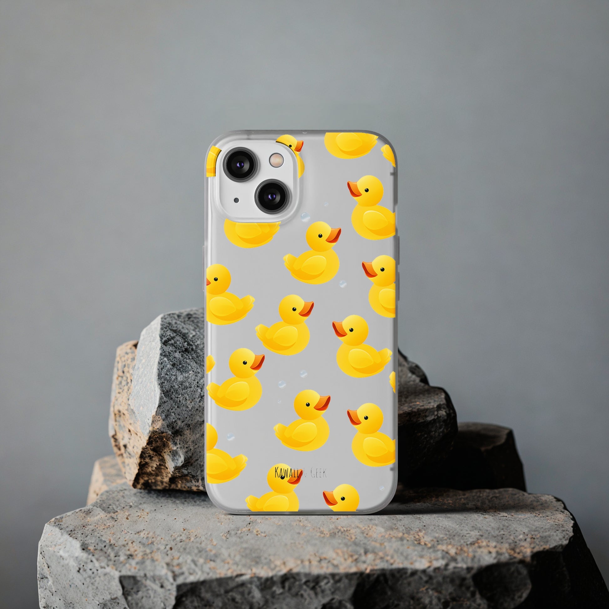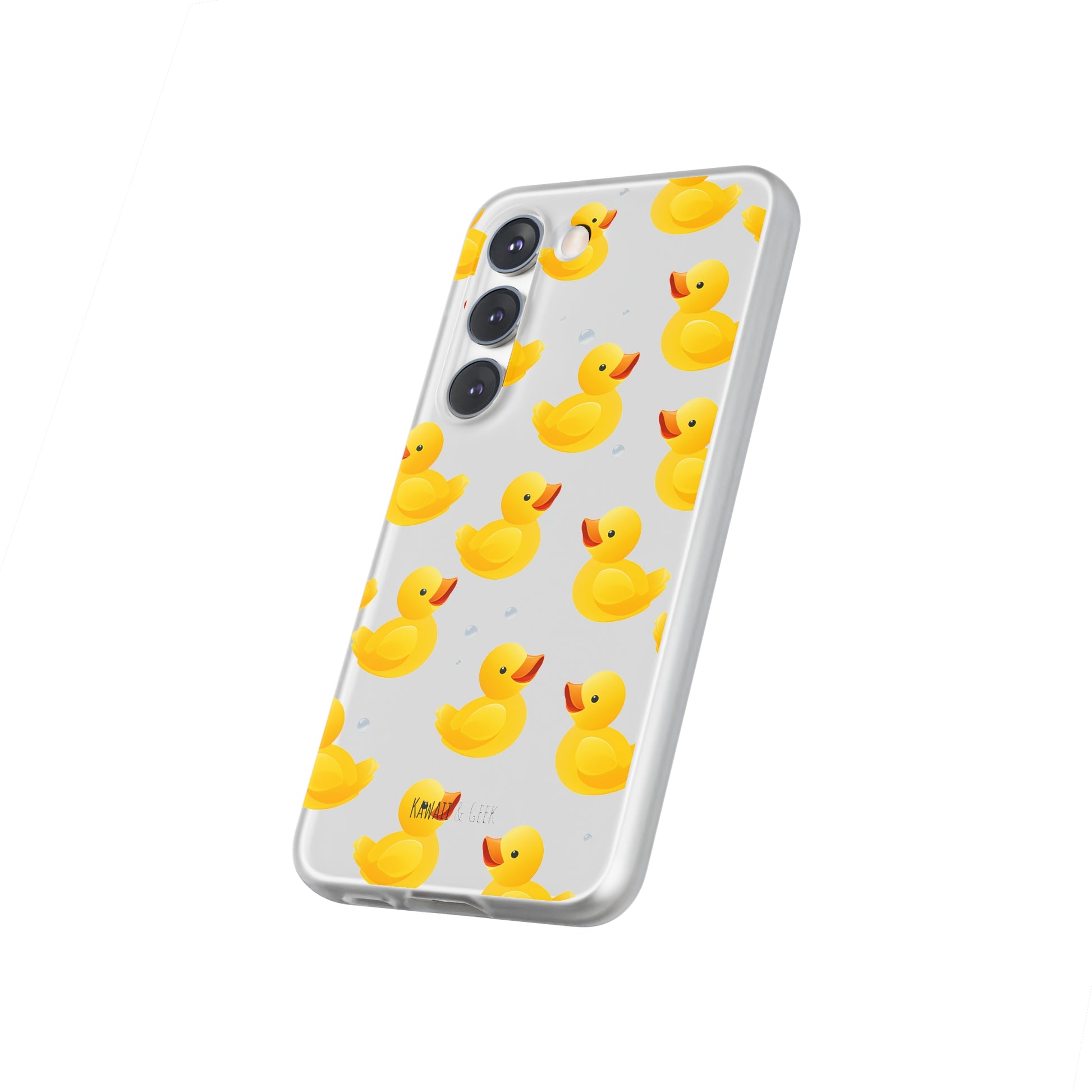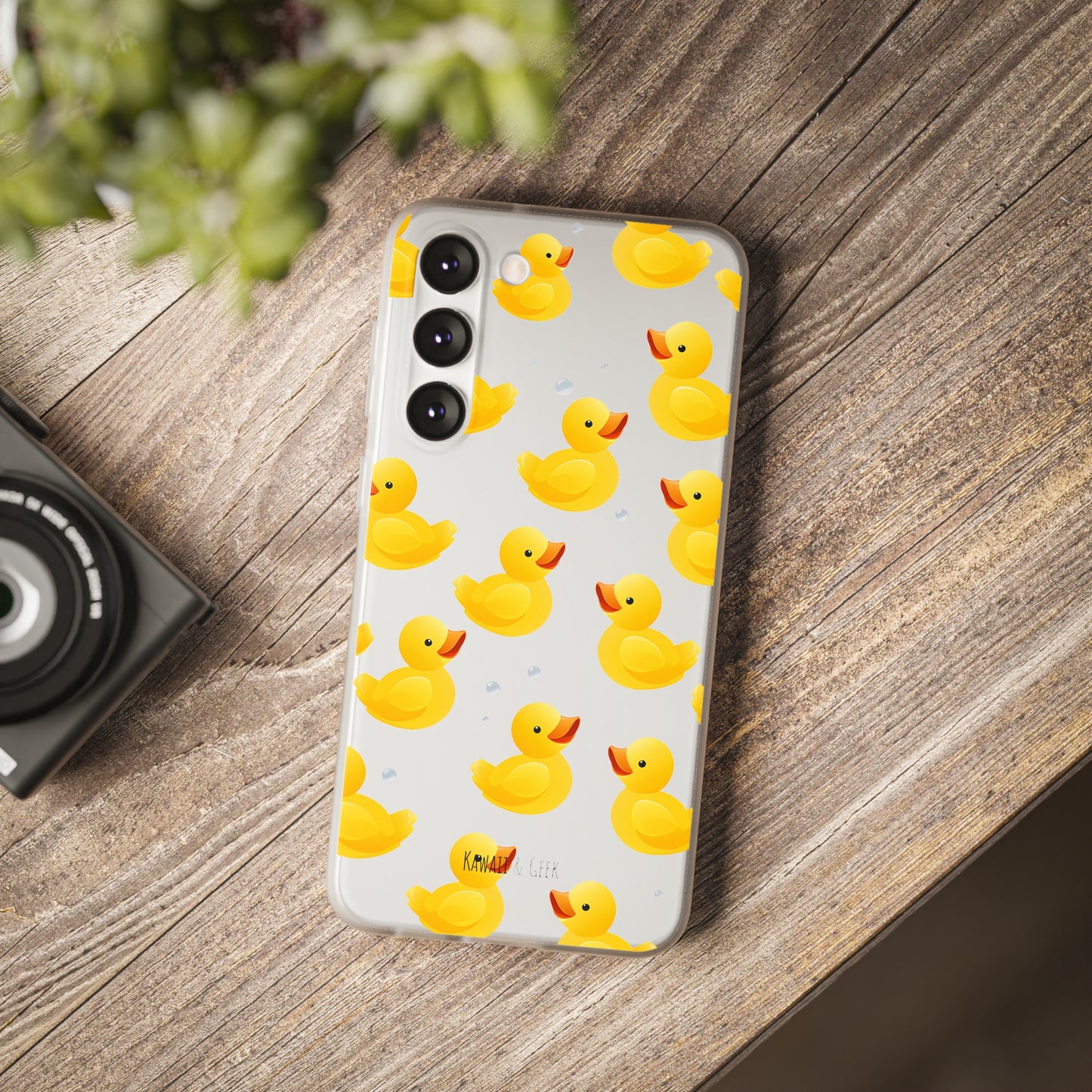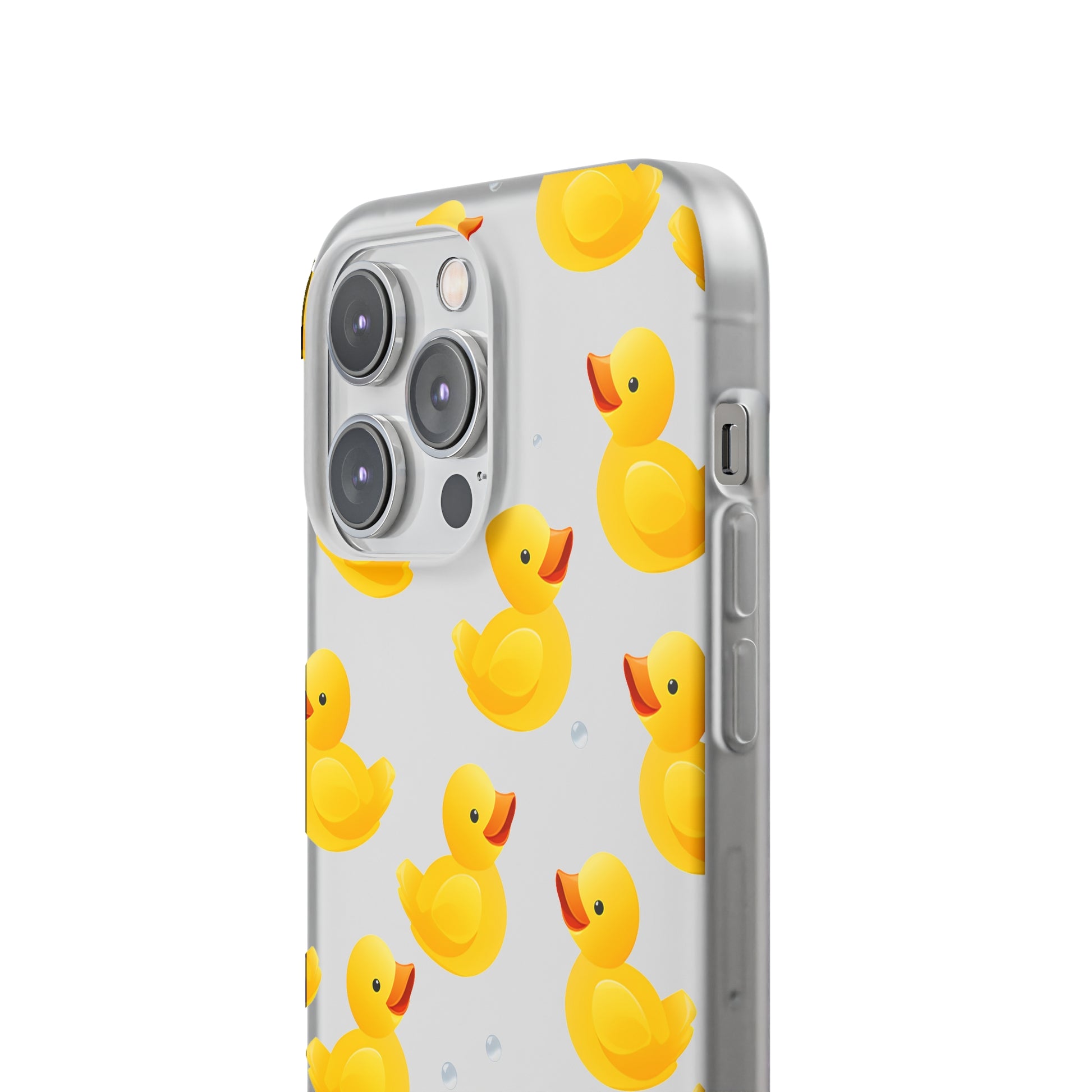 Keywords: Yellow duck case, Flexi phone cover, Transparent case, Playful design, Childhood nostalgia, Iconic ducks, Quirky style, Duck pattern, Premium protection, Retro vibe, Phone accessory, Classic design, Fun phone case.