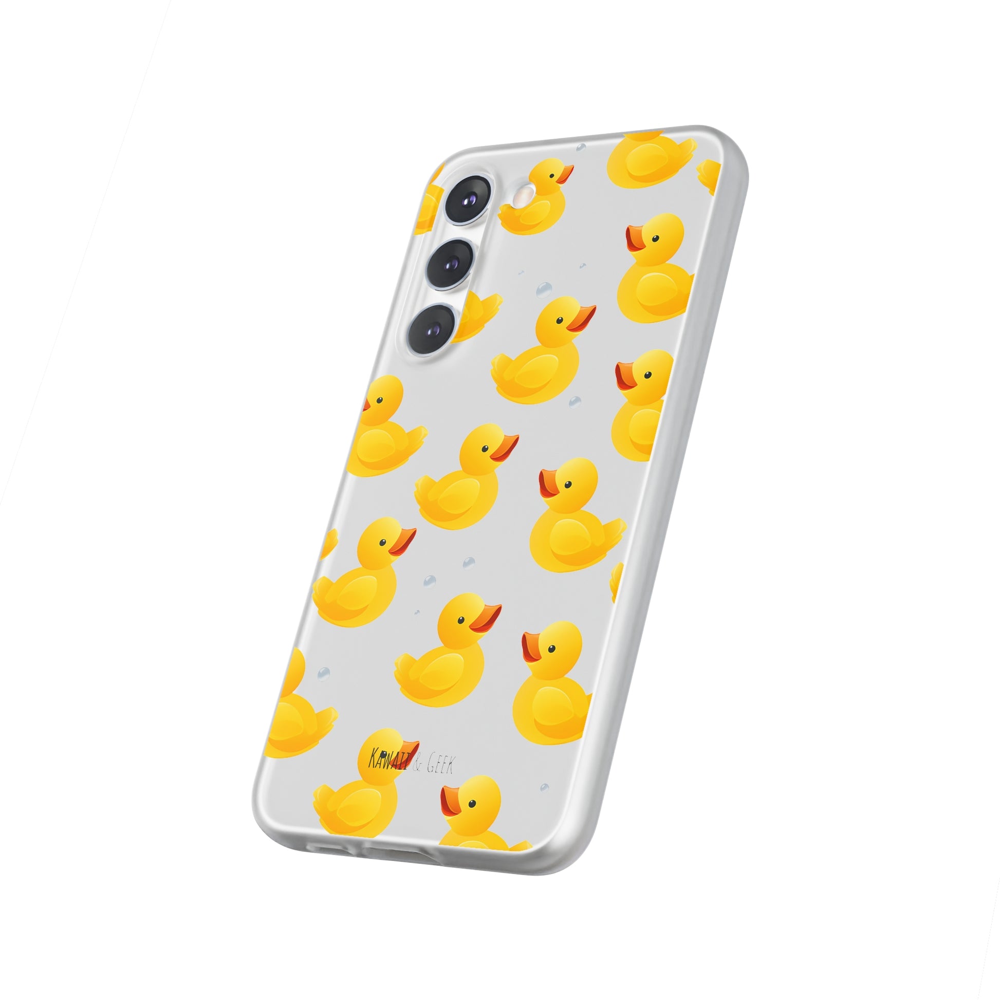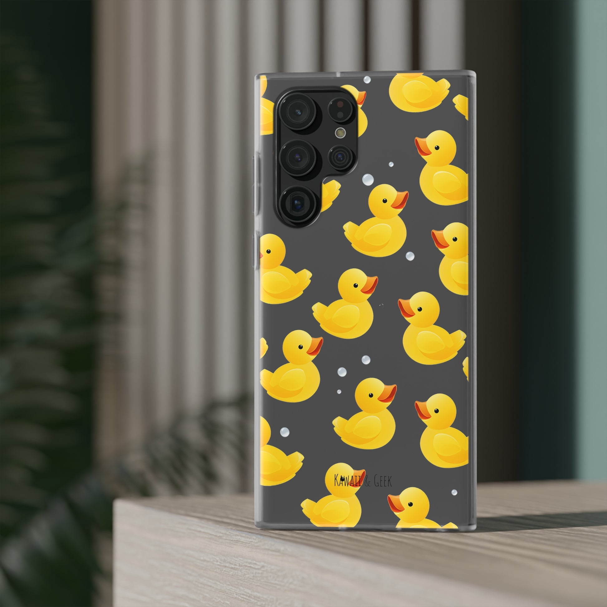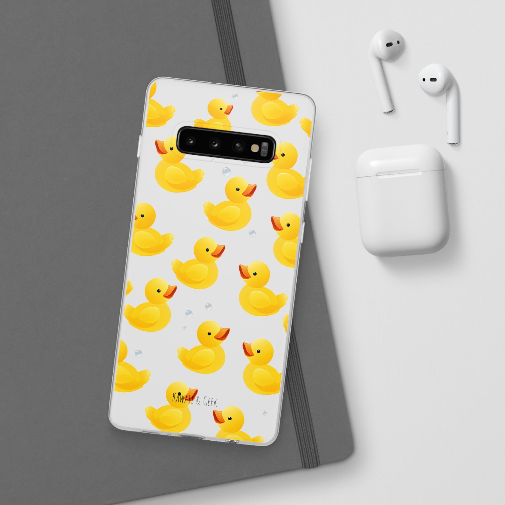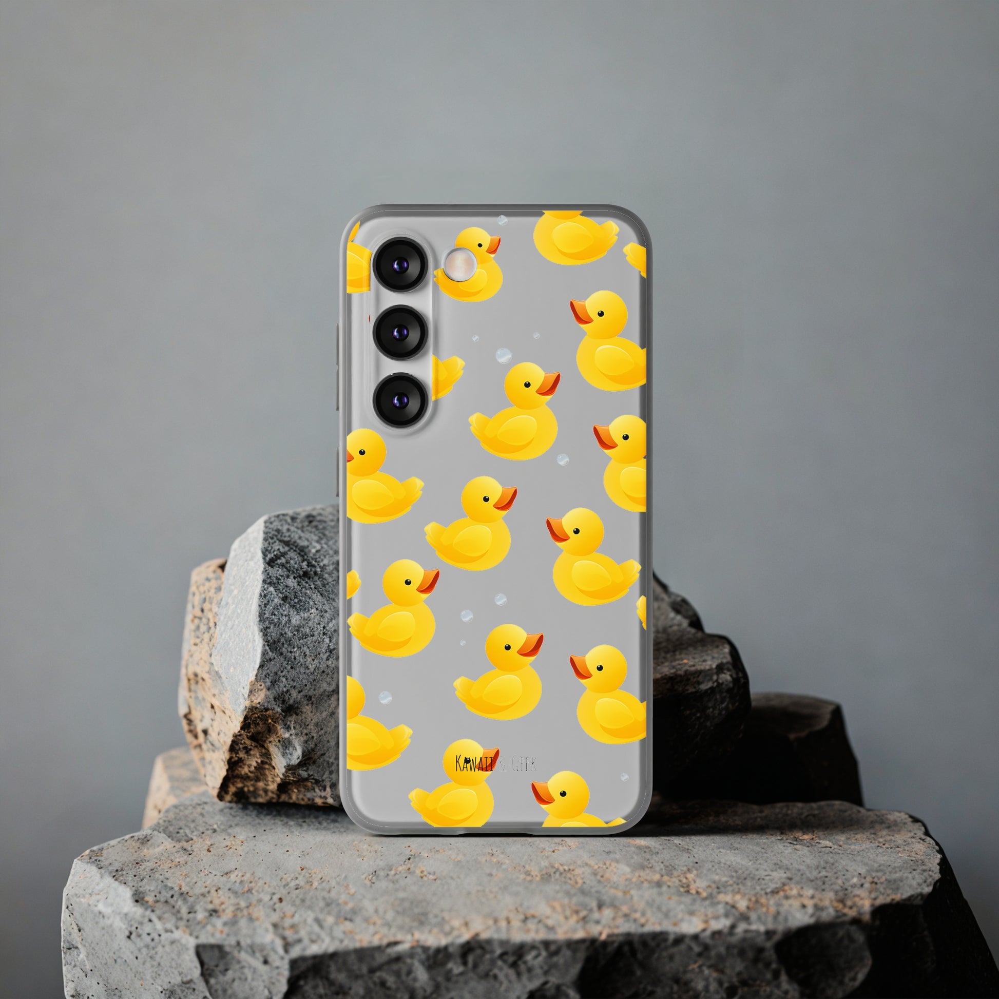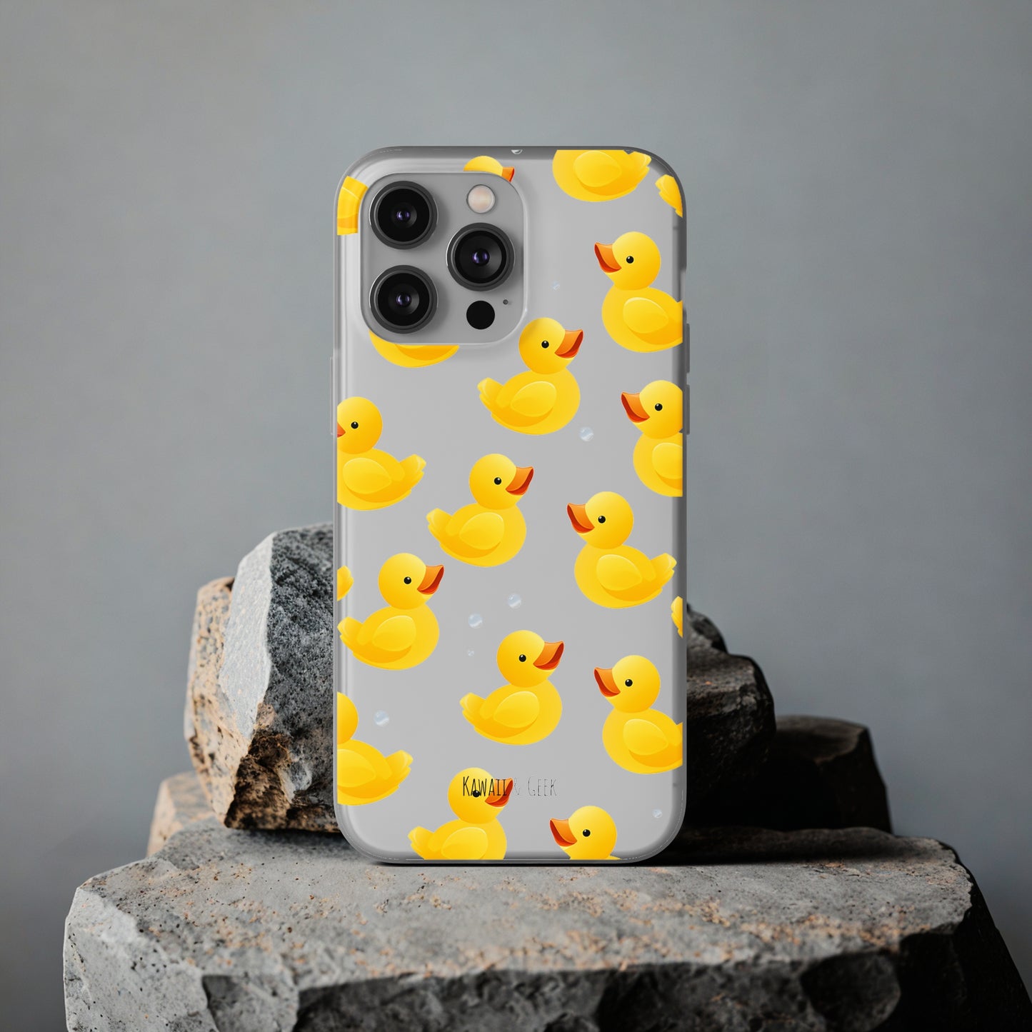 Keywords: Yellow duck case, Flexi phone cover, Transparent case, Playful design, Childhood nostalgia, Iconic ducks, Quirky style, Duck pattern, Premium protection, Retro vibe, Phone accessory, Classic design, Fun phone case.