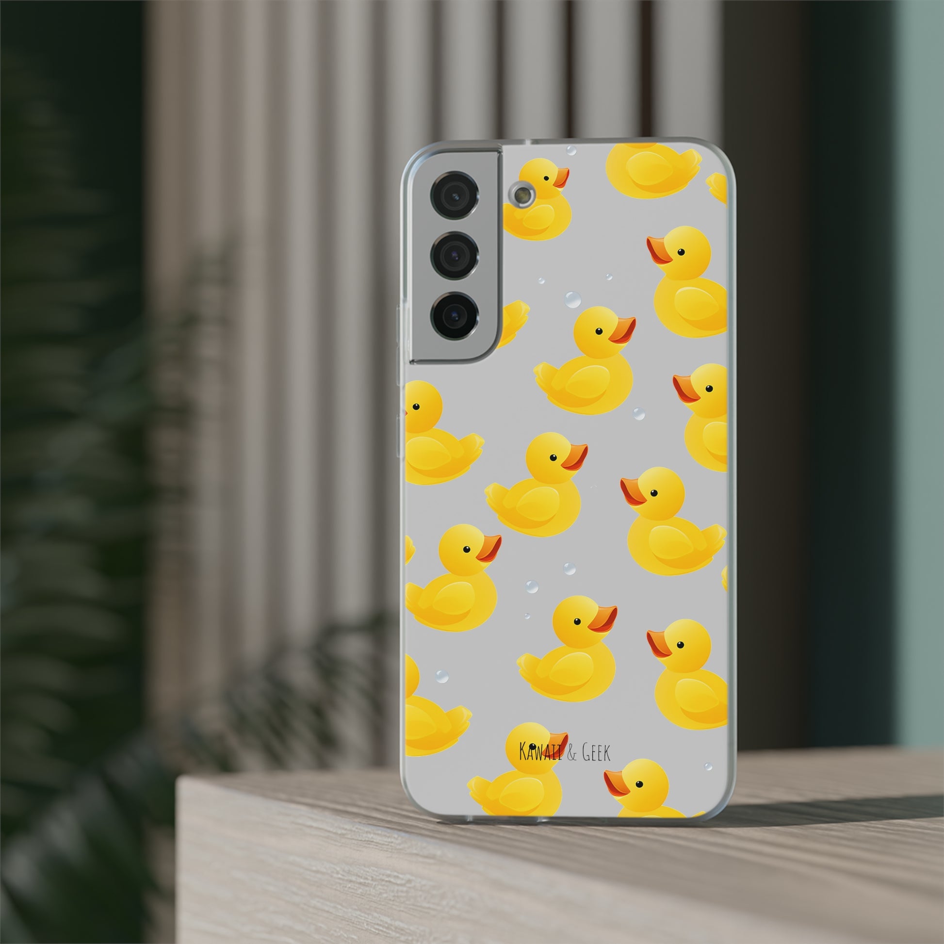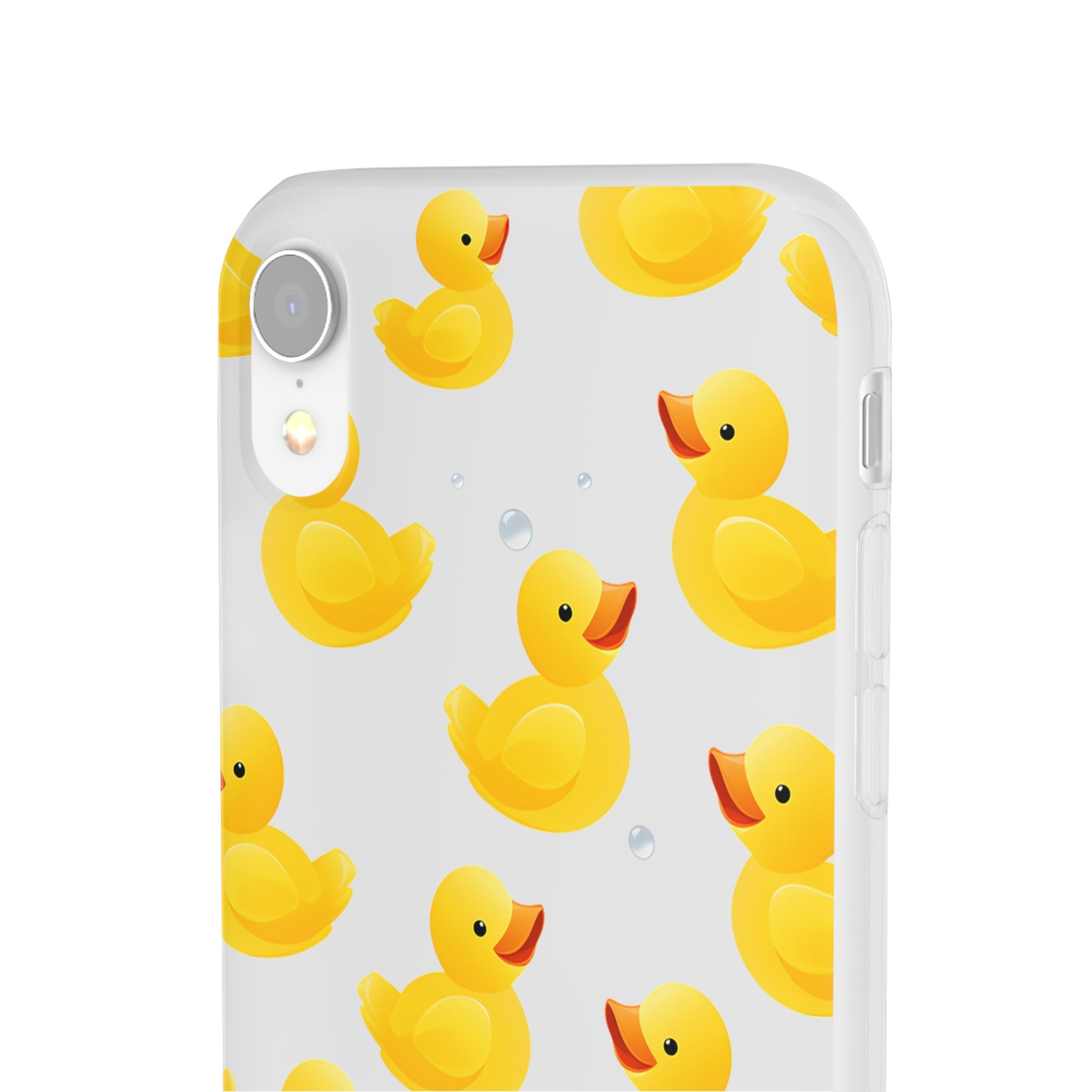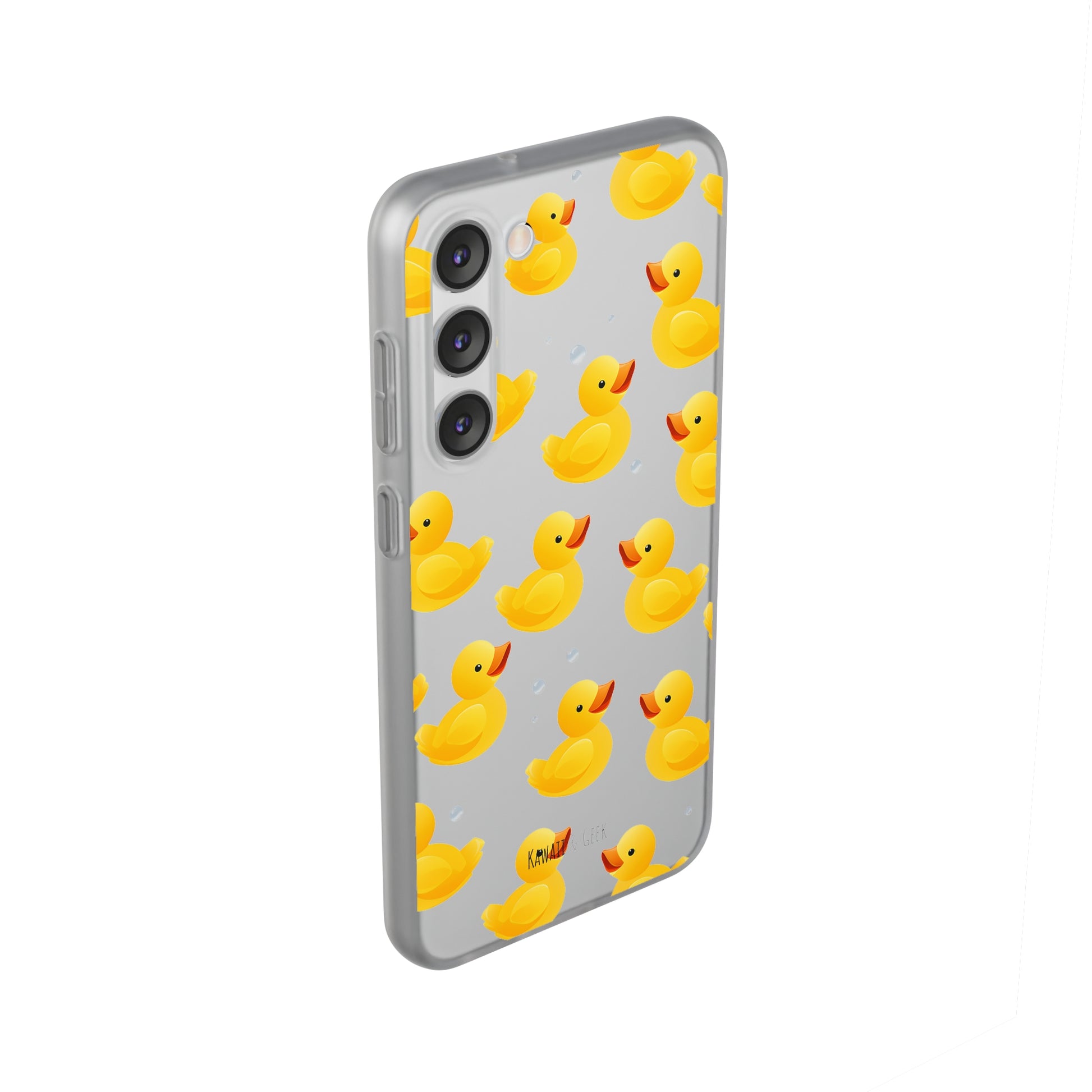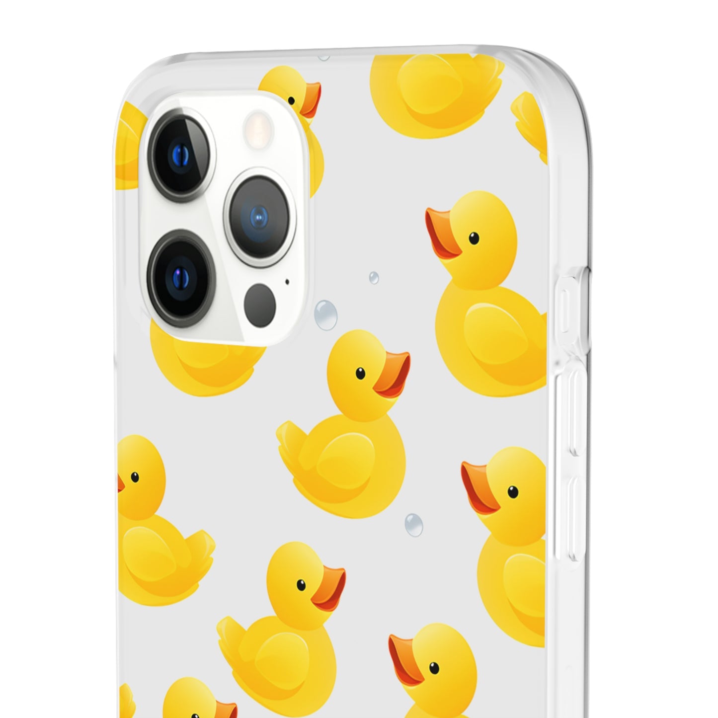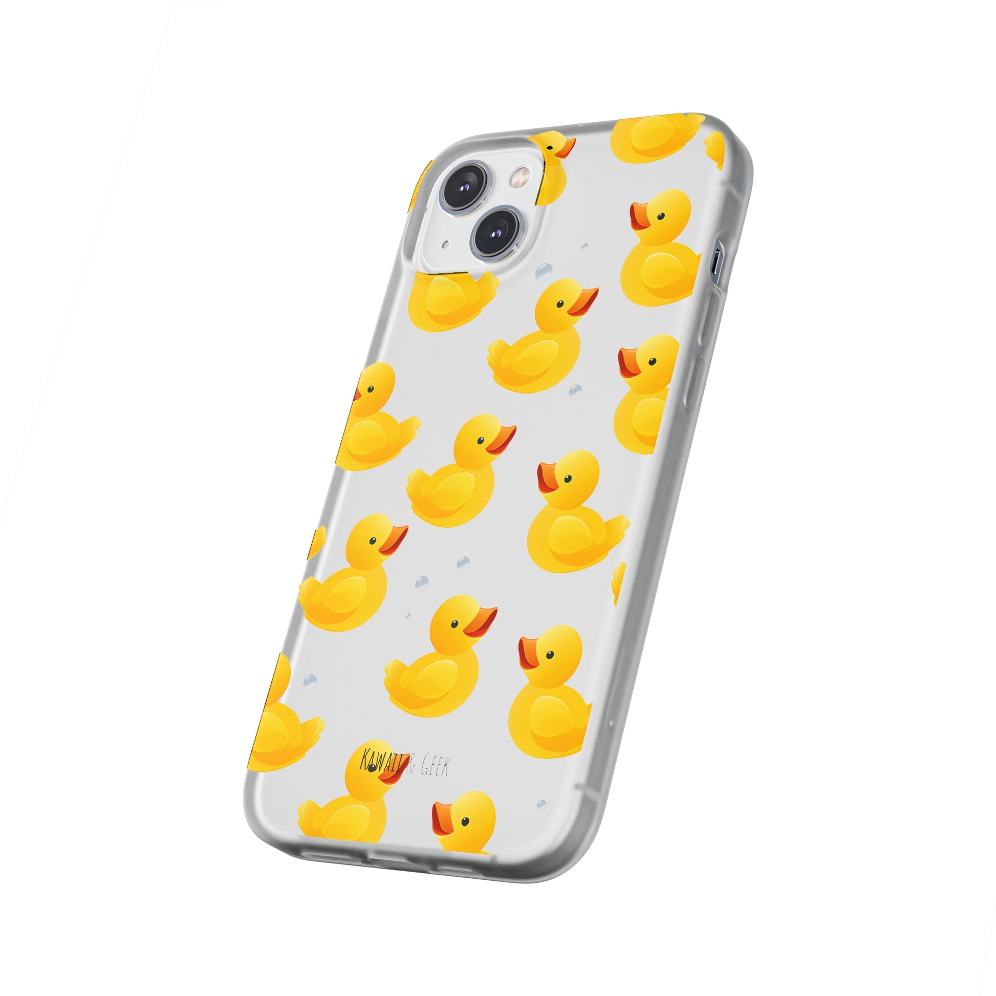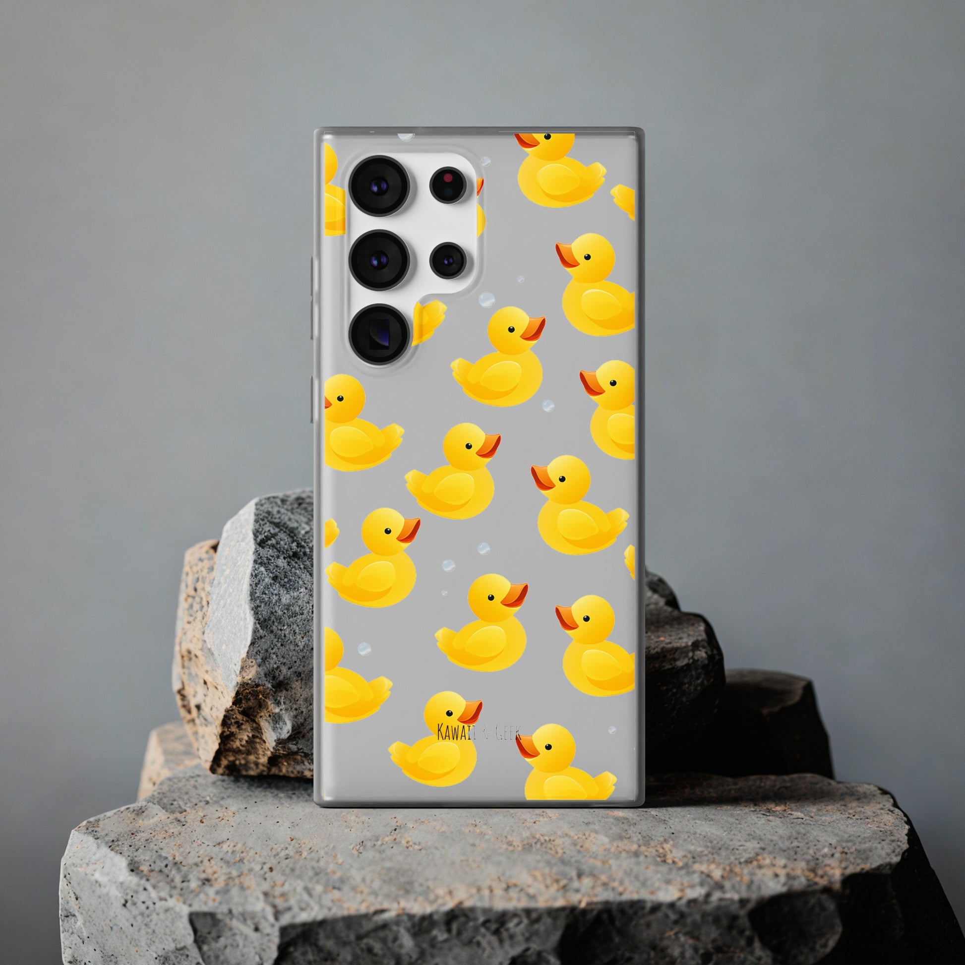 Keywords: Yellow duck case, Flexi phone cover, Transparent case, Playful design, Childhood nostalgia, Iconic ducks, Quirky style, Duck pattern, Premium protection, Retro vibe, Phone accessory, Classic design, Fun phone case.