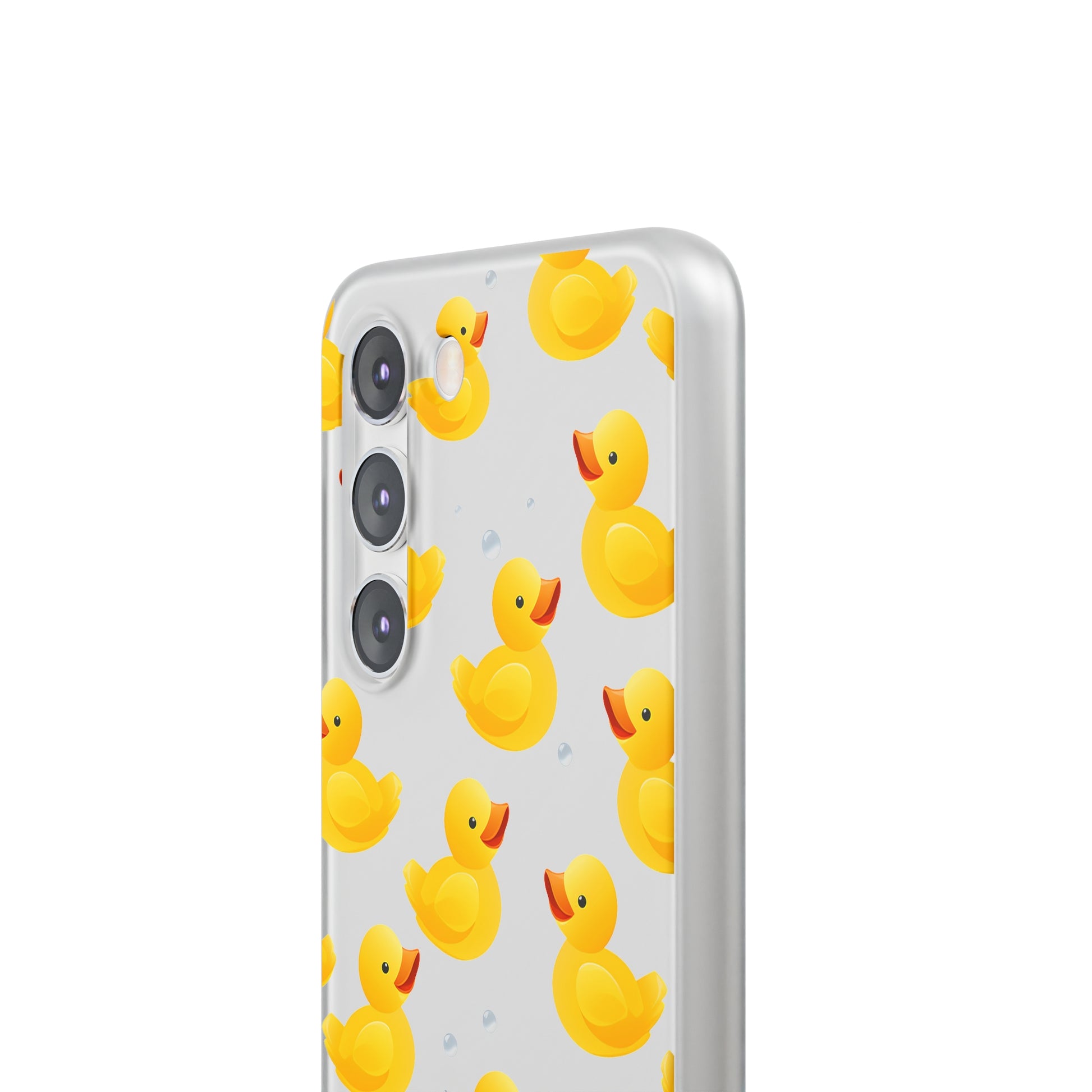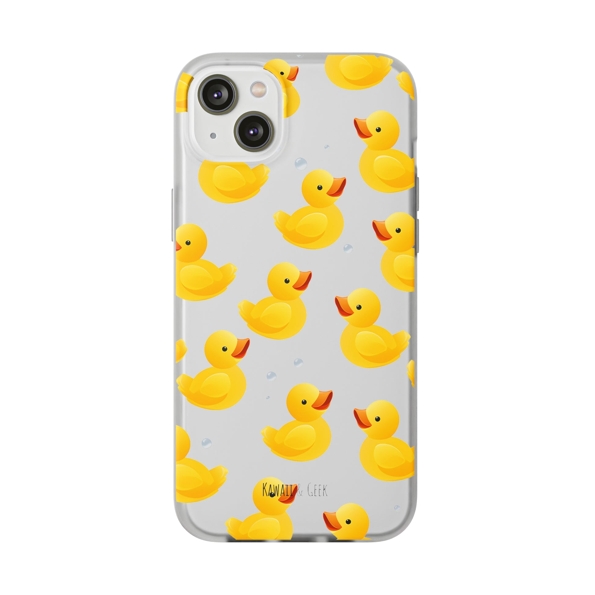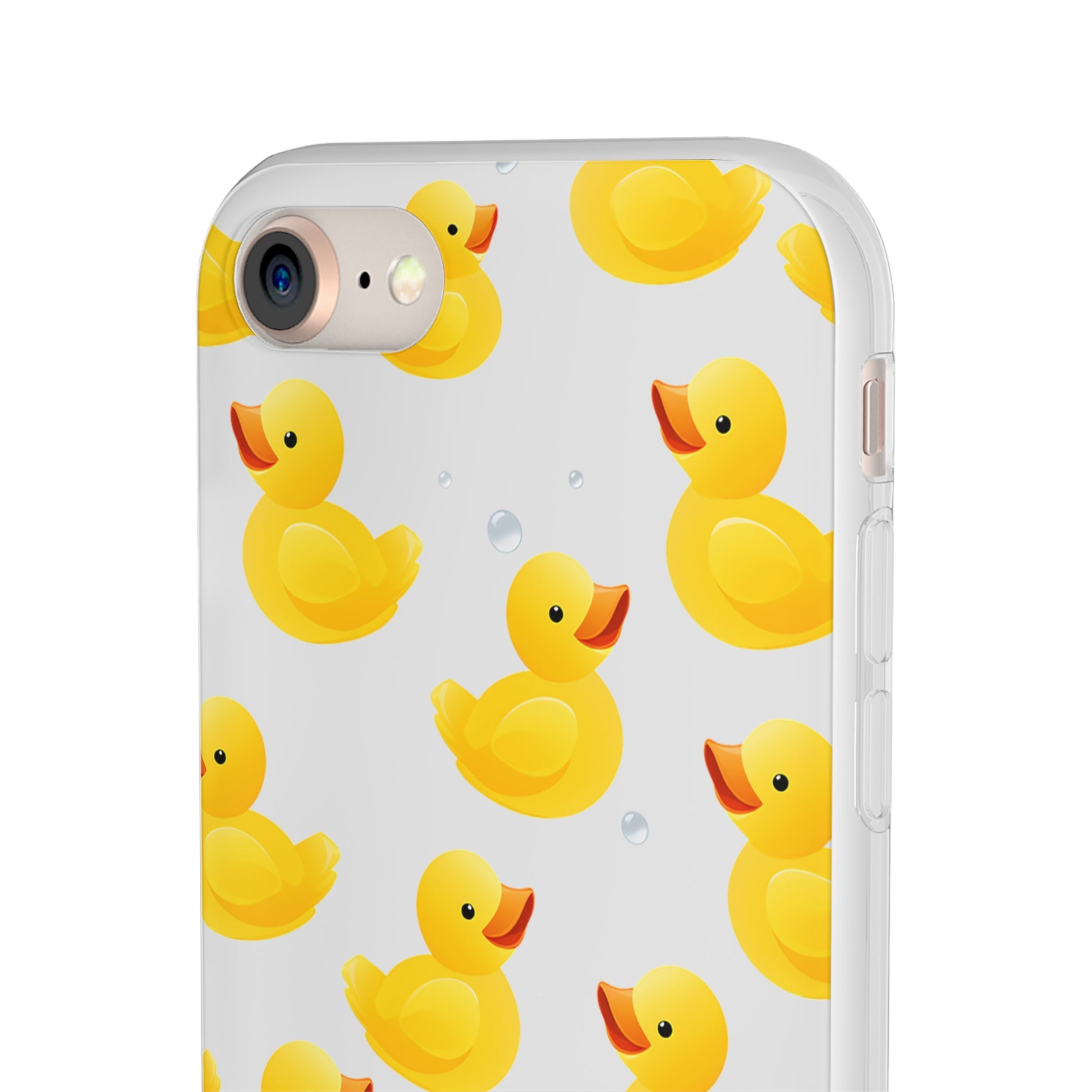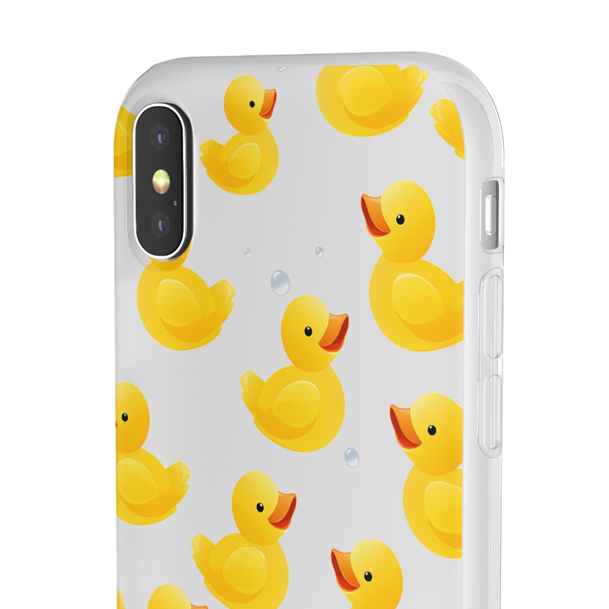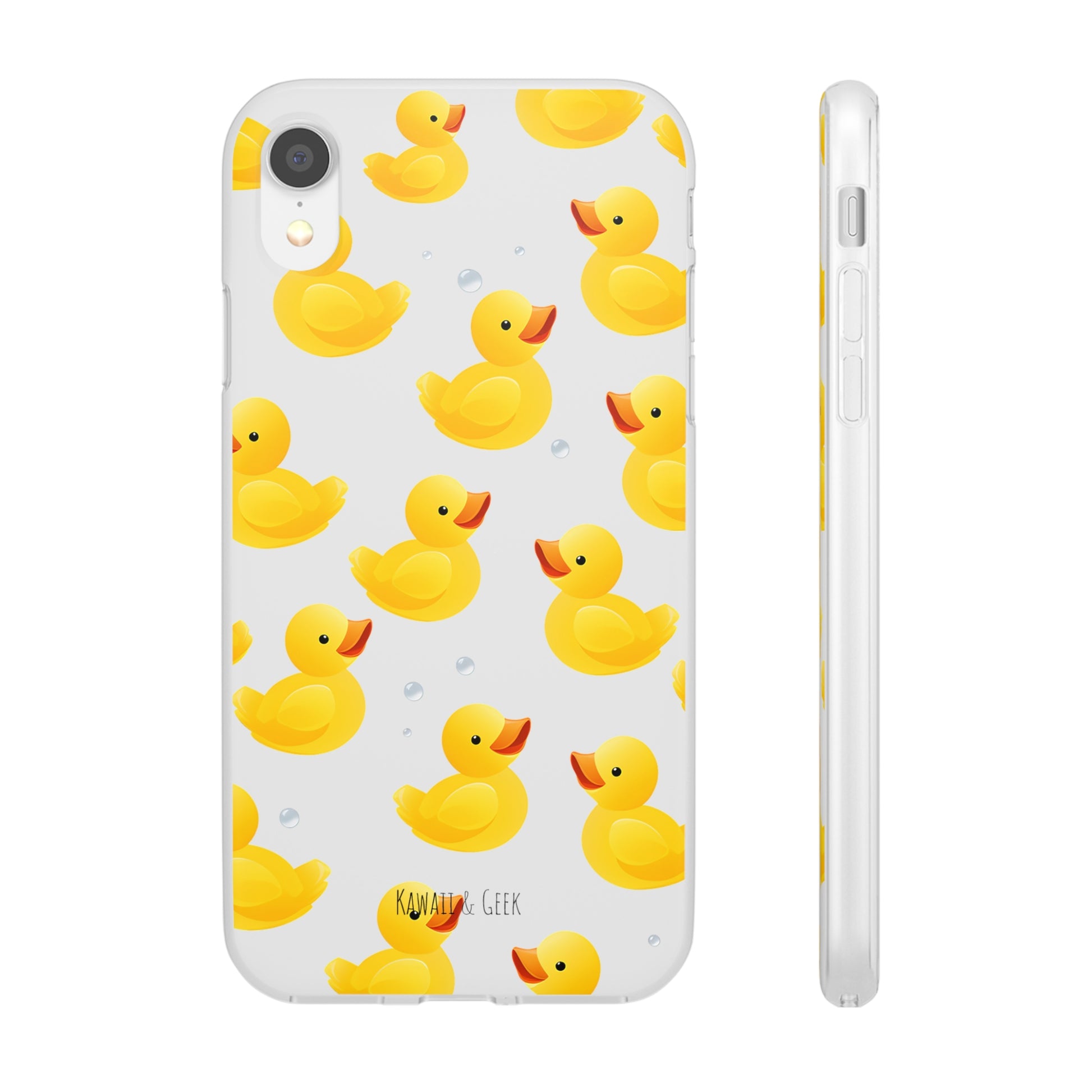 Keywords: Yellow duck case, Flexi phone cover, Transparent case, Playful design, Childhood nostalgia, Iconic ducks, Quirky style, Duck pattern, Premium protection, Retro vibe, Phone accessory, Classic design, Fun phone case.