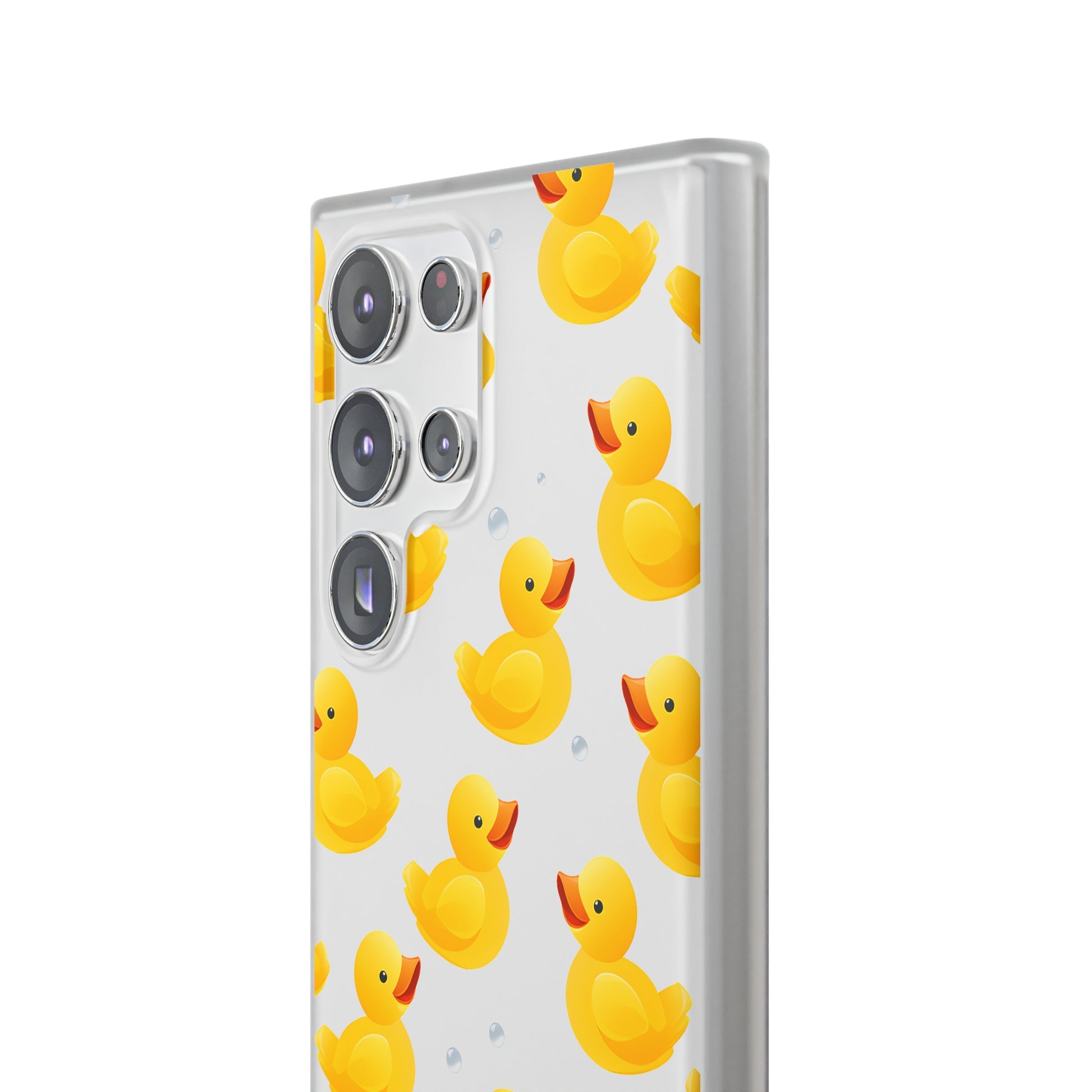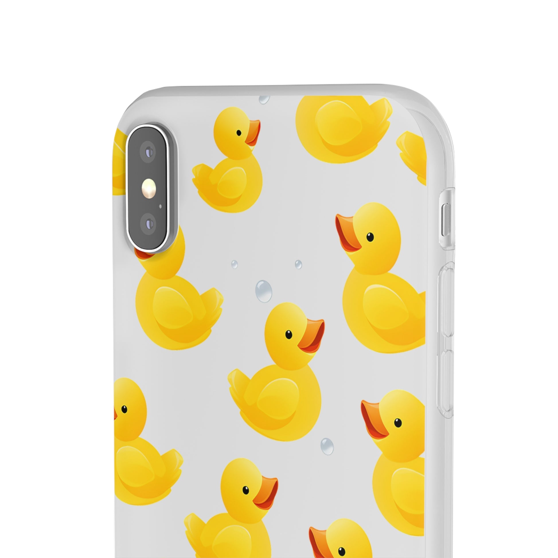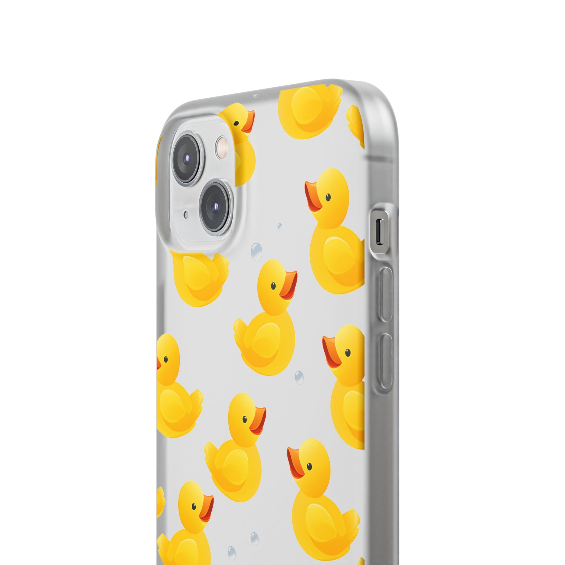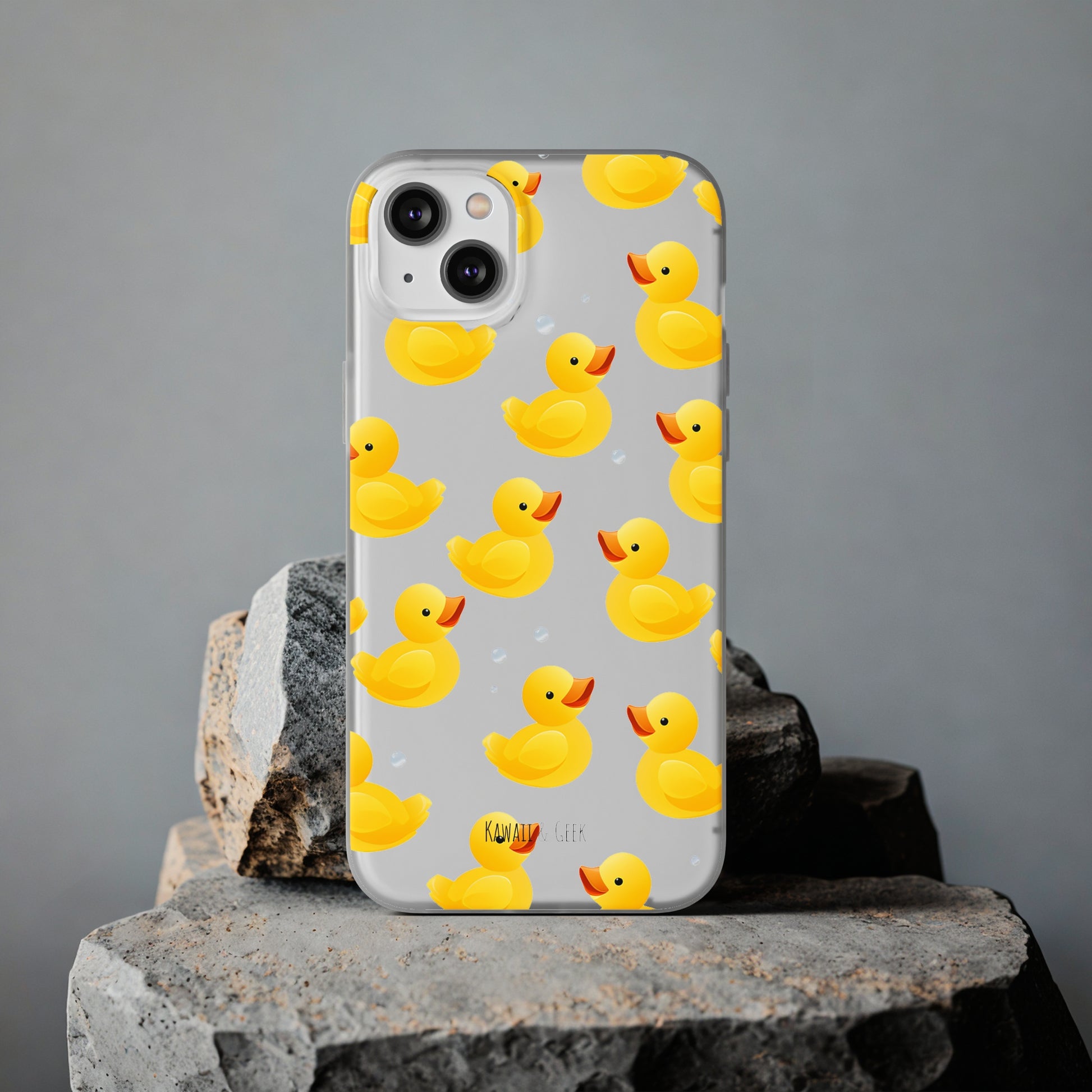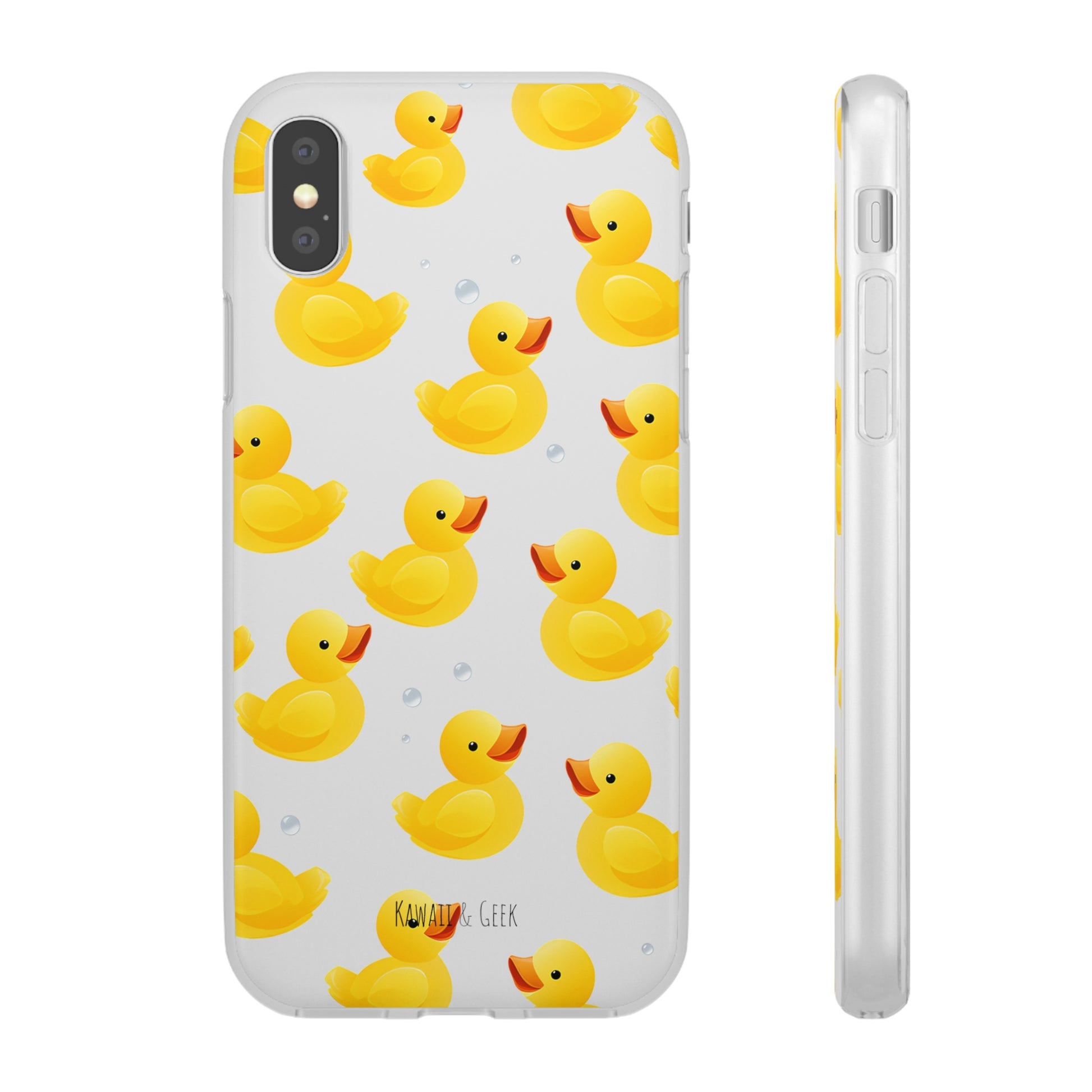 Keywords: Yellow duck case, Flexi phone cover, Transparent case, Playful design, Childhood nostalgia, Iconic ducks, Quirky style, Duck pattern, Premium protection, Retro vibe, Phone accessory, Classic design, Fun phone case.