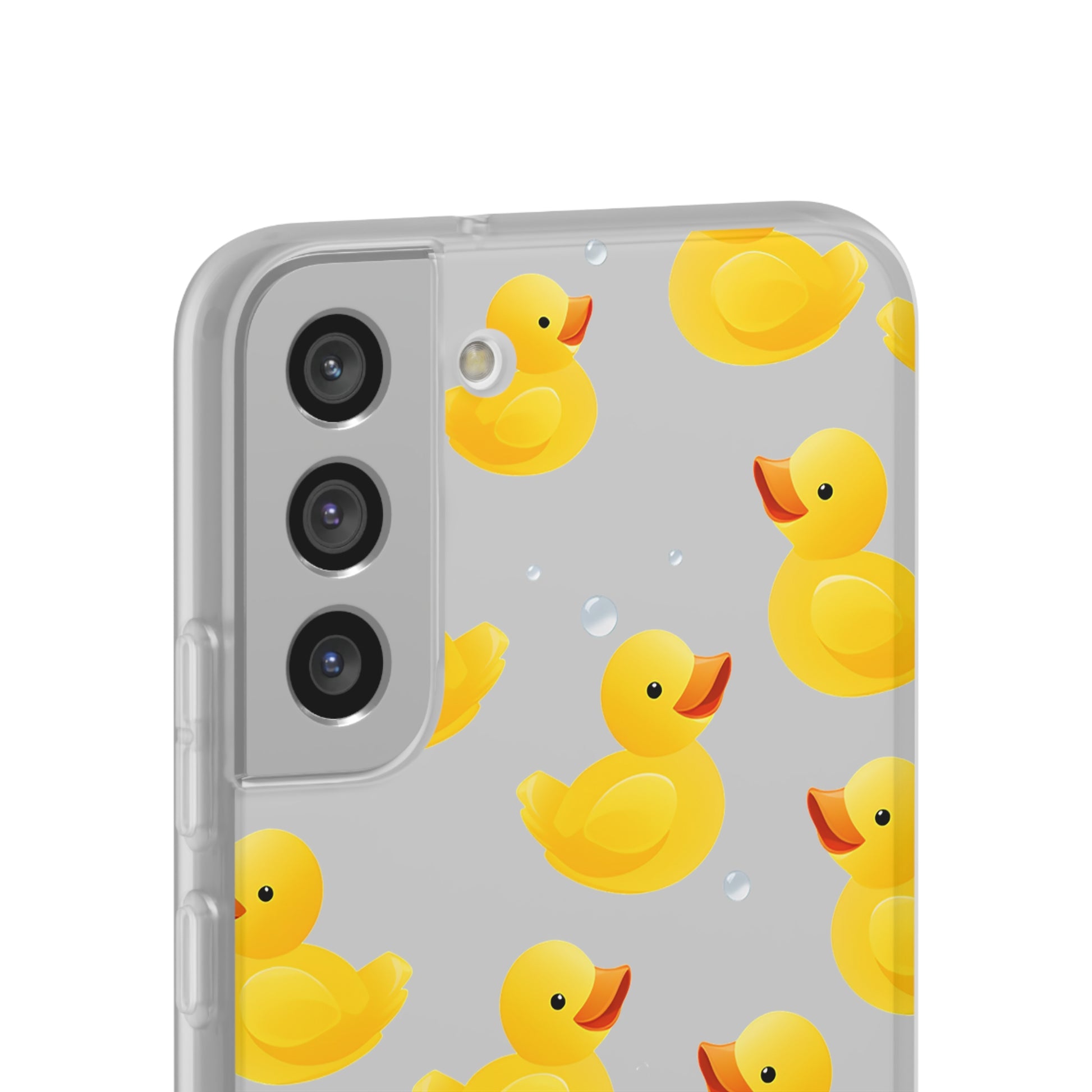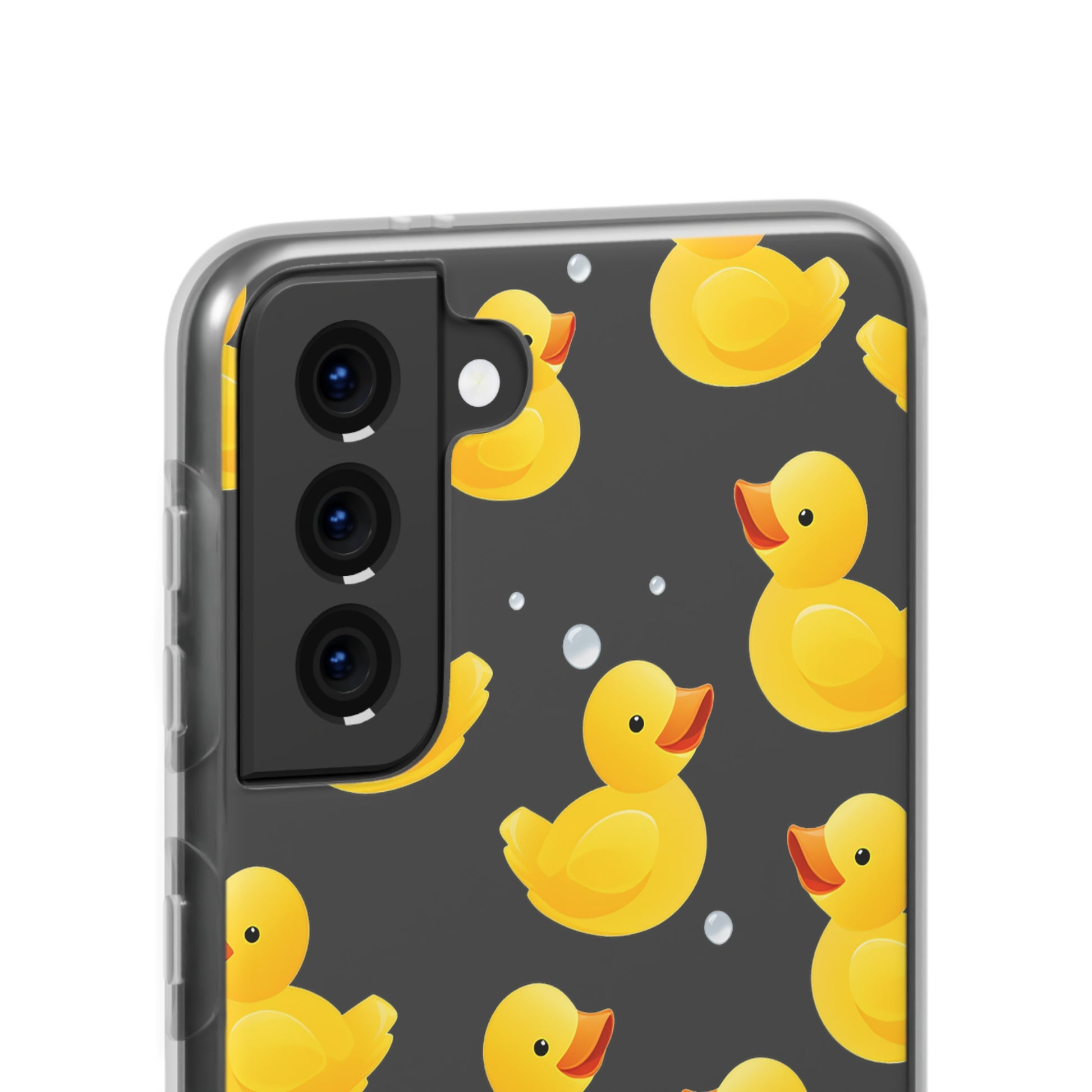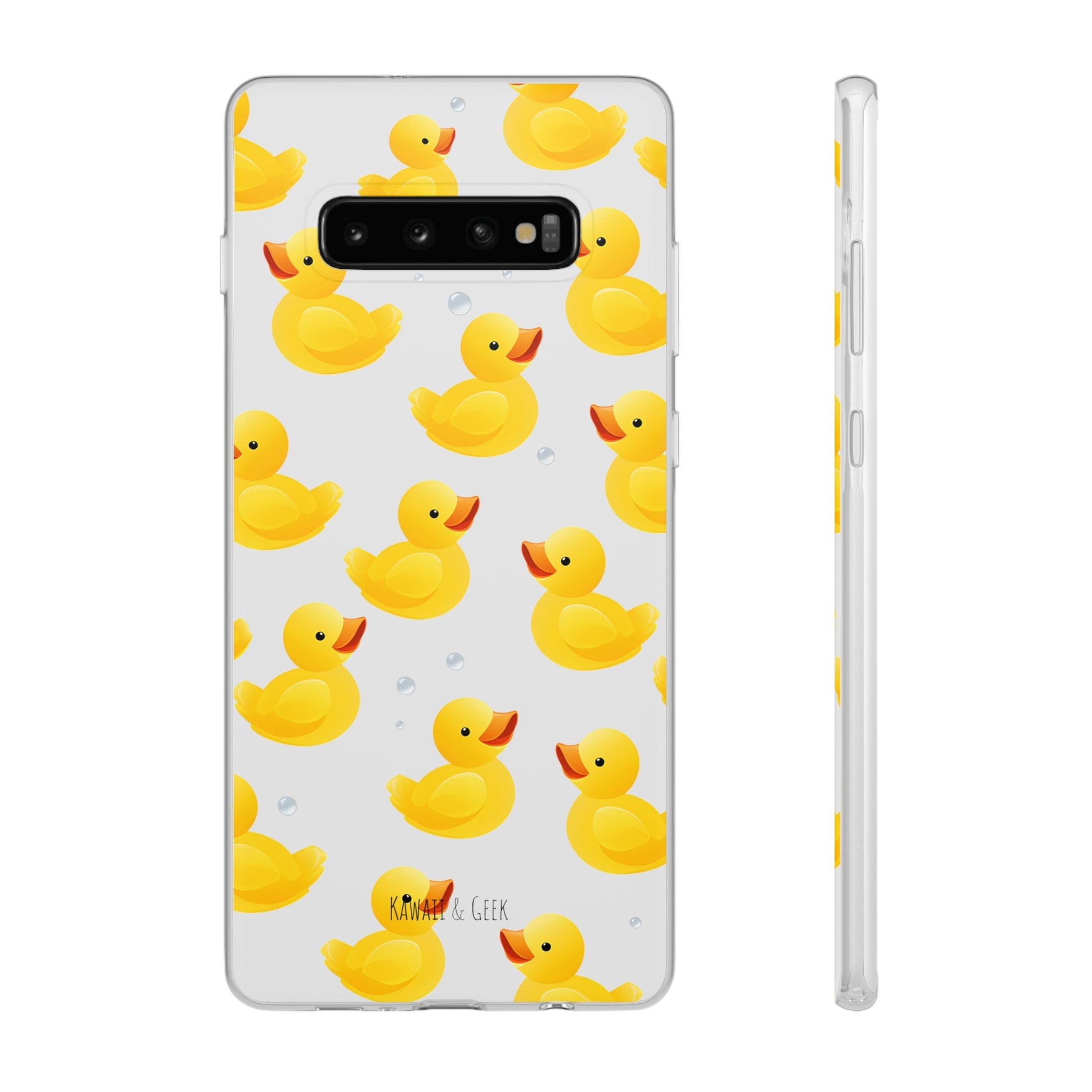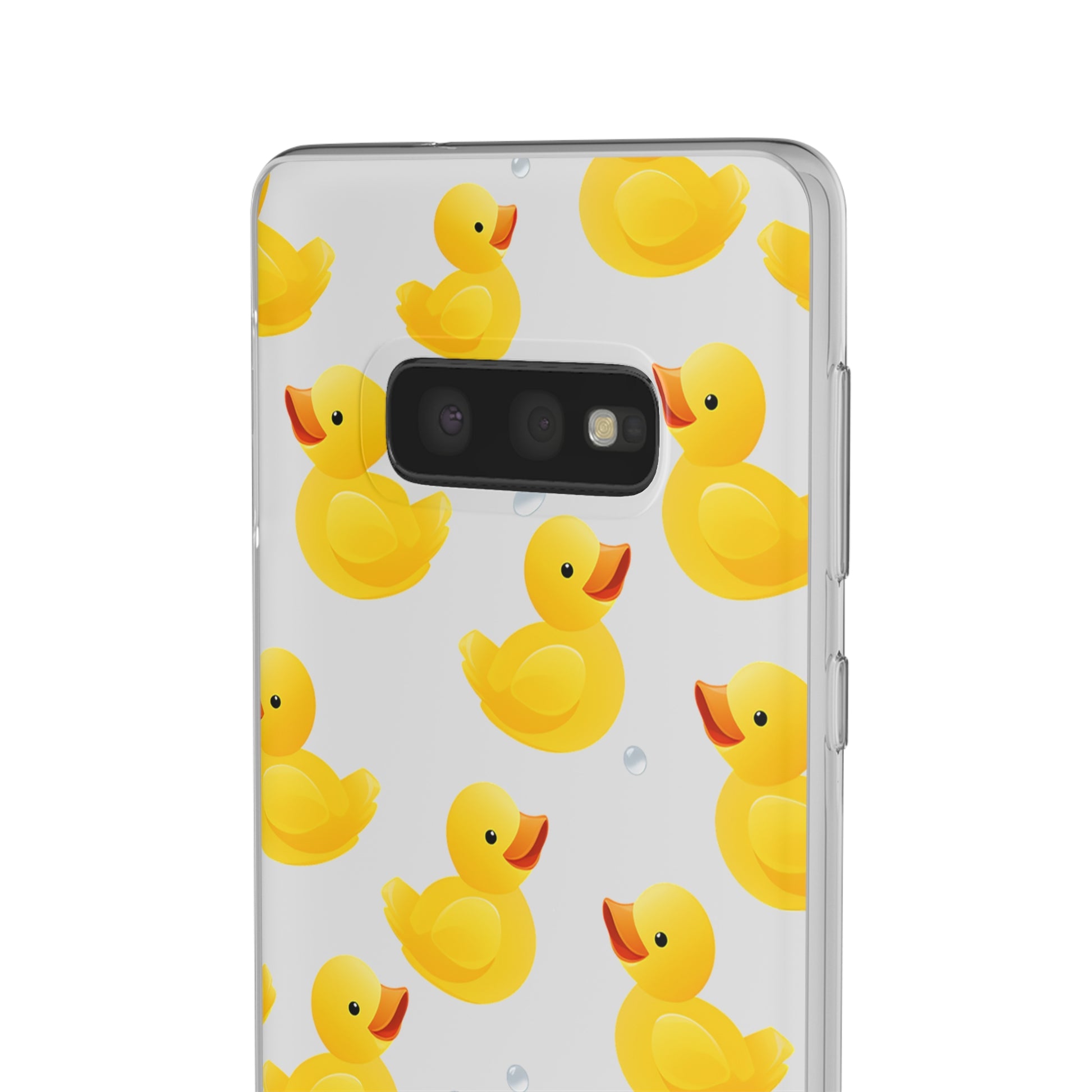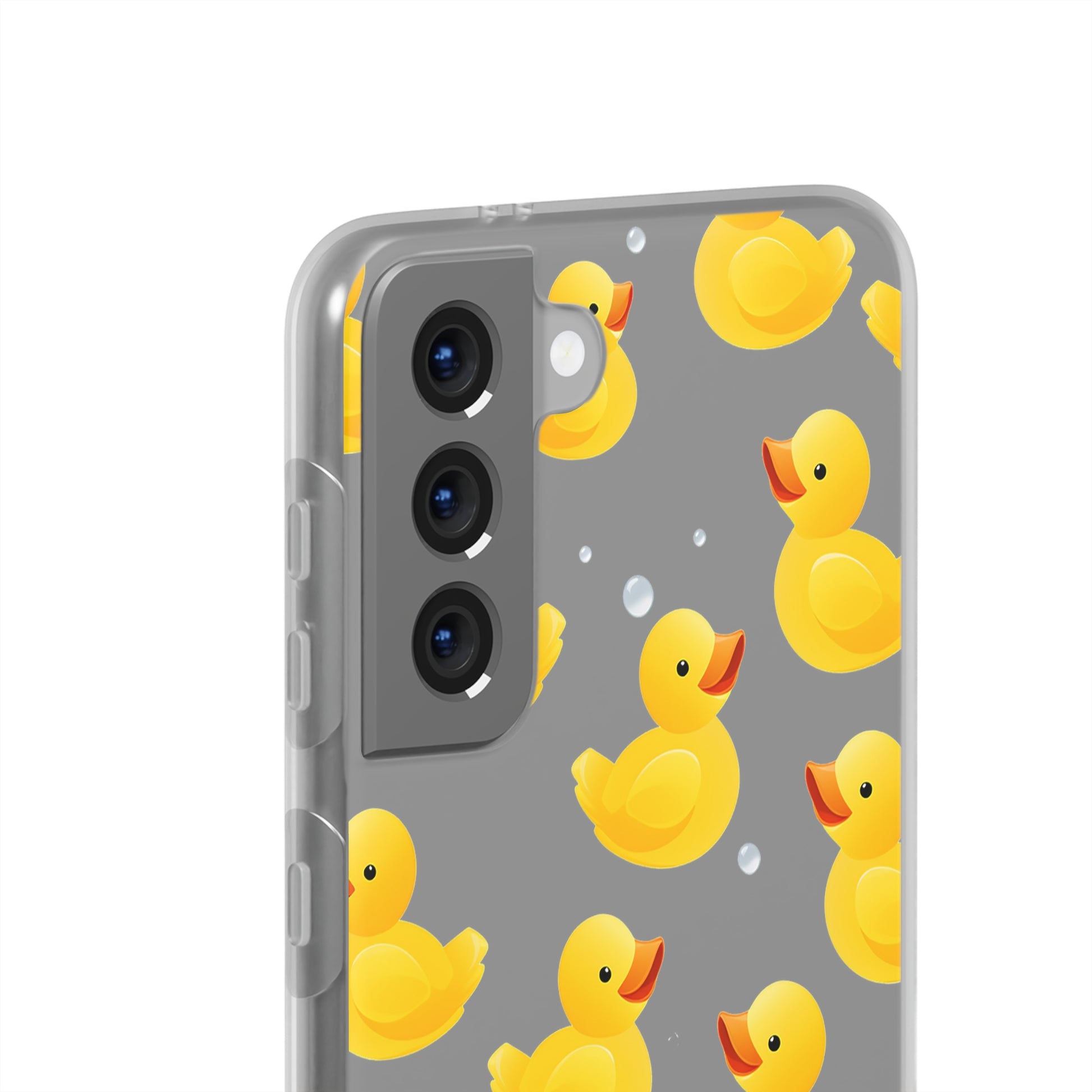 Keywords: Yellow duck case, Flexi phone cover, Transparent case, Playful design, Childhood nostalgia, Iconic ducks, Quirky style, Duck pattern, Premium protection, Retro vibe, Phone accessory, Classic design, Fun phone case.