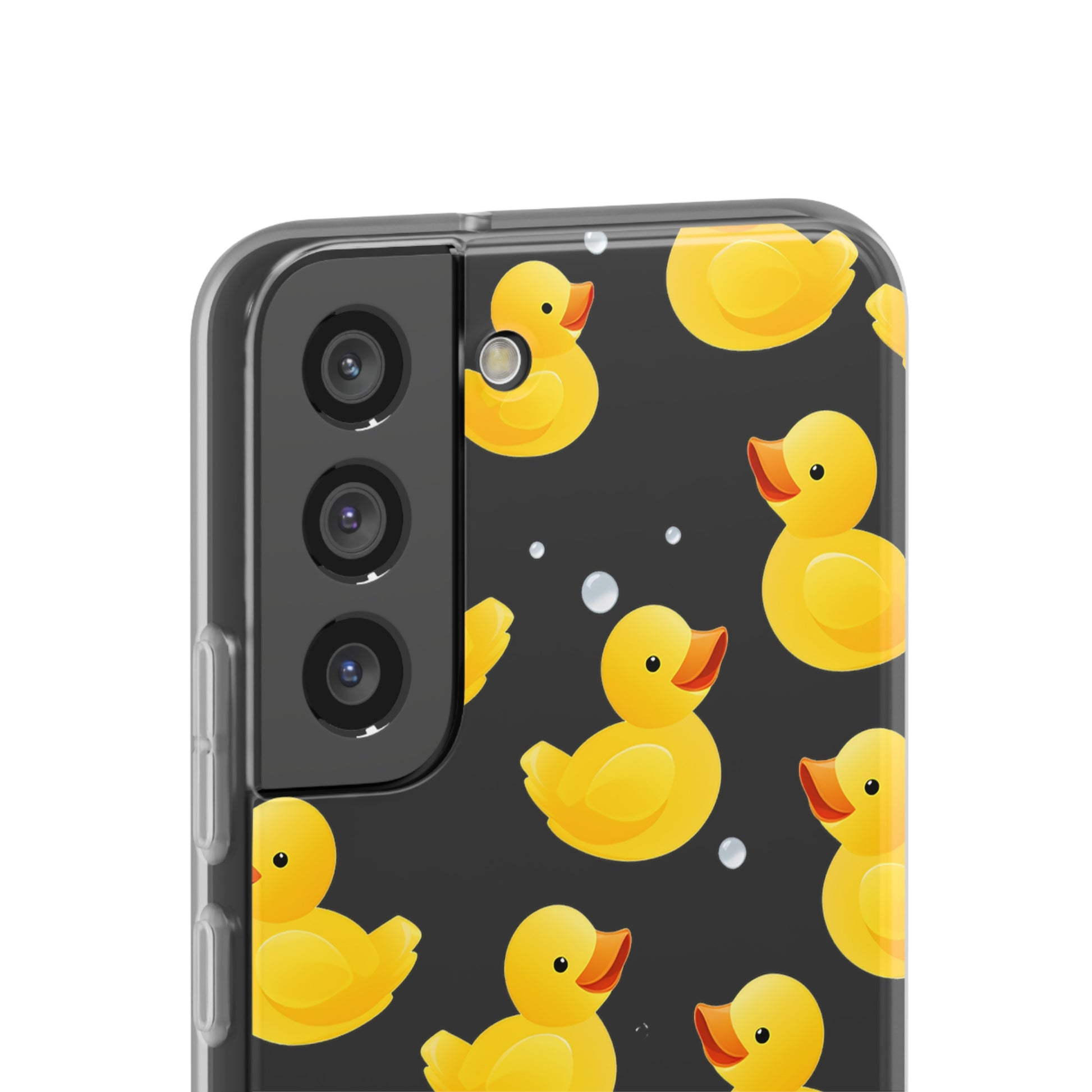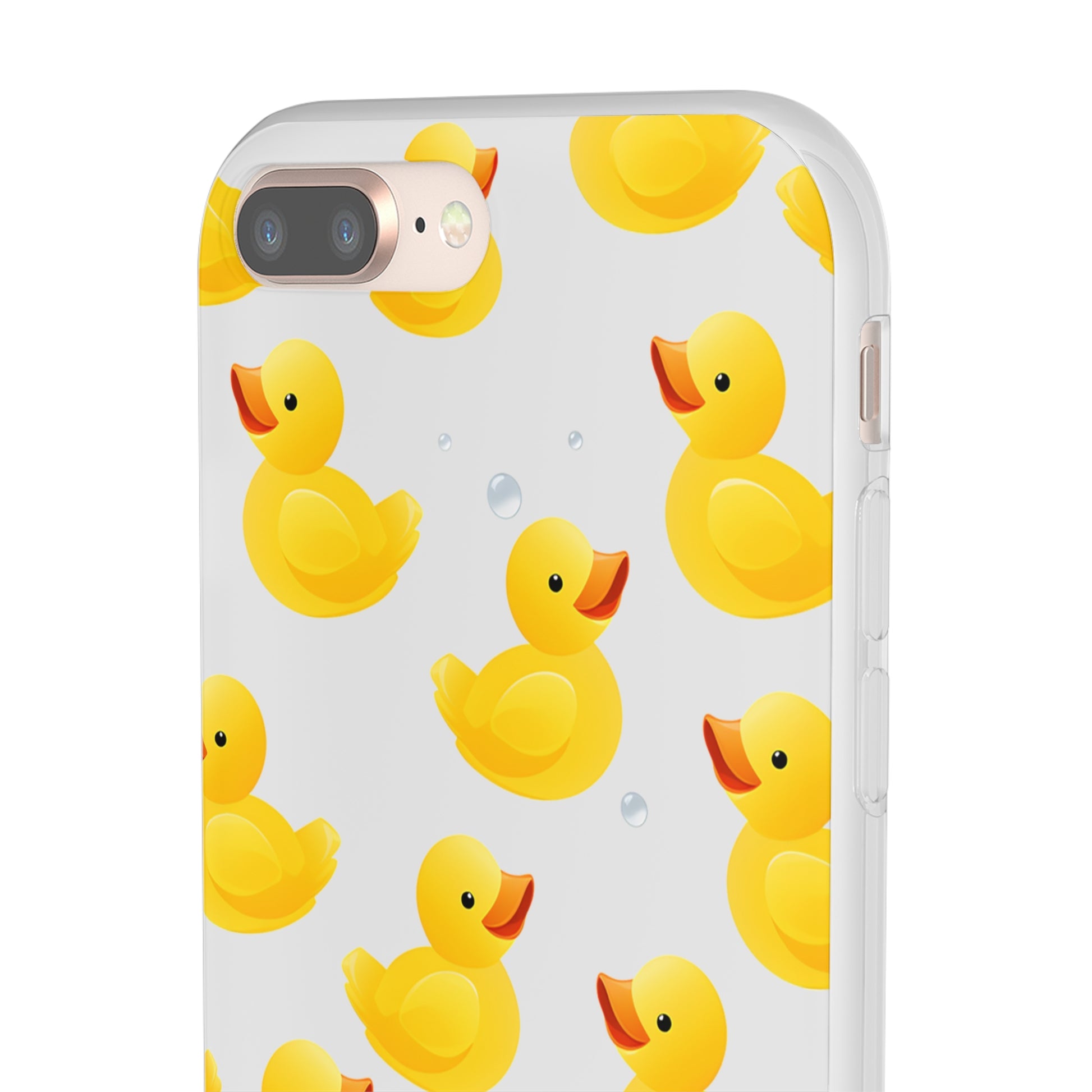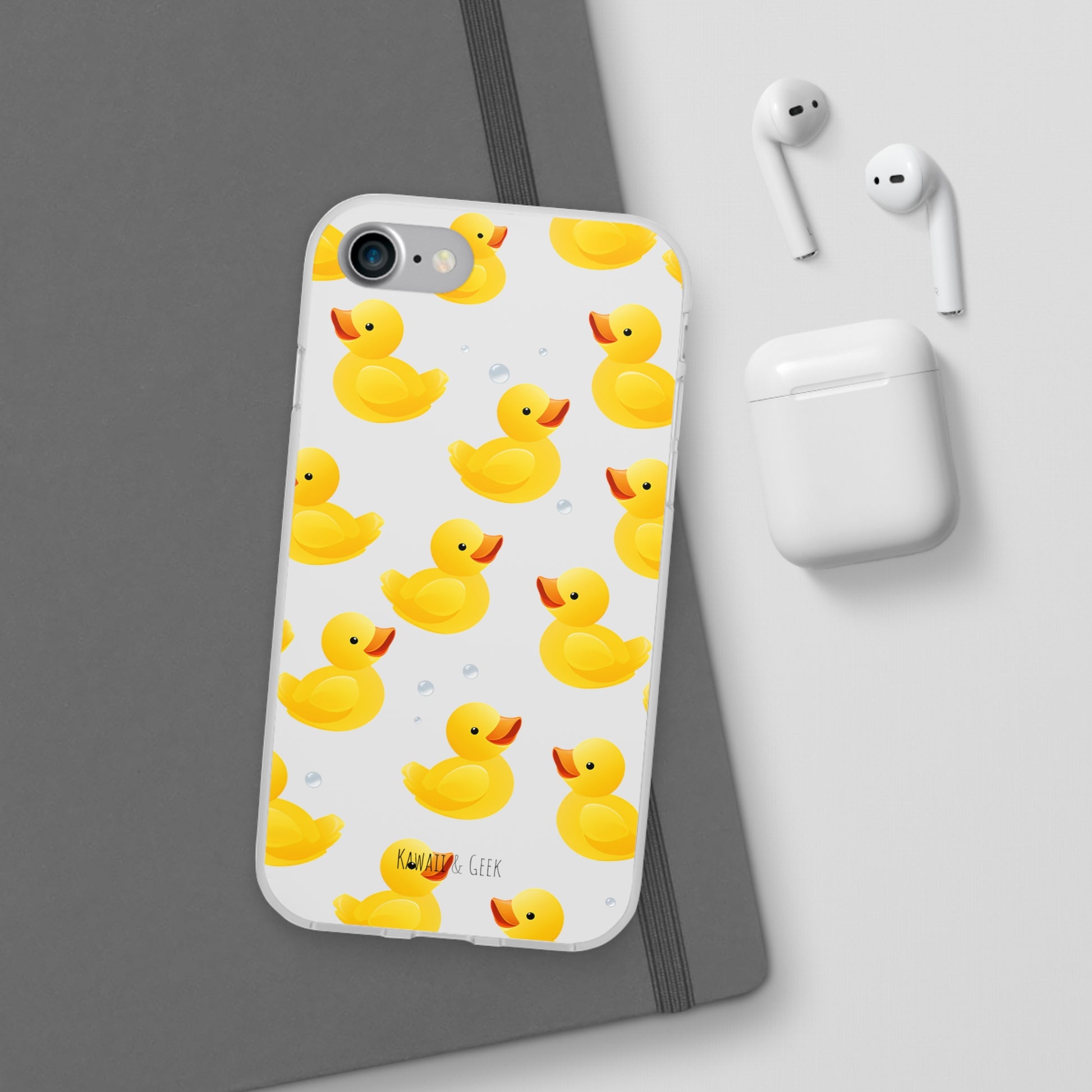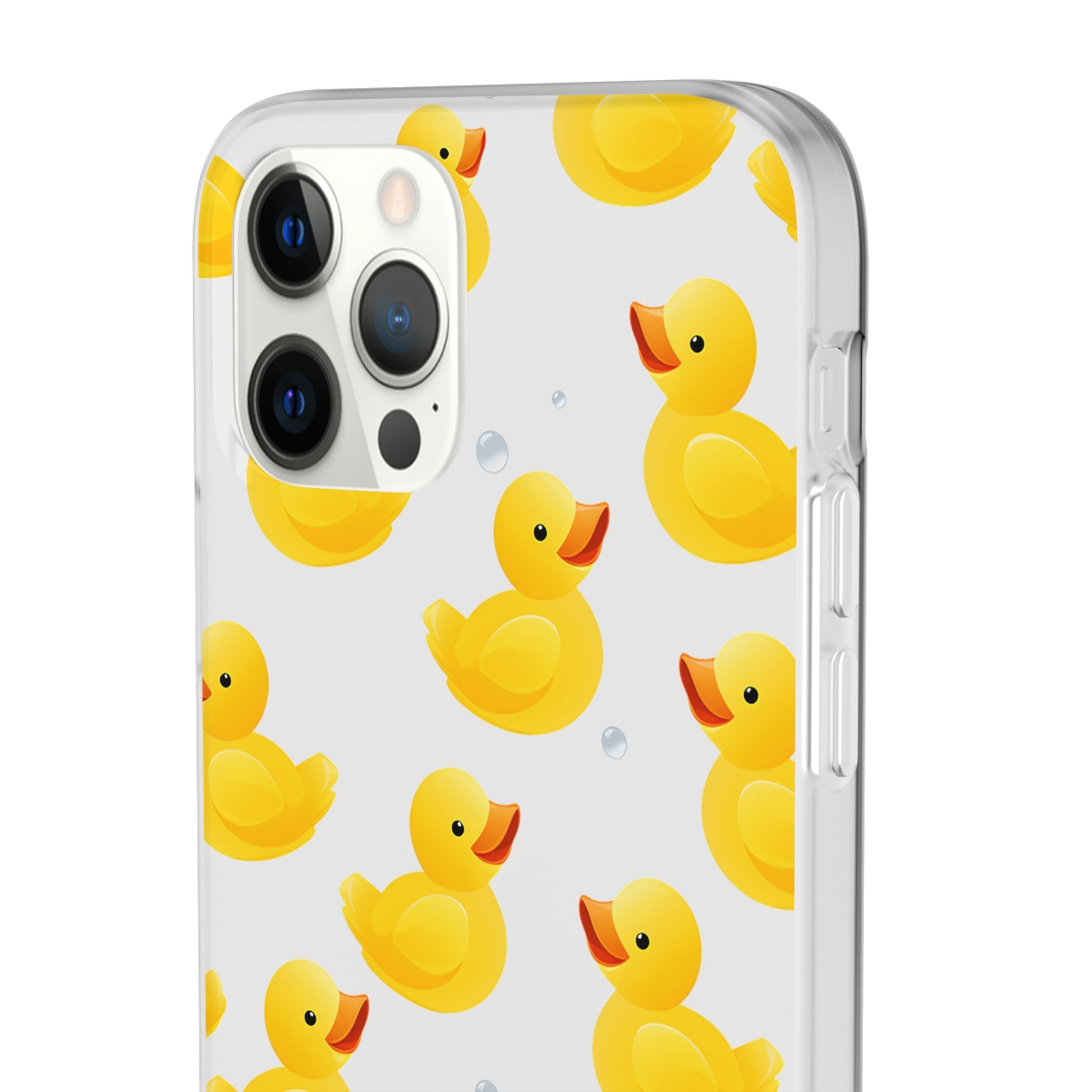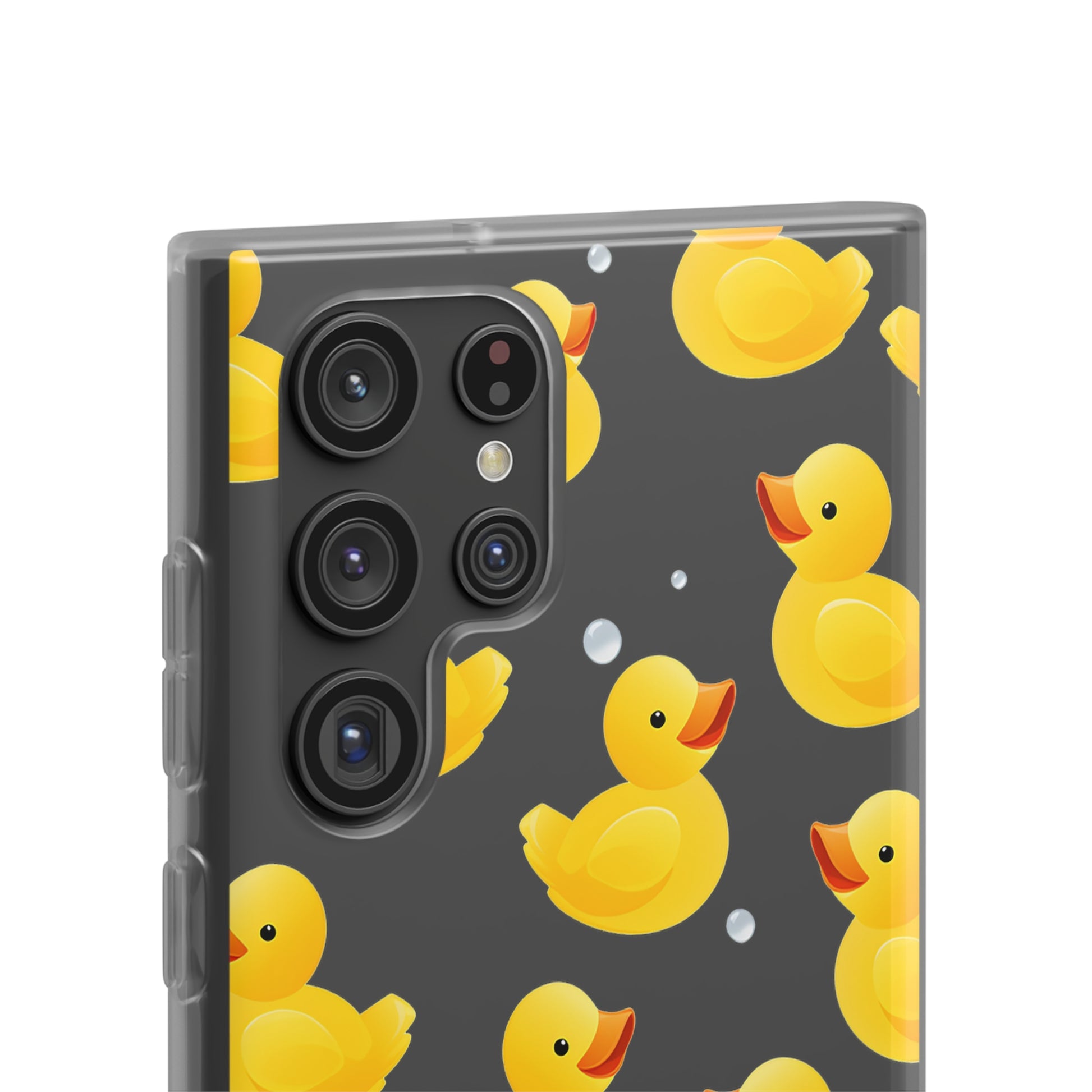 Keywords: Yellow duck case, Flexi phone cover, Transparent case, Playful design, Childhood nostalgia, Iconic ducks, Quirky style, Duck pattern, Premium protection, Retro vibe, Phone accessory, Classic design, Fun phone case.