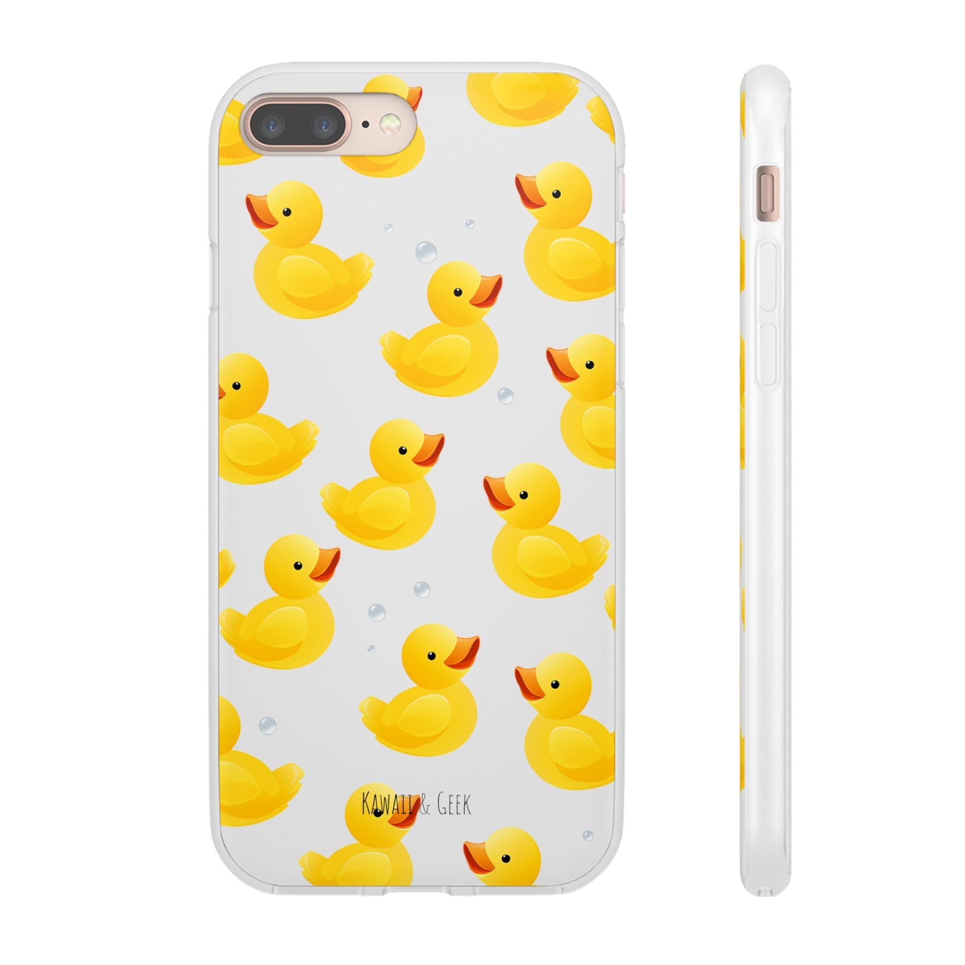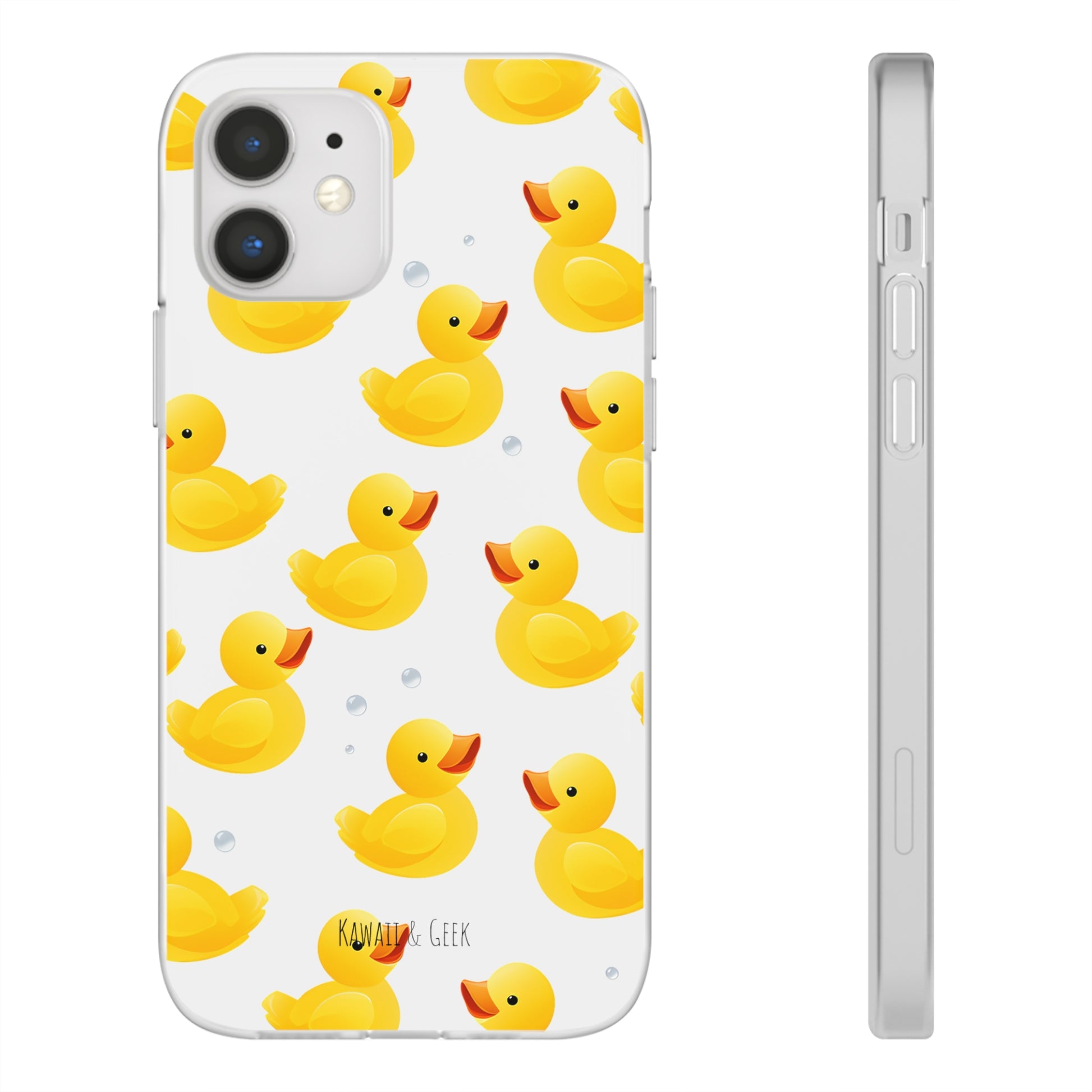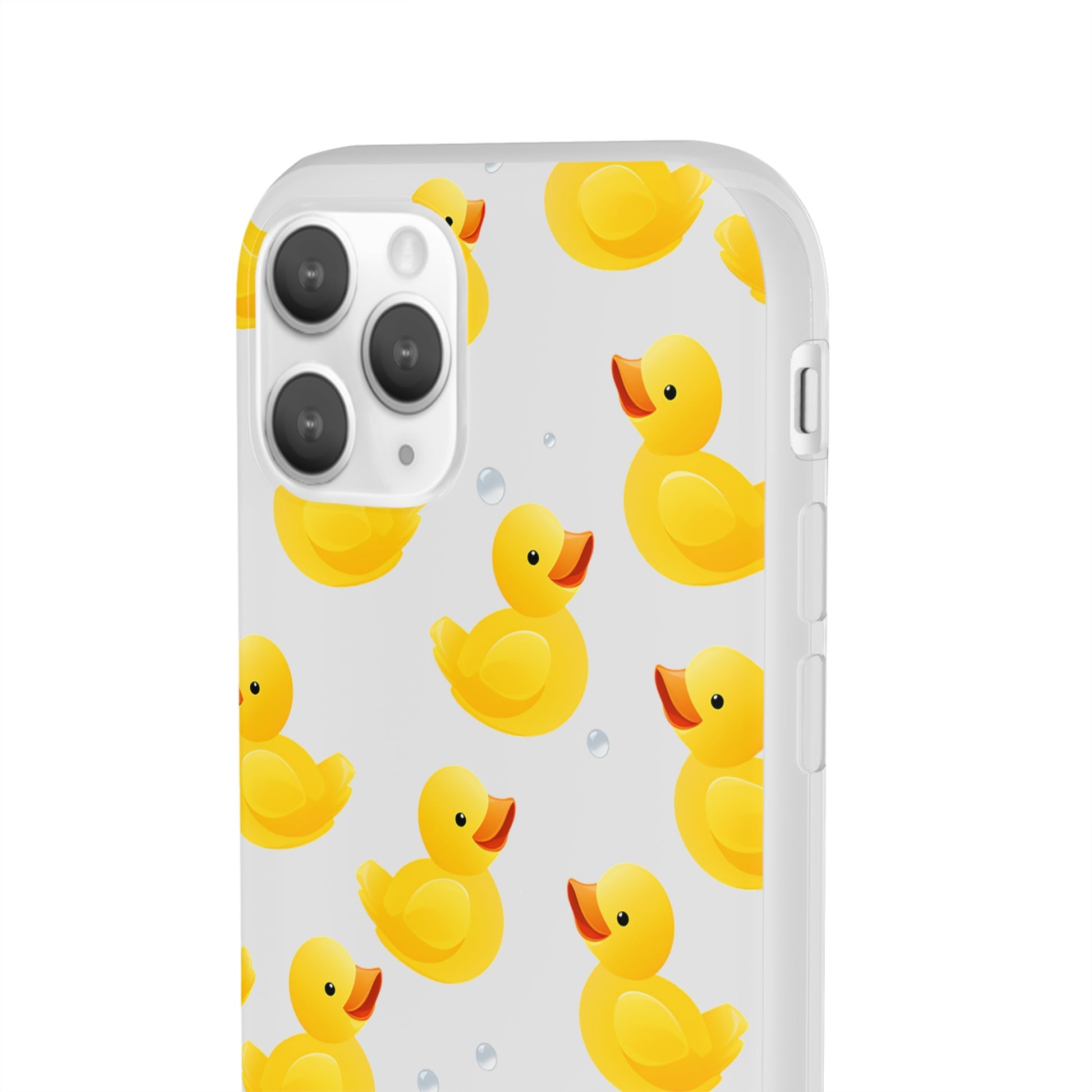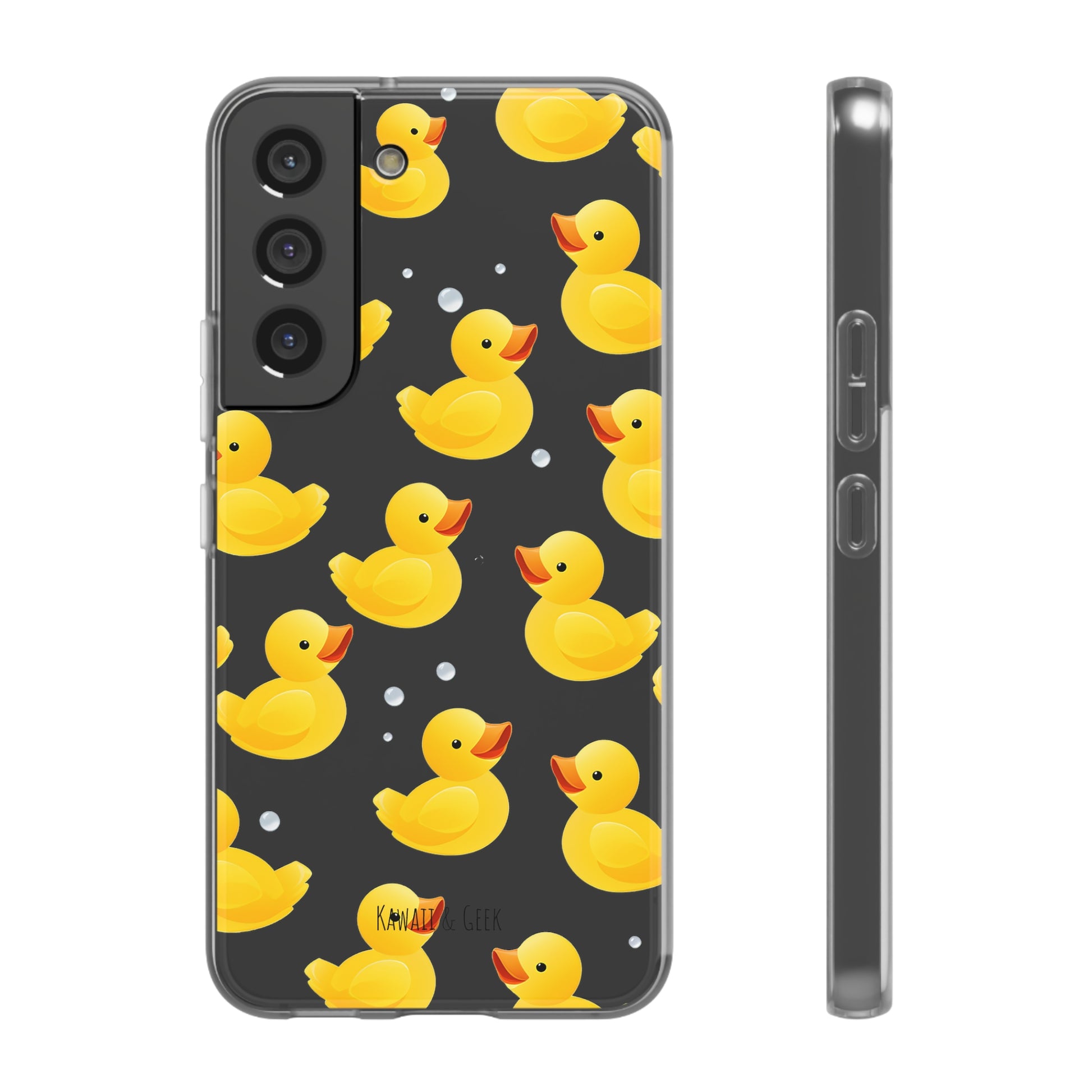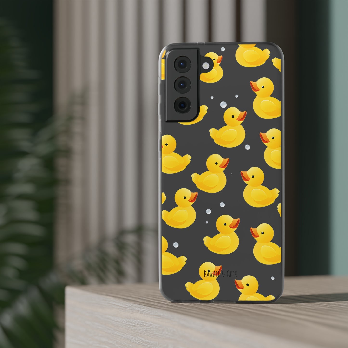 Keywords: Yellow duck case, Flexi phone cover, Transparent case, Playful design, Childhood nostalgia, Iconic ducks, Quirky style, Duck pattern, Premium protection, Retro vibe, Phone accessory, Classic design, Fun phone case.