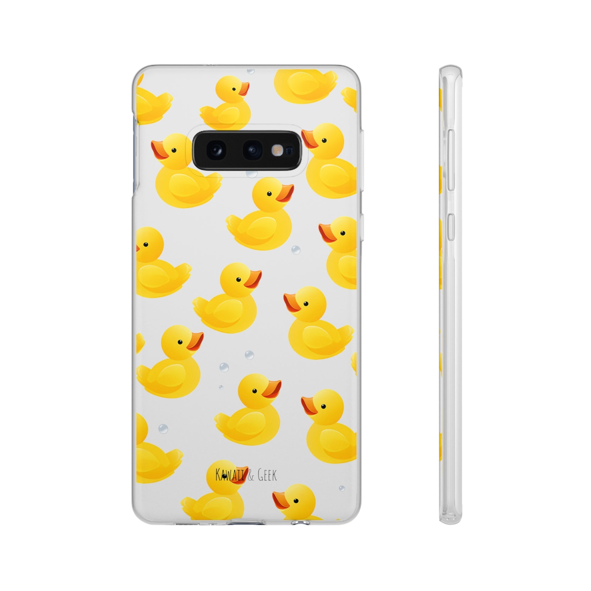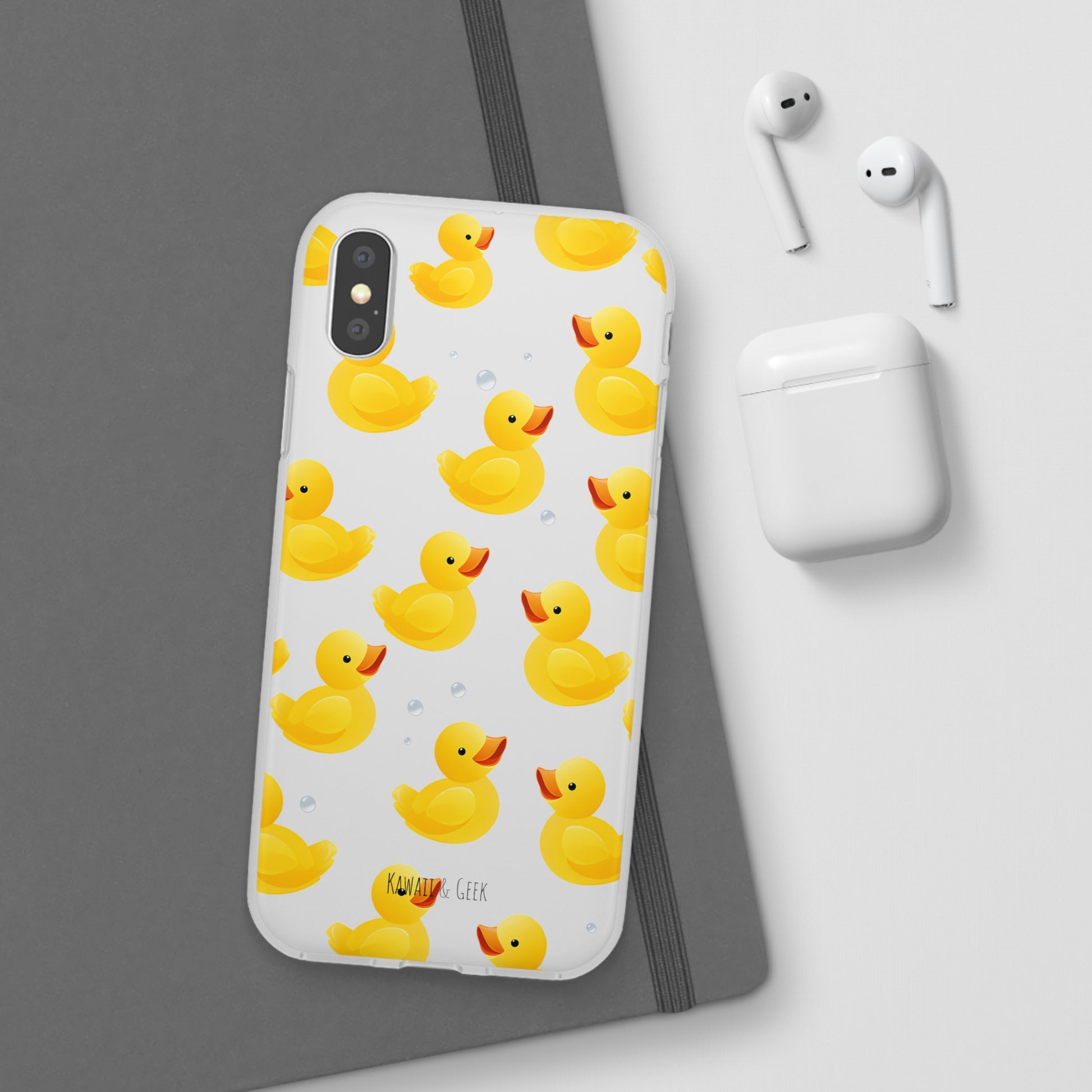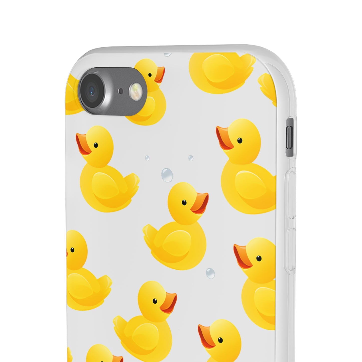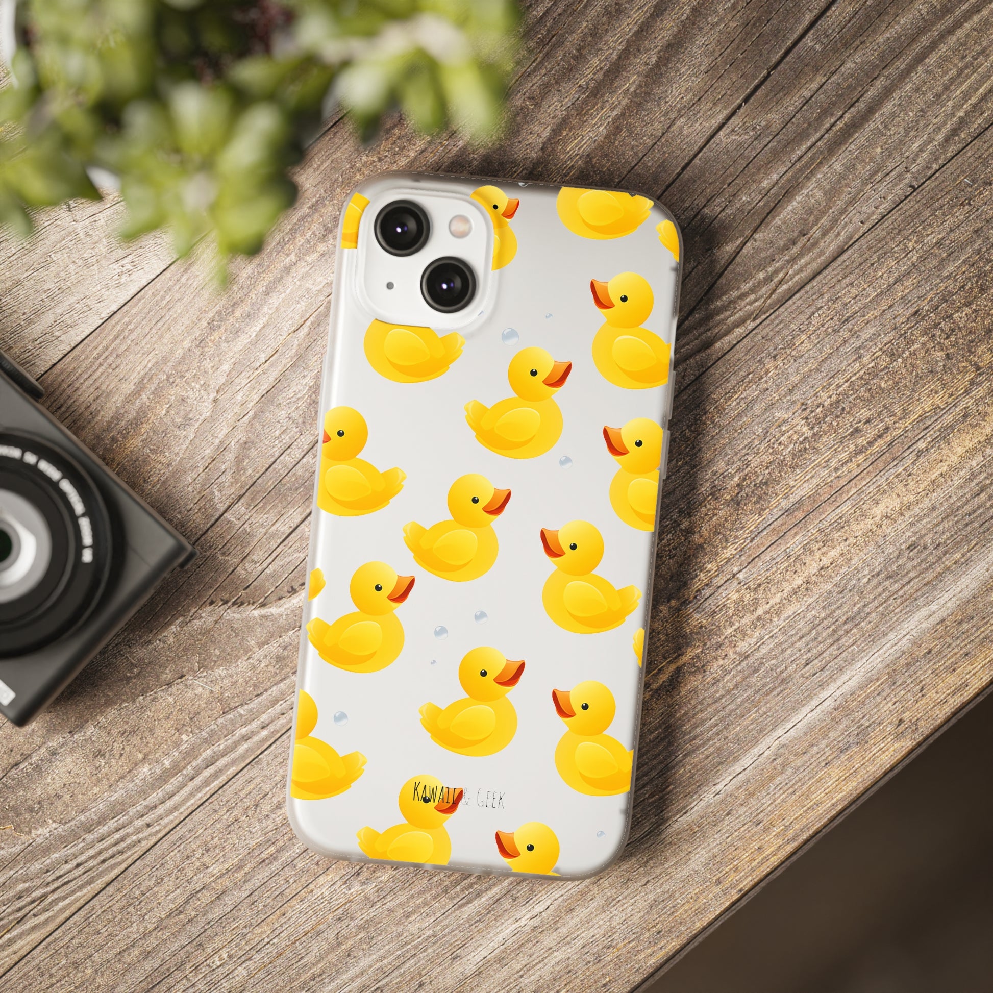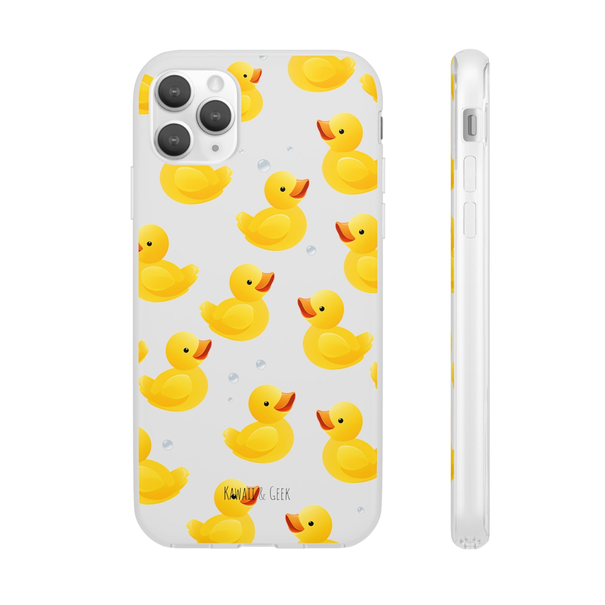 Keywords: Yellow duck case, Flexi phone cover, Transparent case, Playful design, Childhood nostalgia, Iconic ducks, Quirky style, Duck pattern, Premium protection, Retro vibe, Phone accessory, Classic design, Fun phone case.
