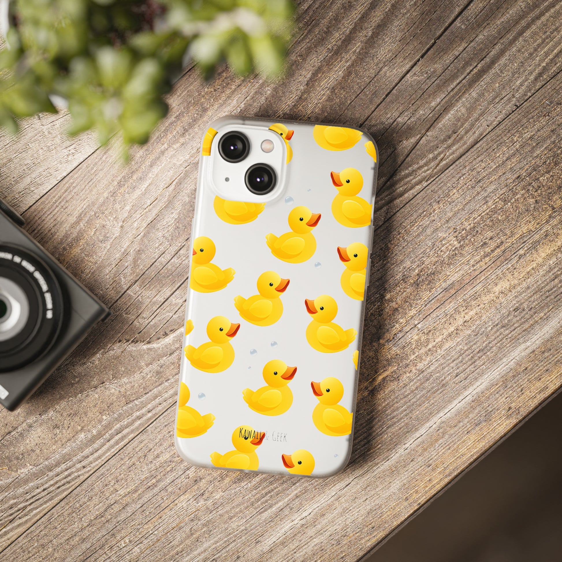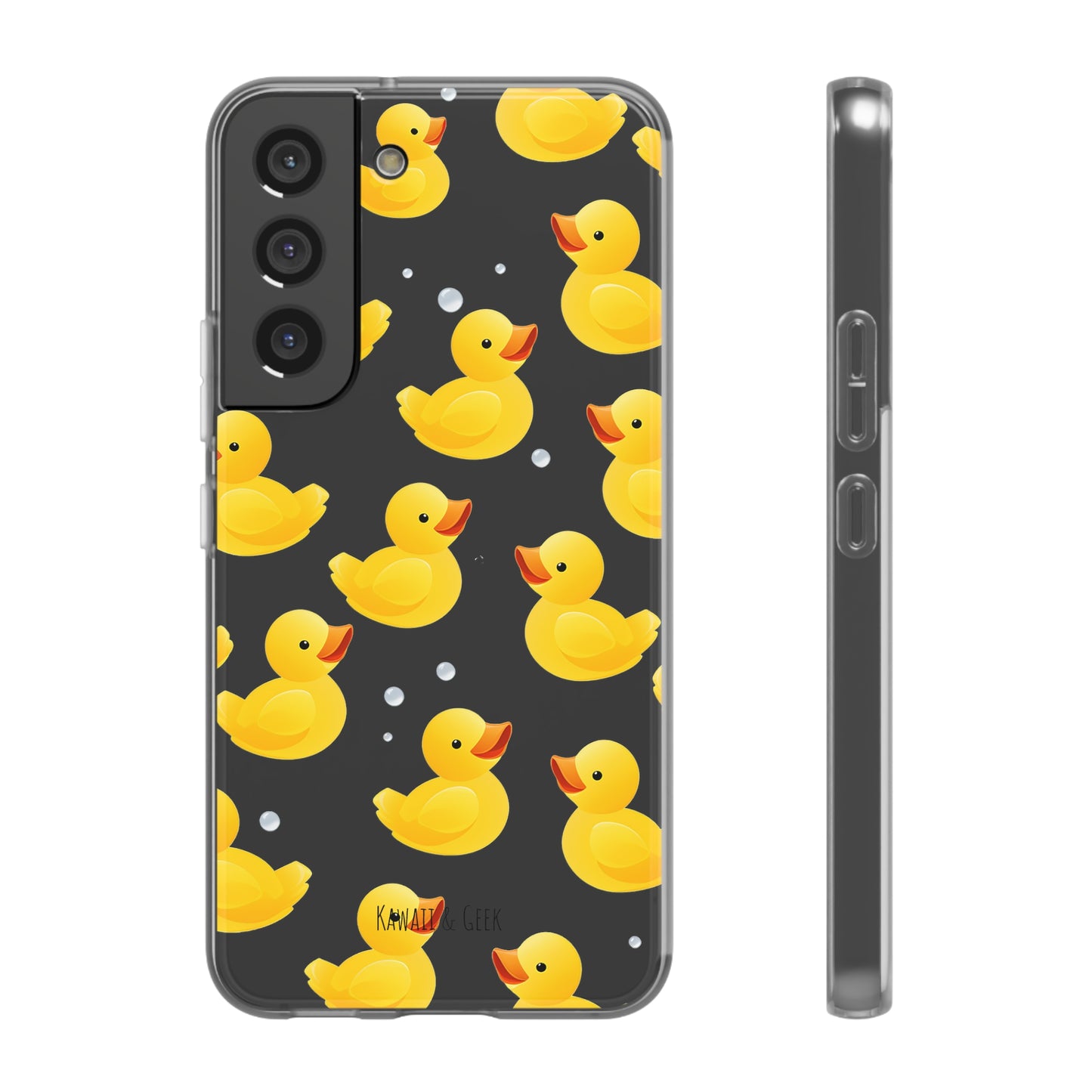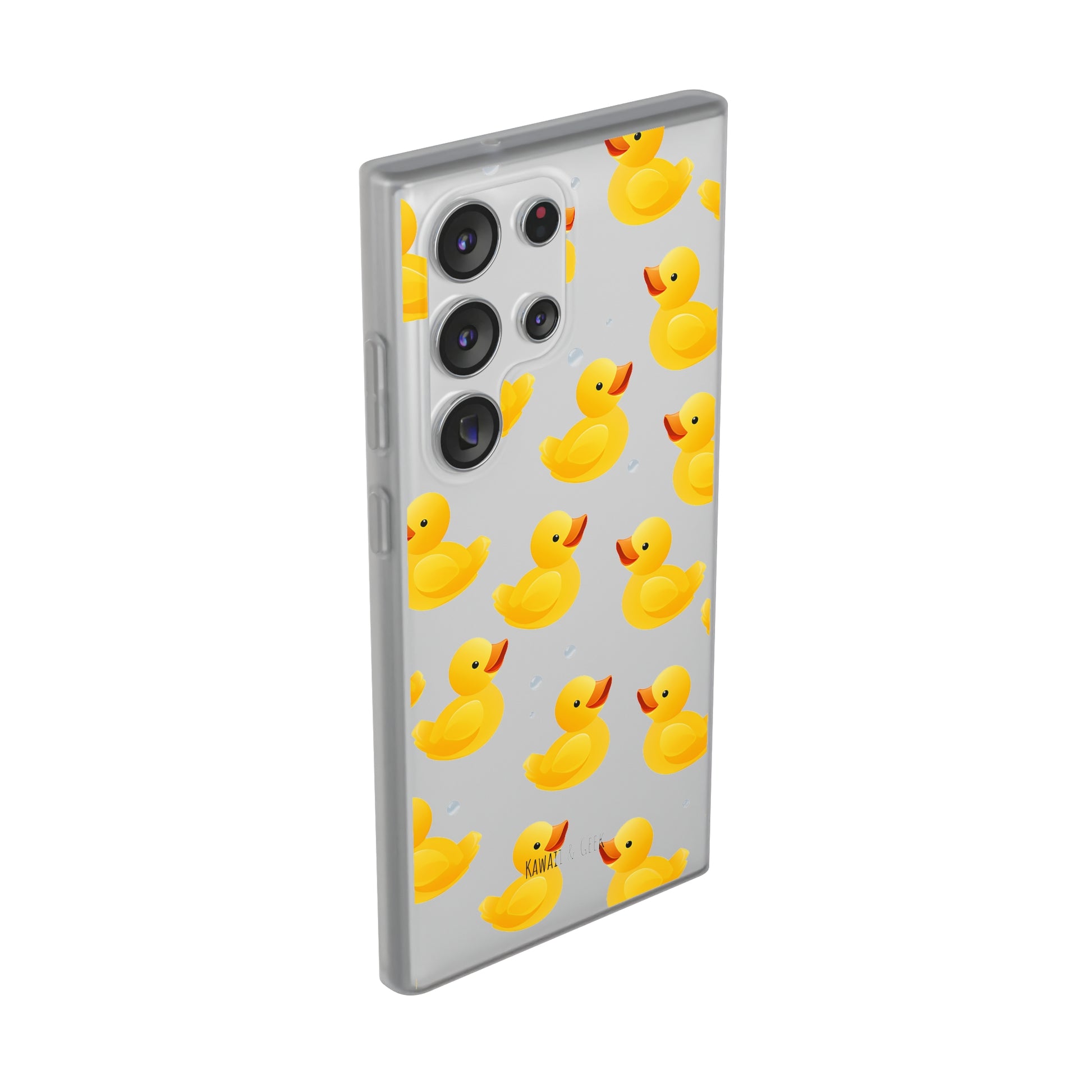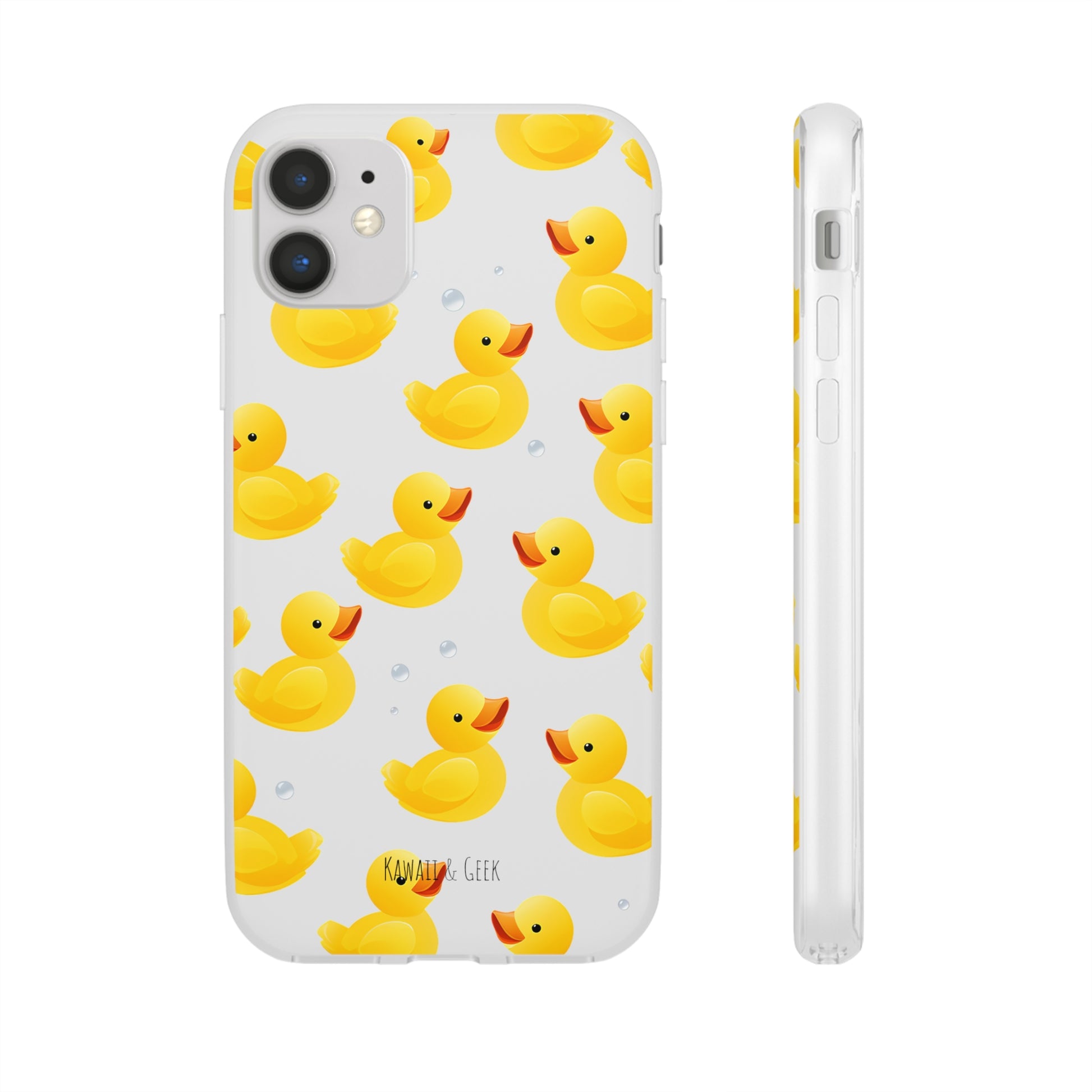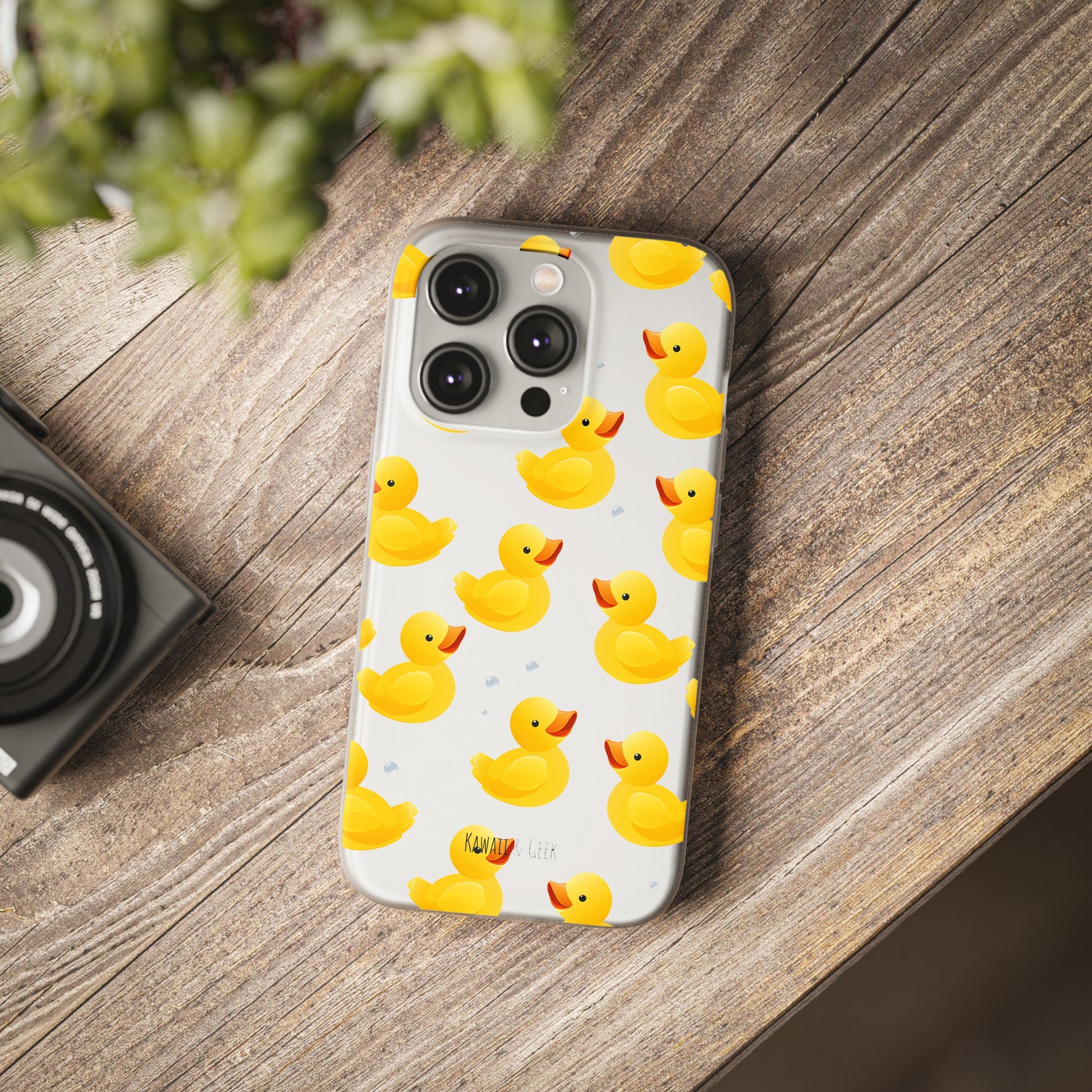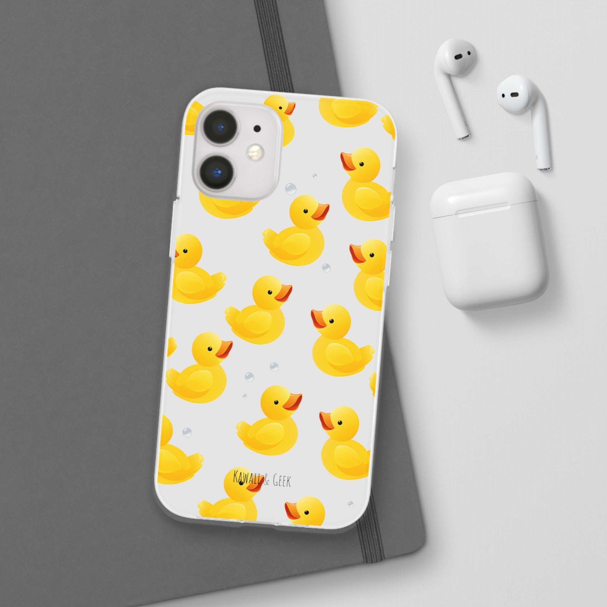 Keywords: Yellow duck case, Flexi phone cover, Transparent case, Playful design, Childhood nostalgia, Iconic ducks, Quirky style, Duck pattern, Premium protection, Retro vibe, Phone accessory, Classic design, Fun phone case.