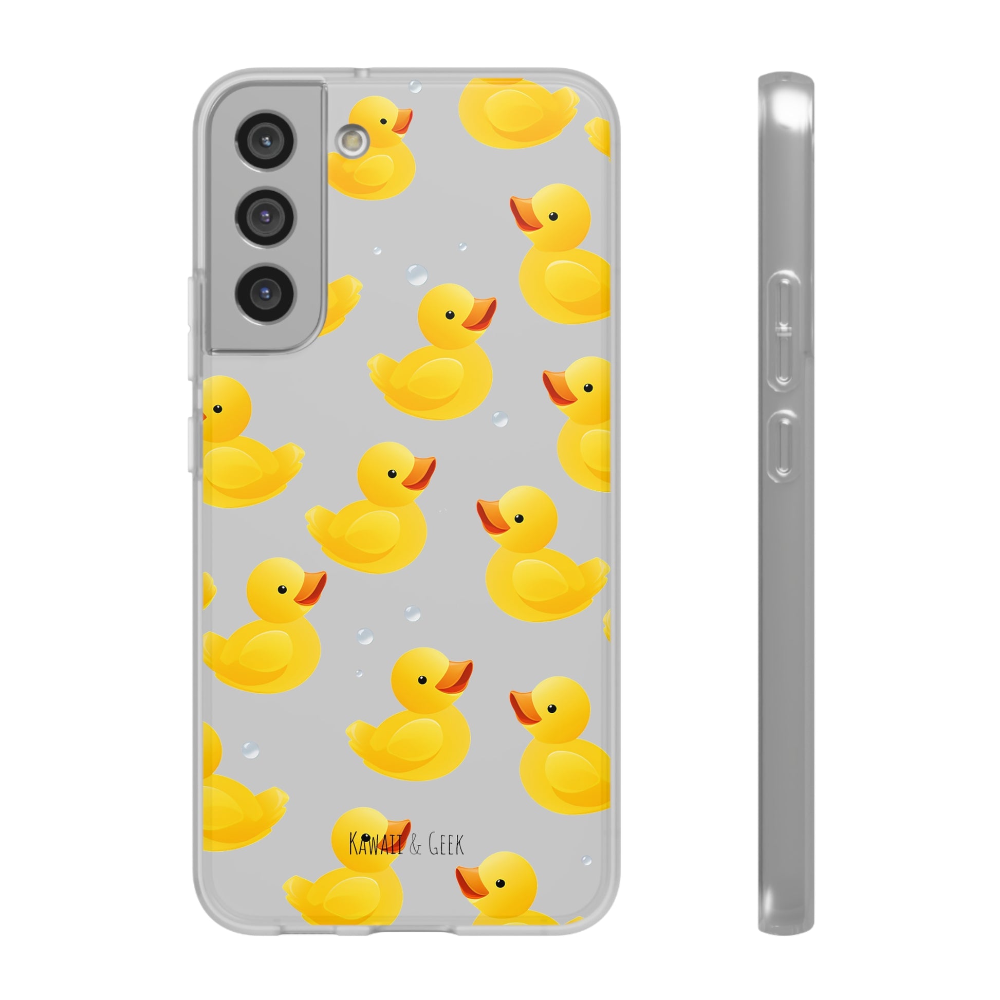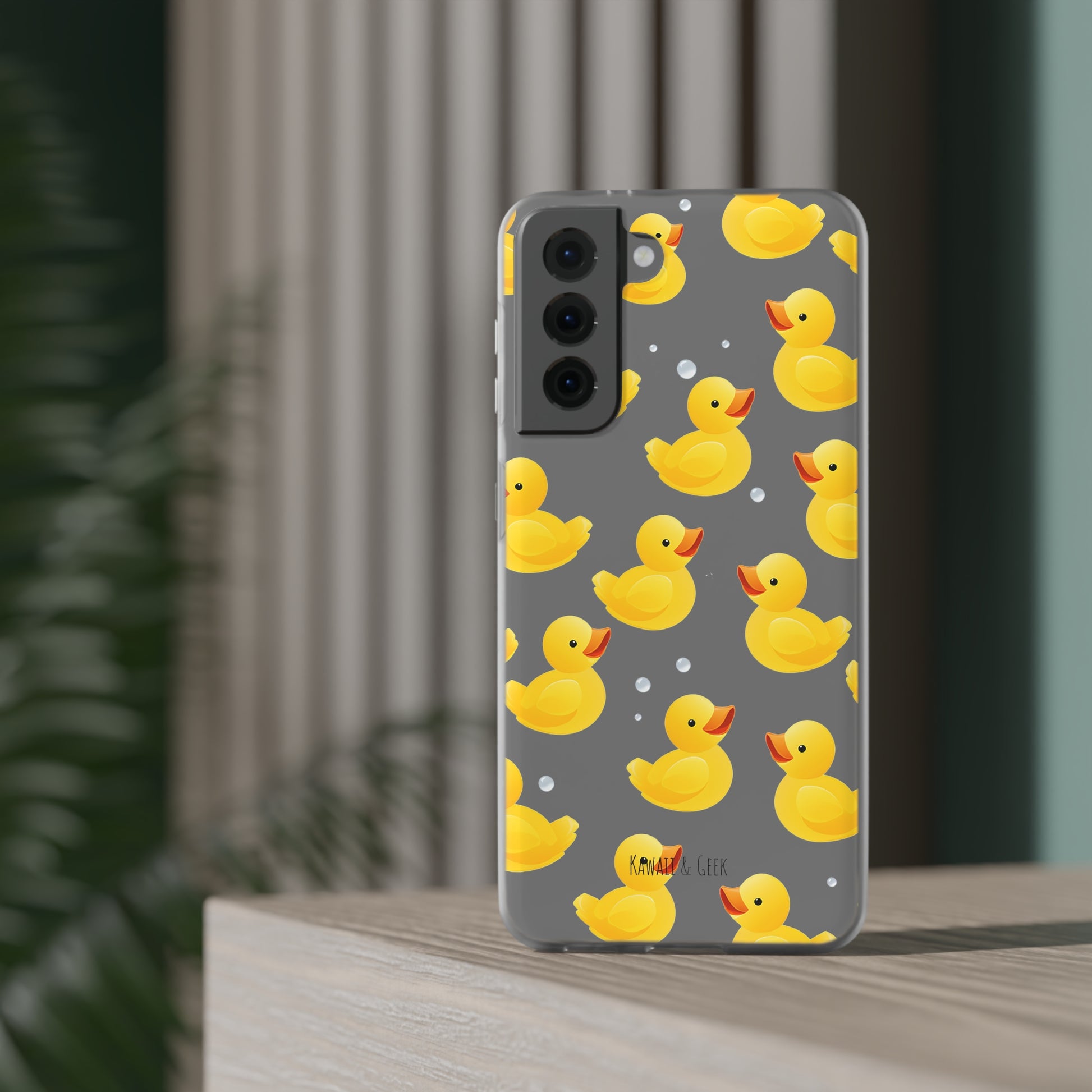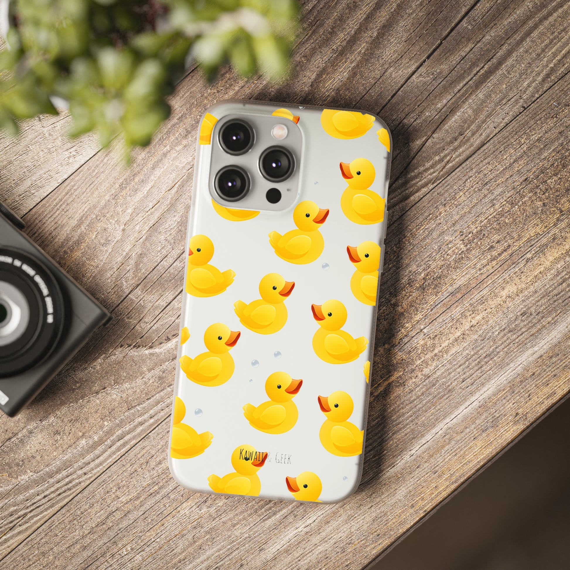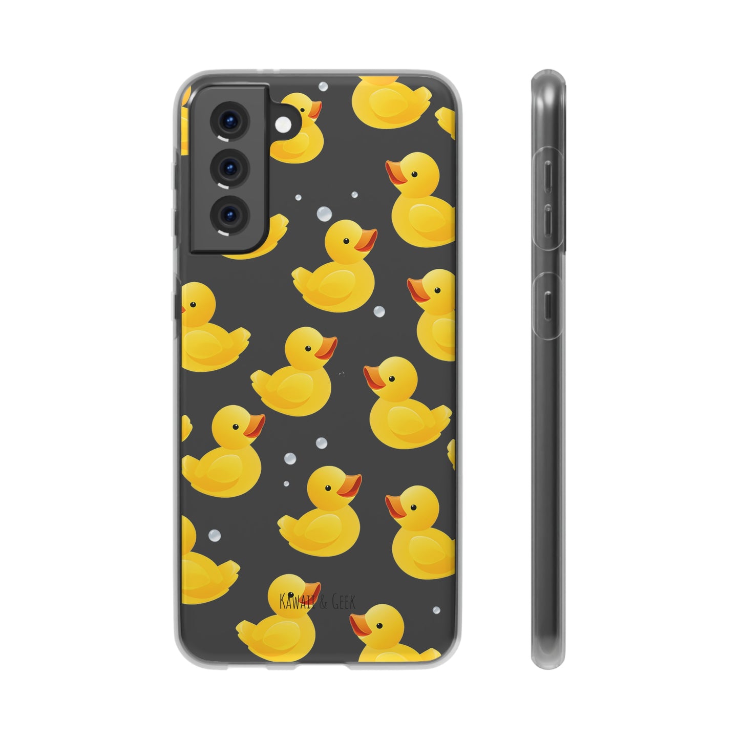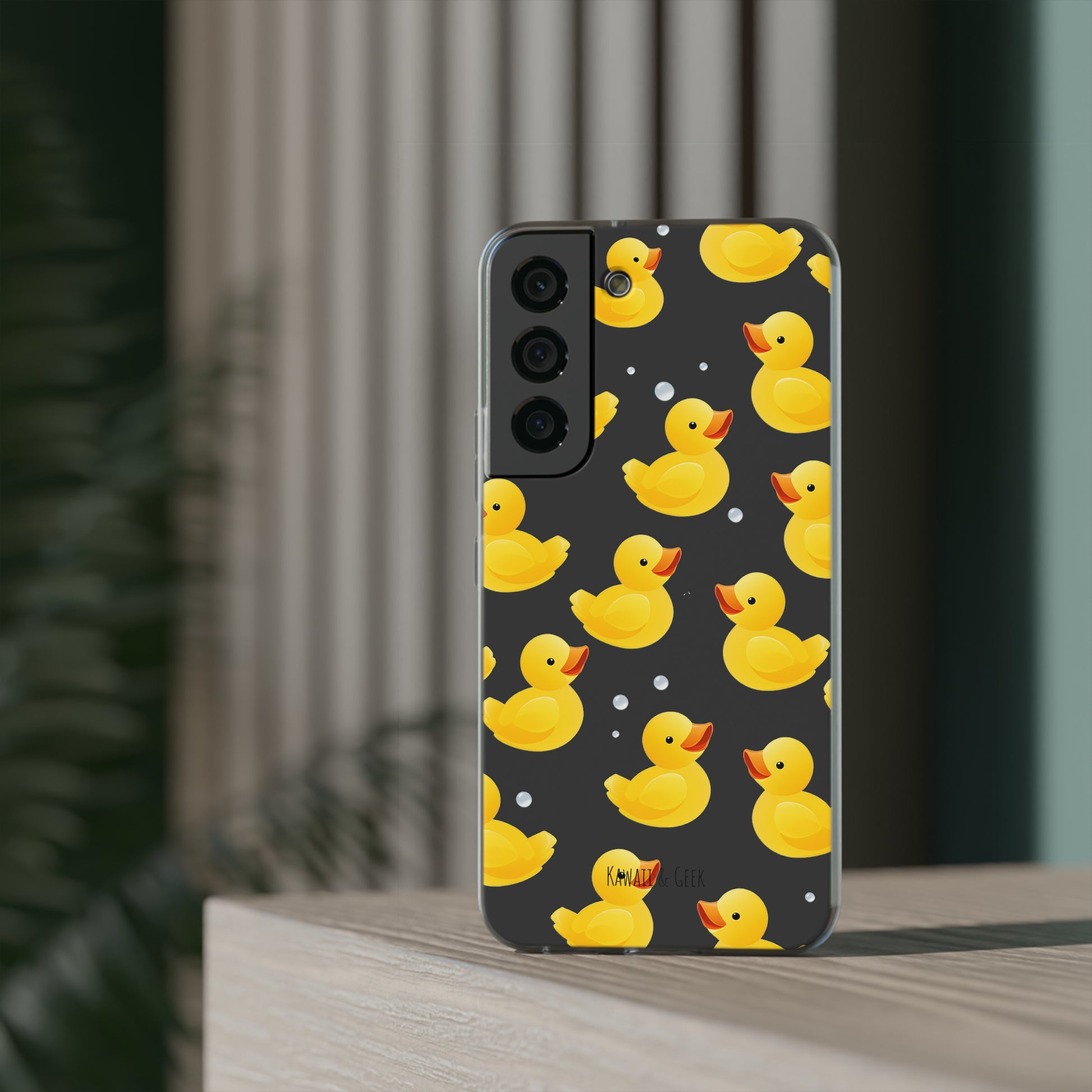 Keywords: Yellow duck case, Flexi phone cover, Transparent case, Playful design, Childhood nostalgia, Iconic ducks, Quirky style, Duck pattern, Premium protection, Retro vibe, Phone accessory, Classic design, Fun phone case.
