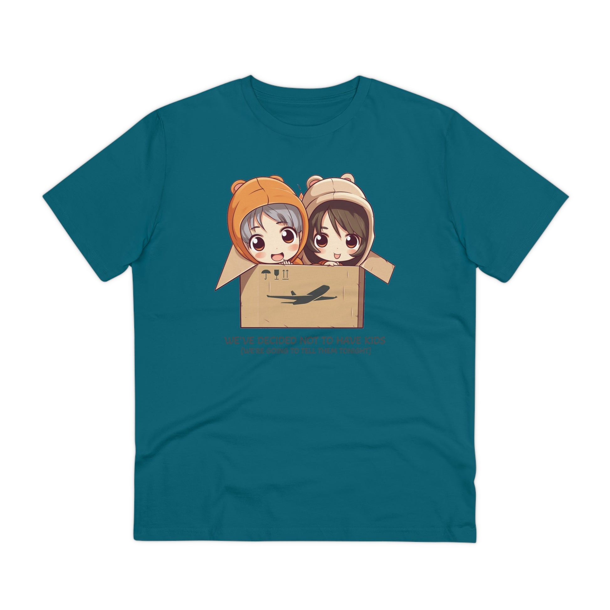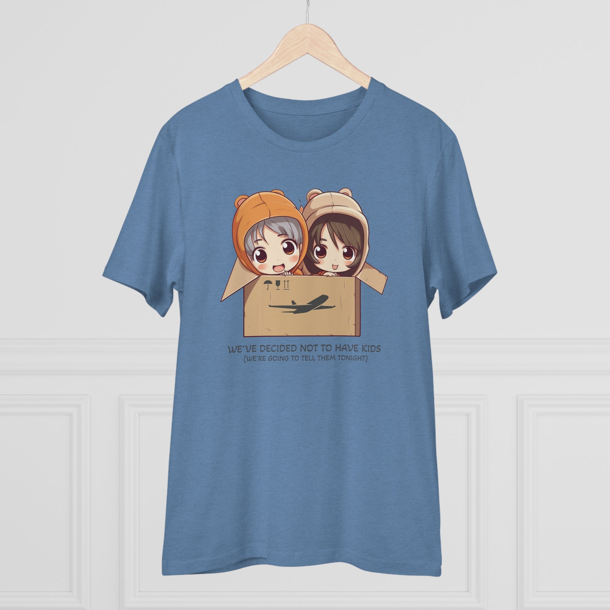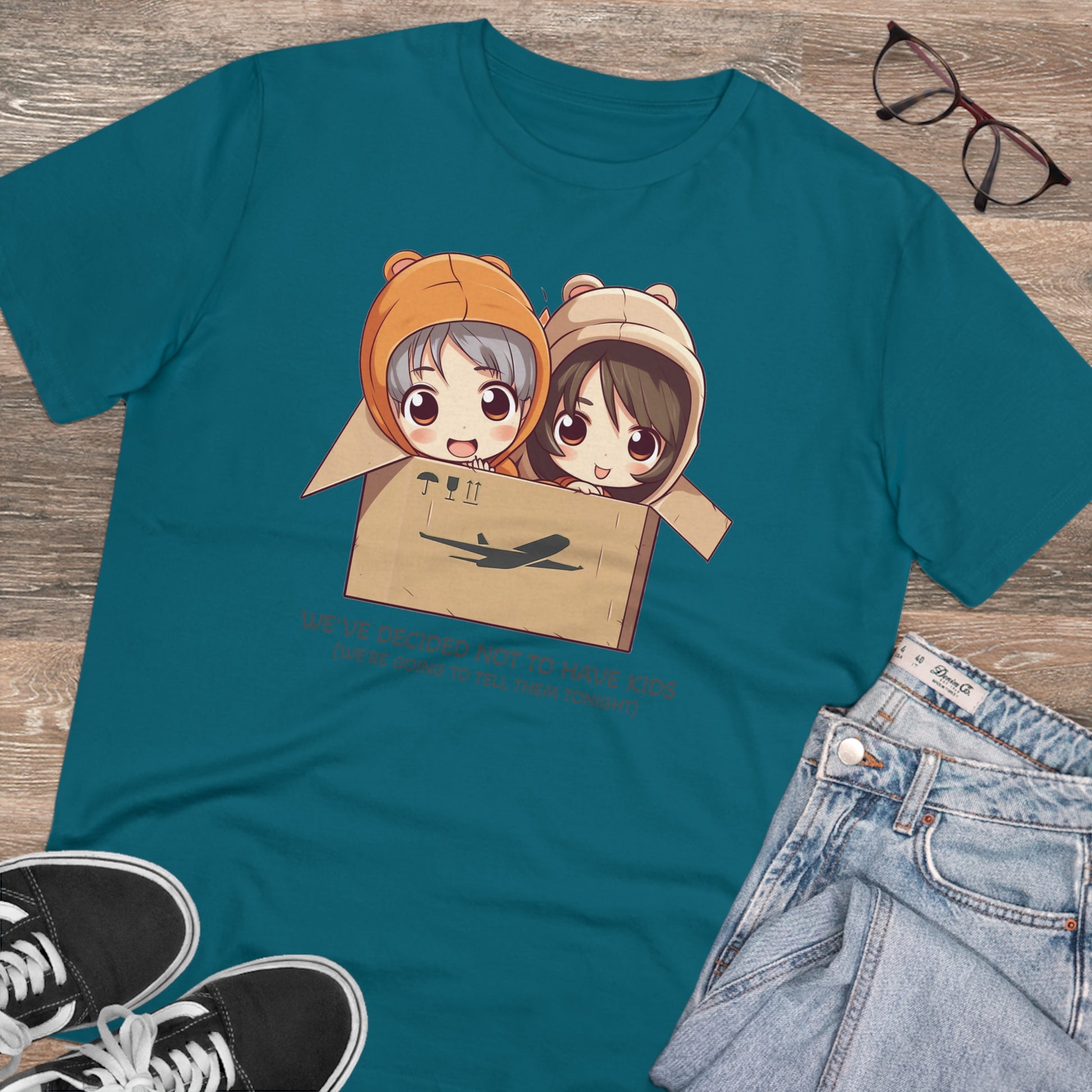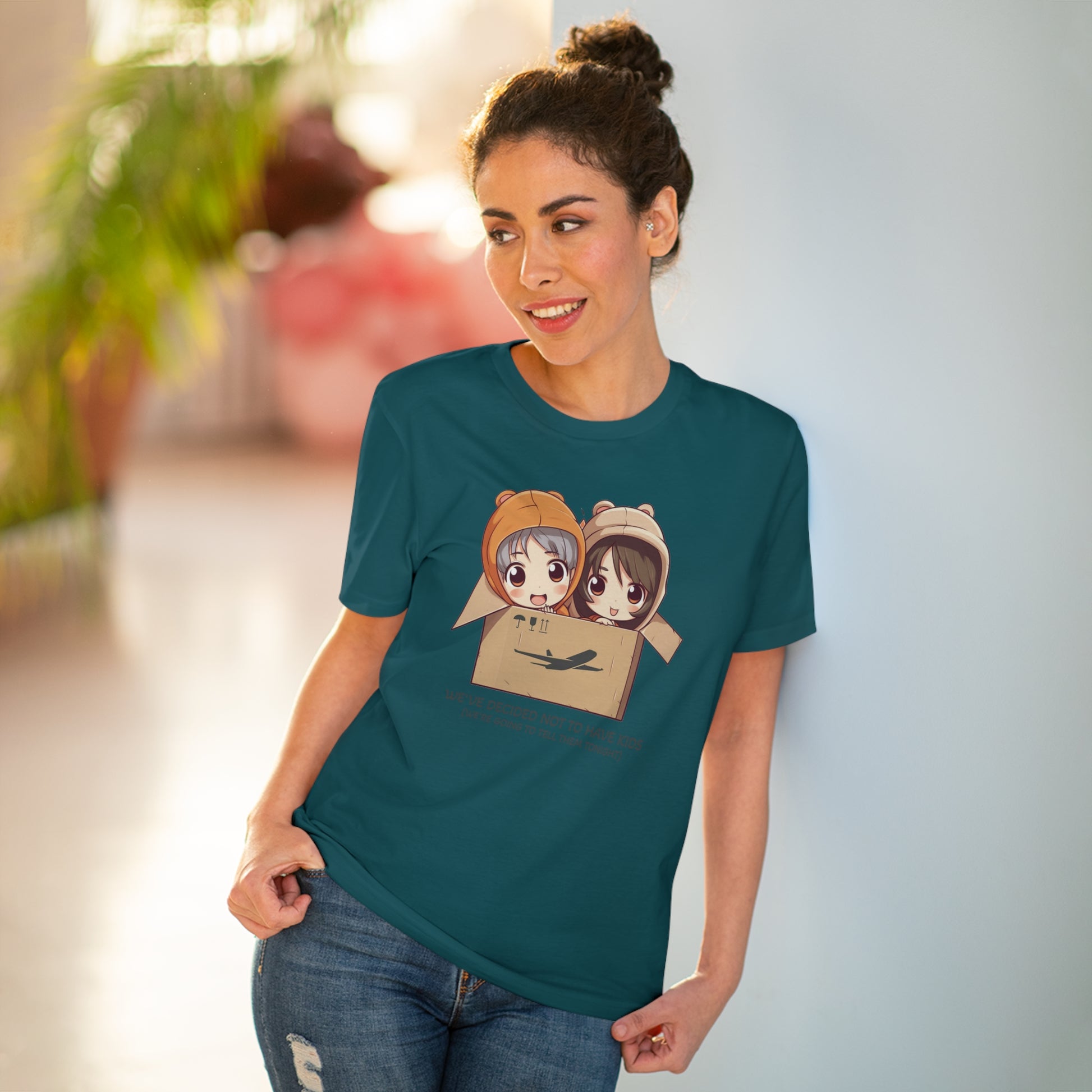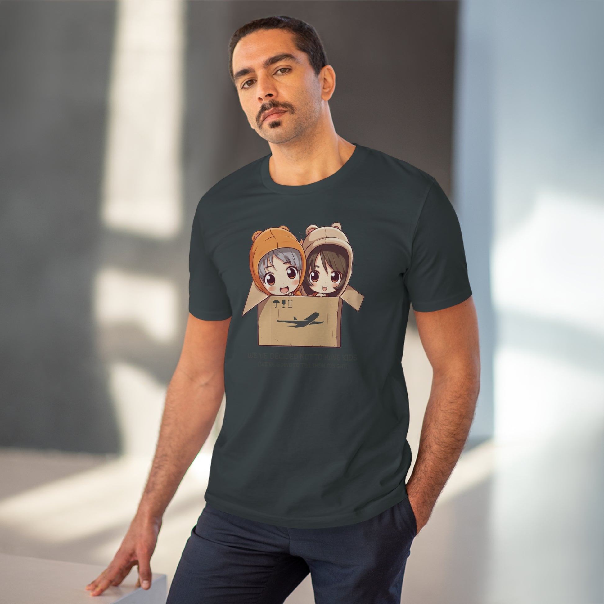 Make a playful and eco-conscious statement with this unisex eco-friendly t-shirt featuring a unique design that portrays two kids inside a moving box with an airplane on it. Crafted from sustainable materials, this t-shirt not only showcases your sense of humor but also reflects your commitment to the environment. The high-quality print and comfortable fit make it an ideal choice for everyday wear. Whether you're sharing your decision or simply appreciating the irony, this t-shirt adds a touch of humor and sustainability to your wardrobe.