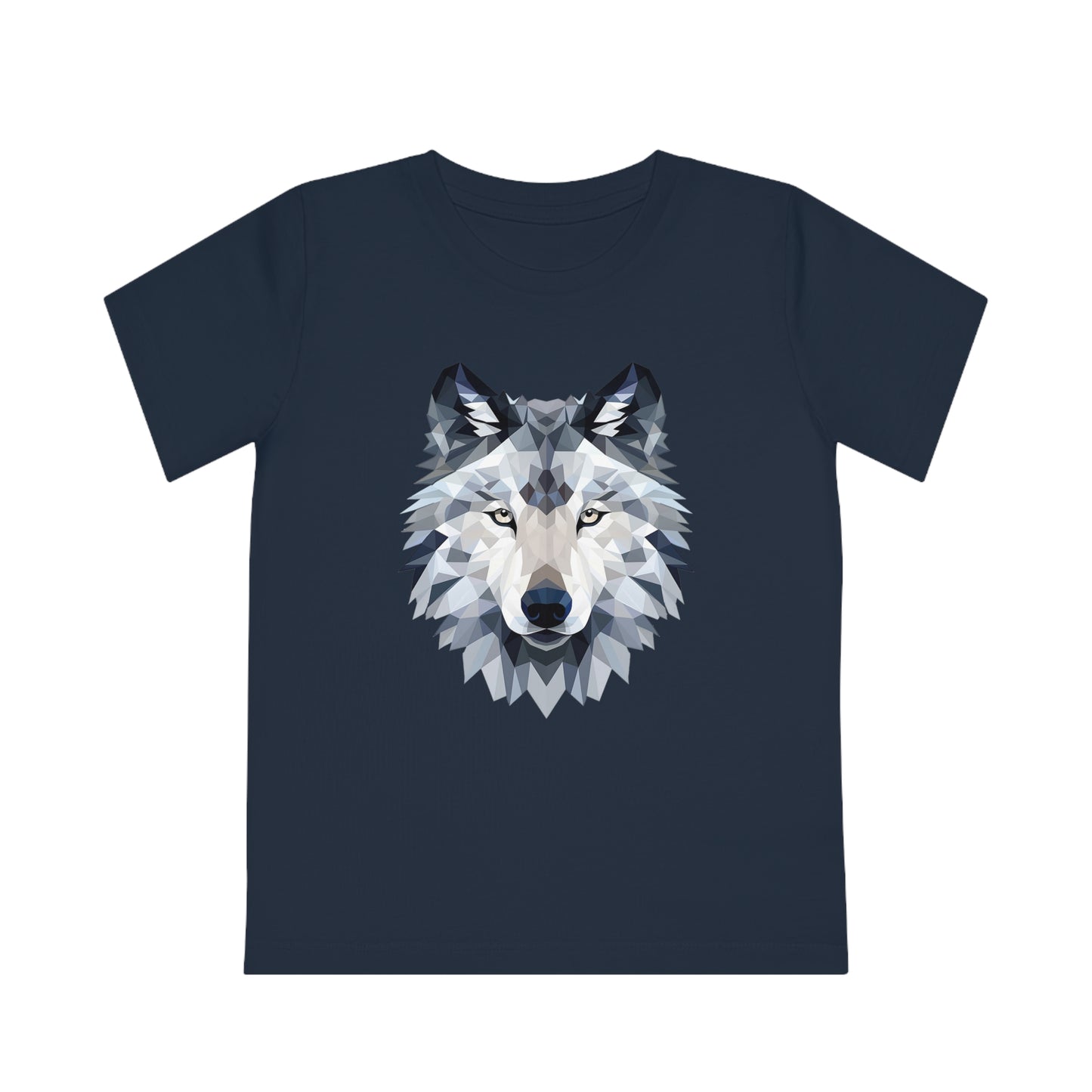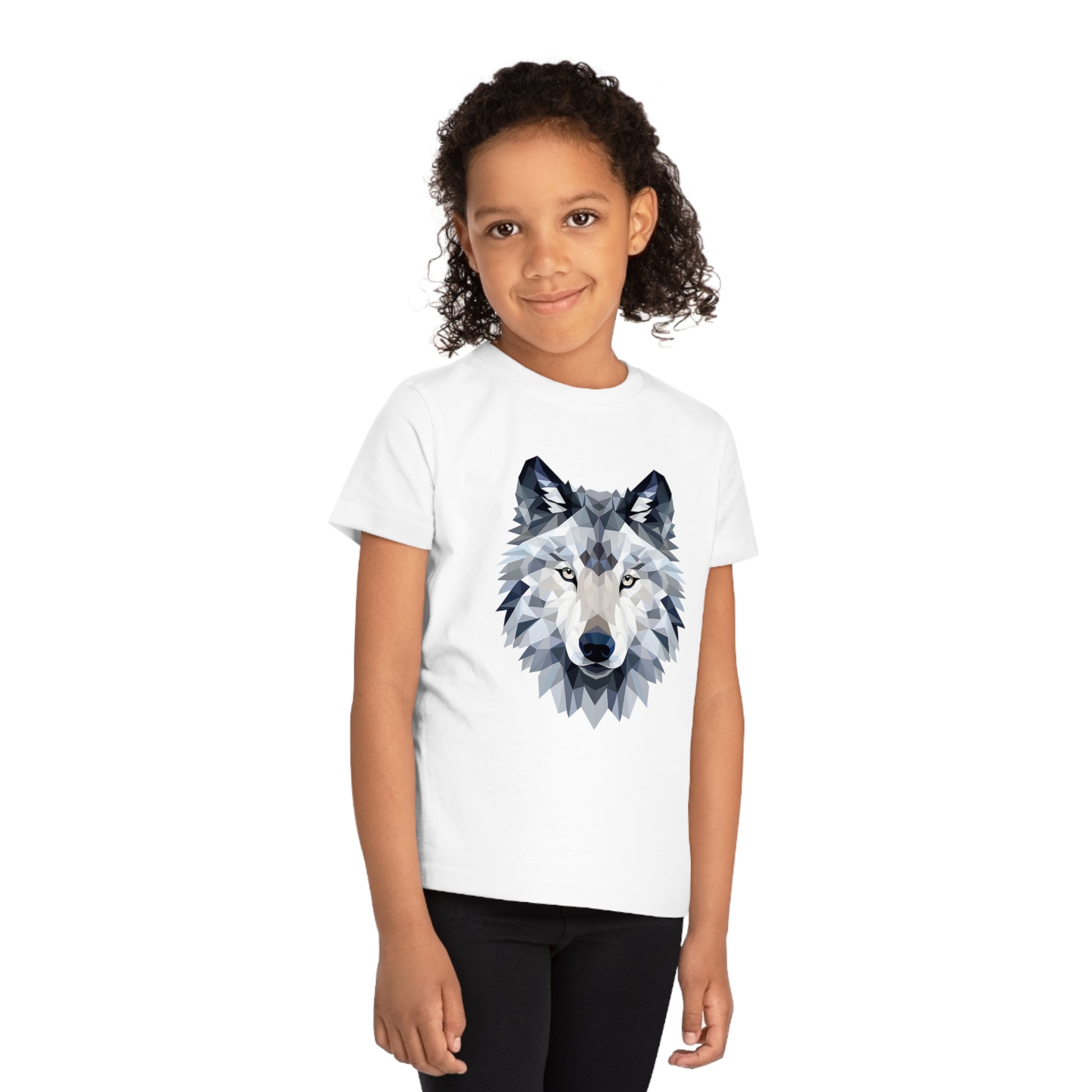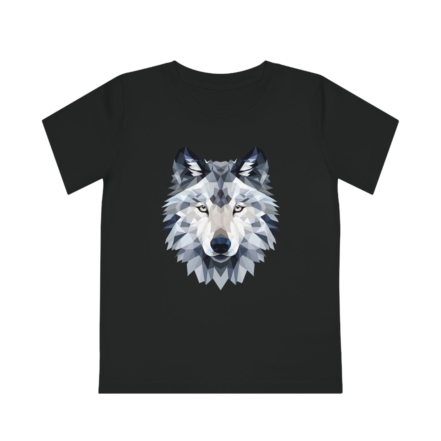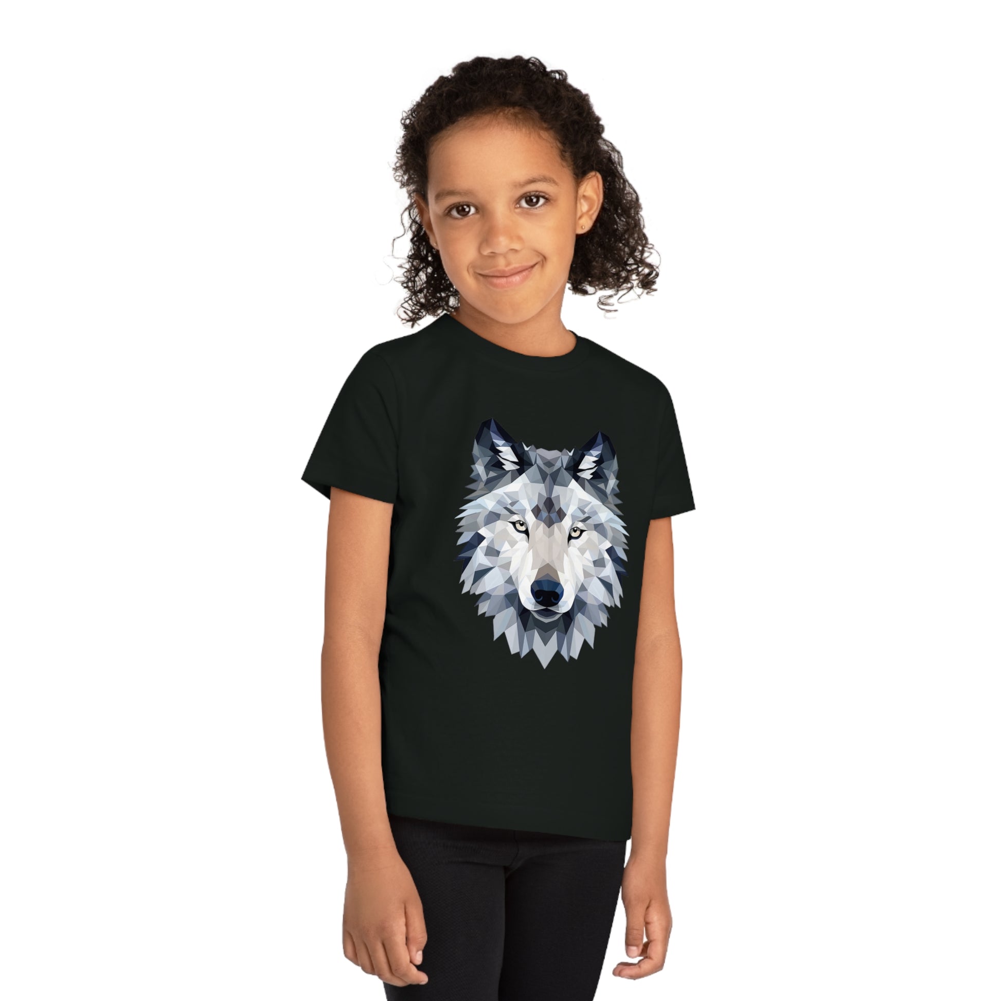 Keywords: Wolf kids t-shirt, polygonal geometric style, eco-friendly materials, mystical howl, powerful design, unique style, animal enthusiast, sustainable fashion.