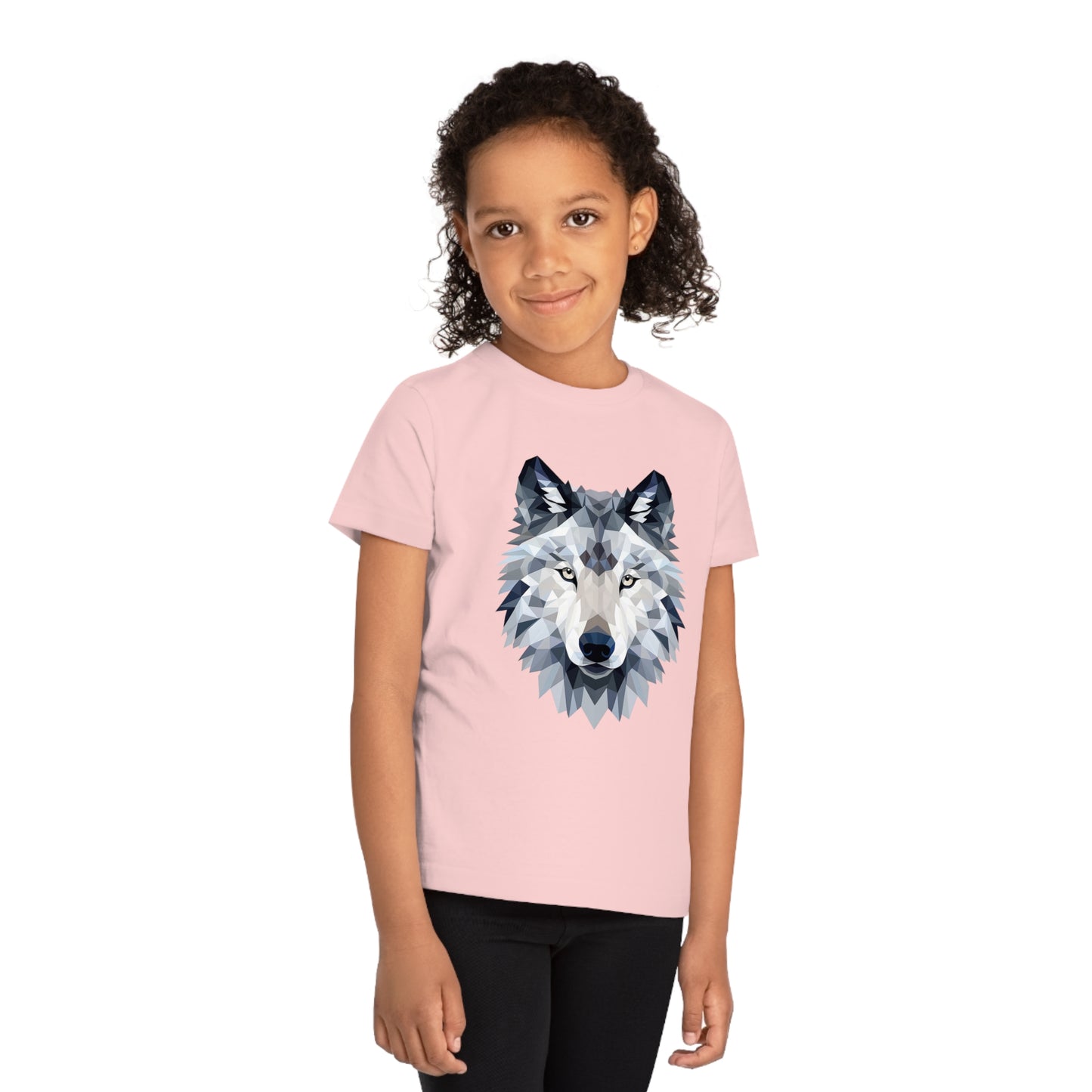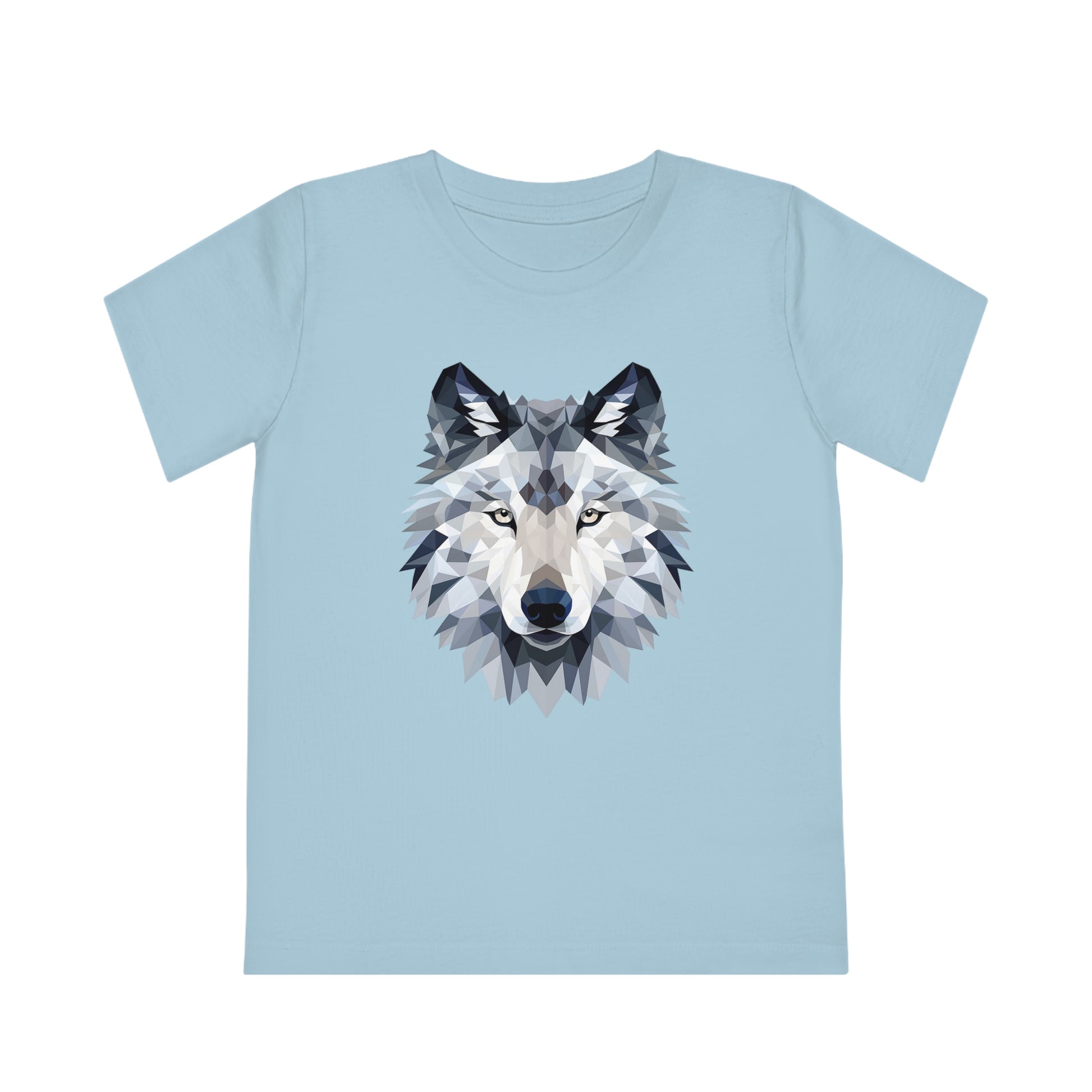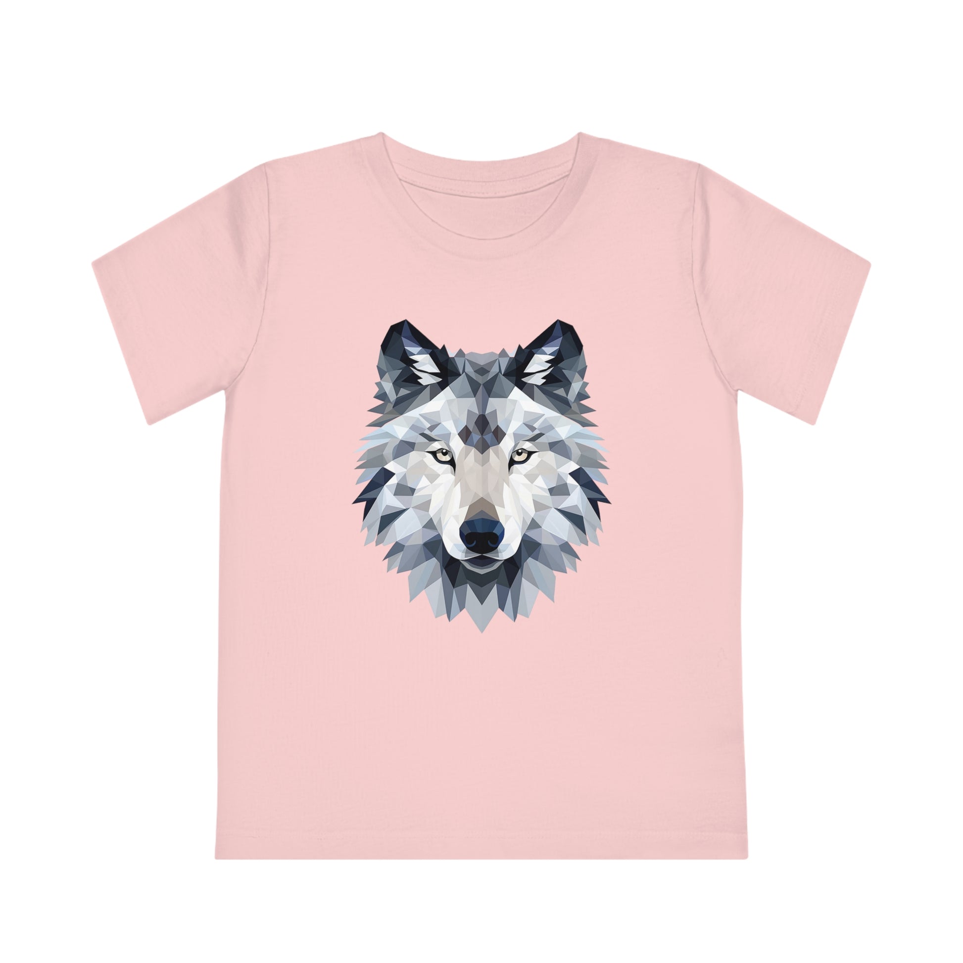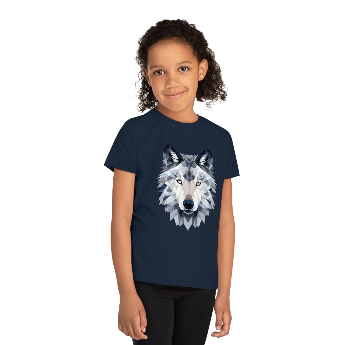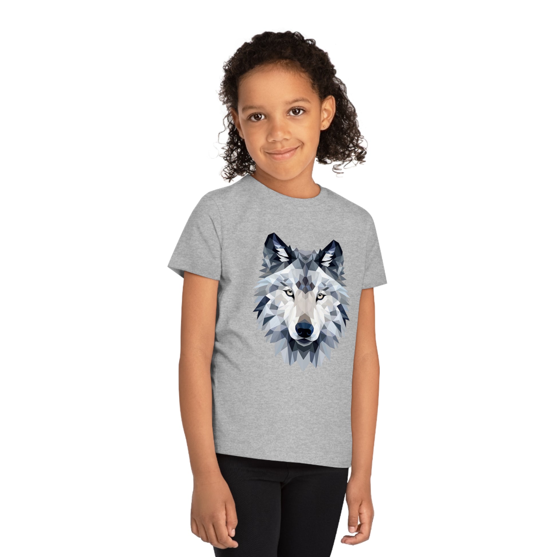 Keywords: Wolf kids t-shirt, polygonal geometric style, eco-friendly materials, mystical howl, powerful design, unique style, animal enthusiast, sustainable fashion.