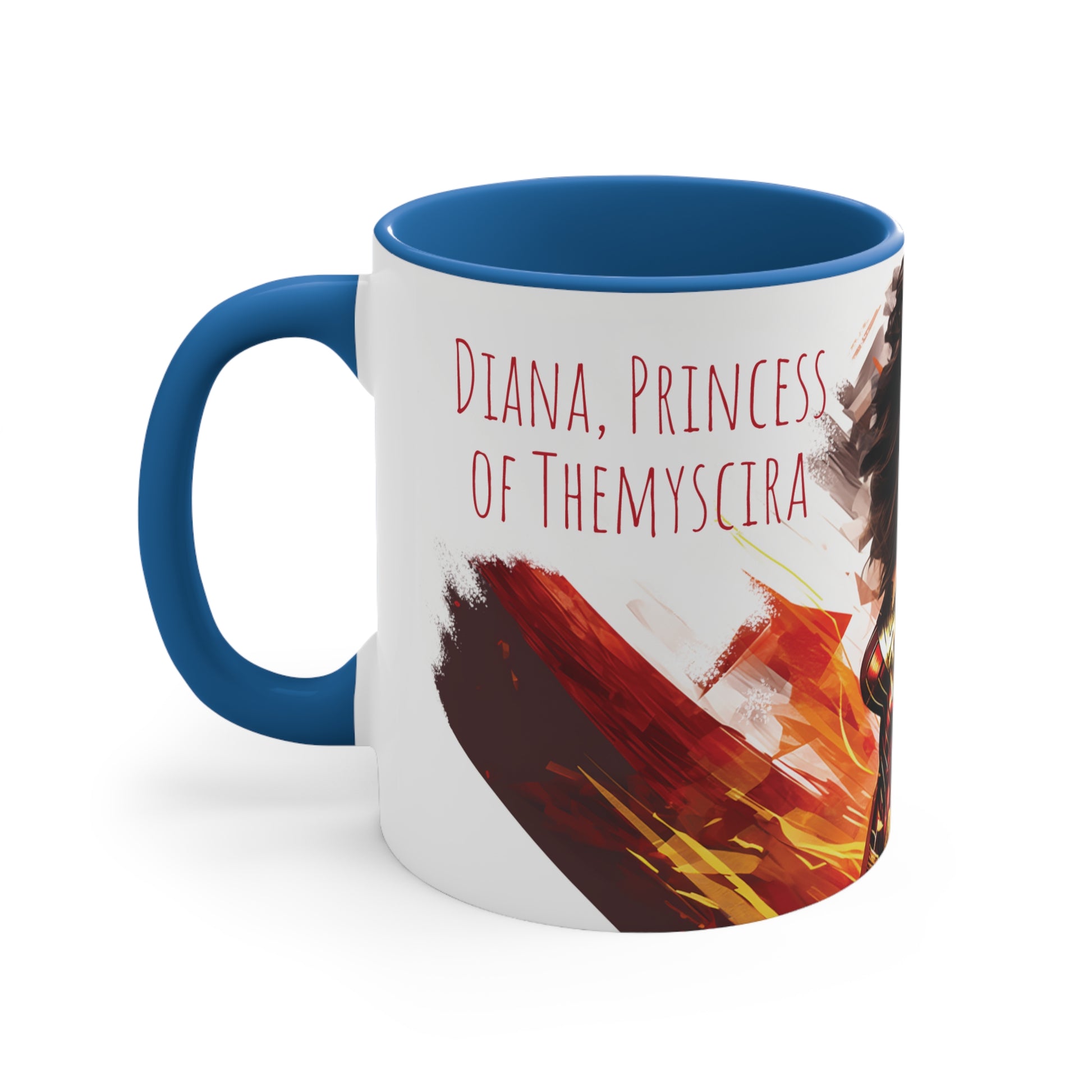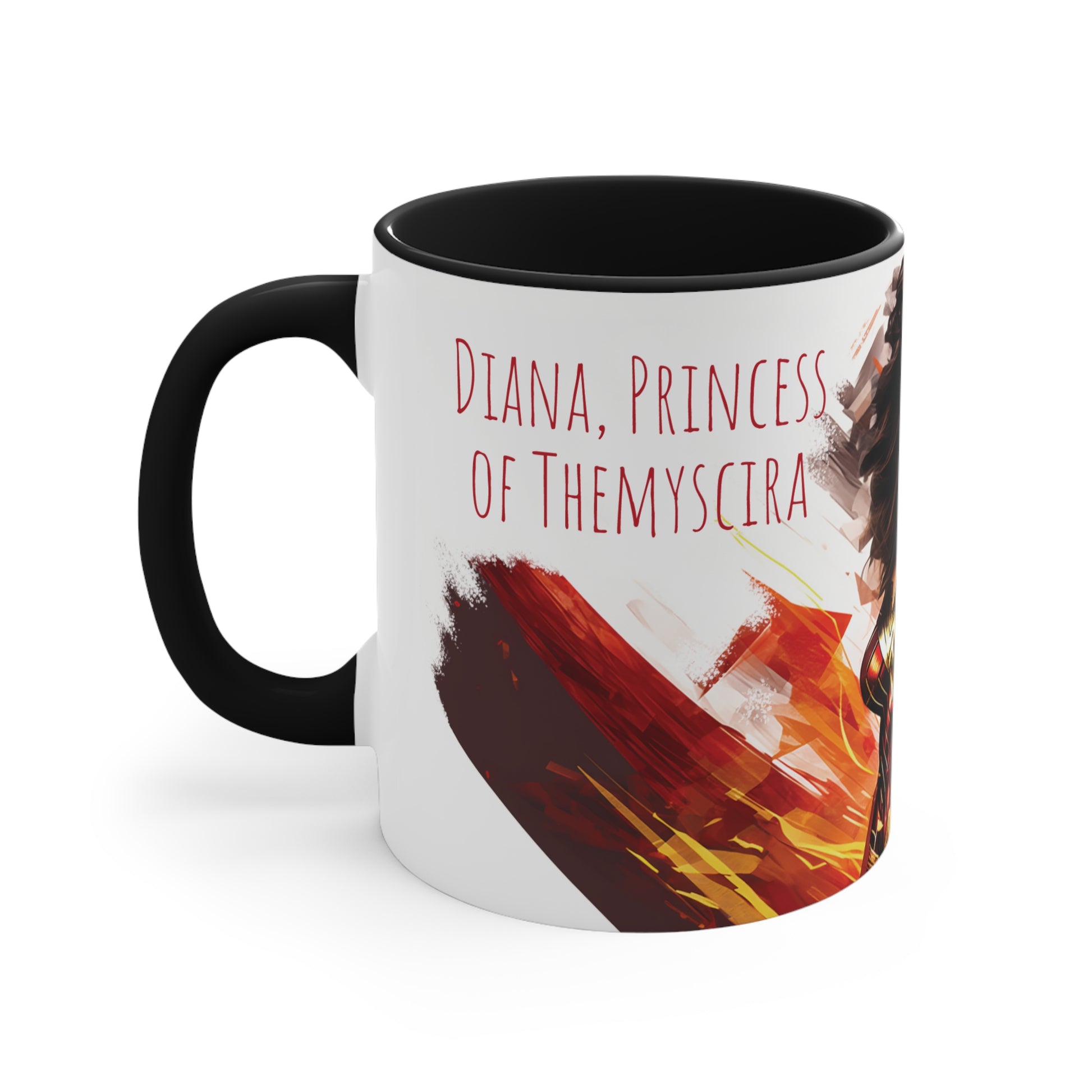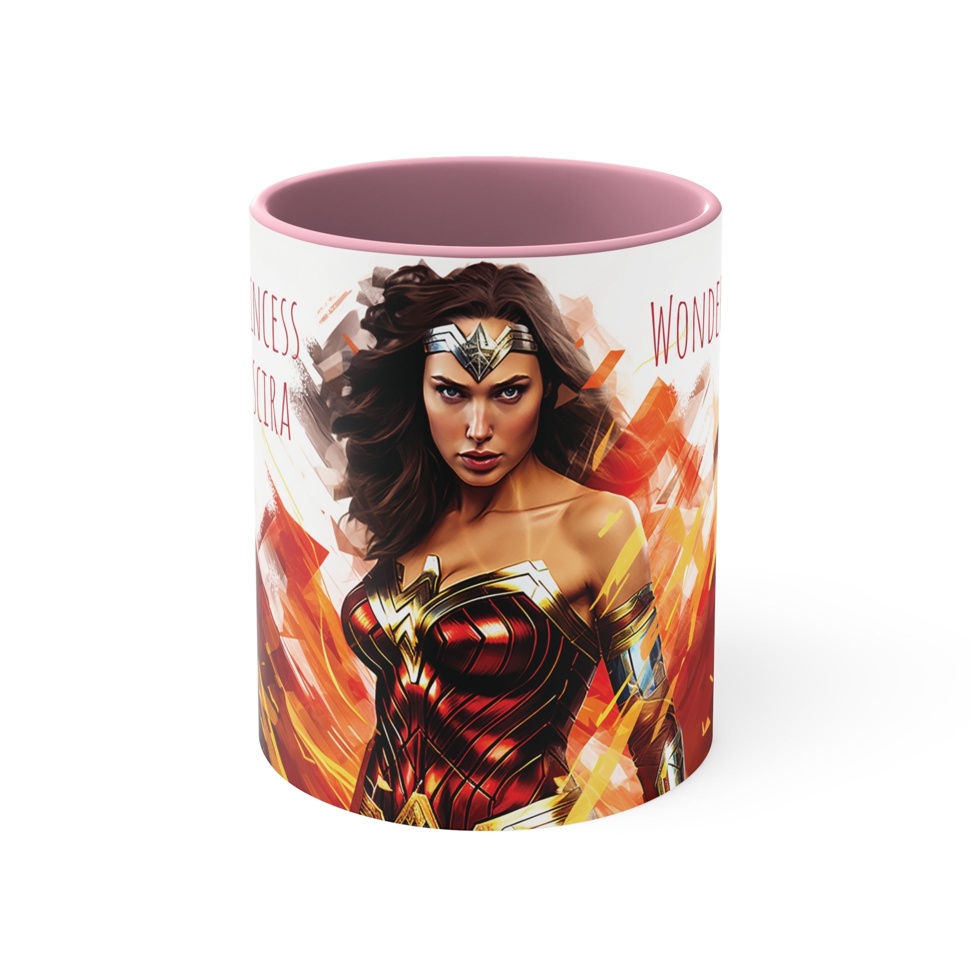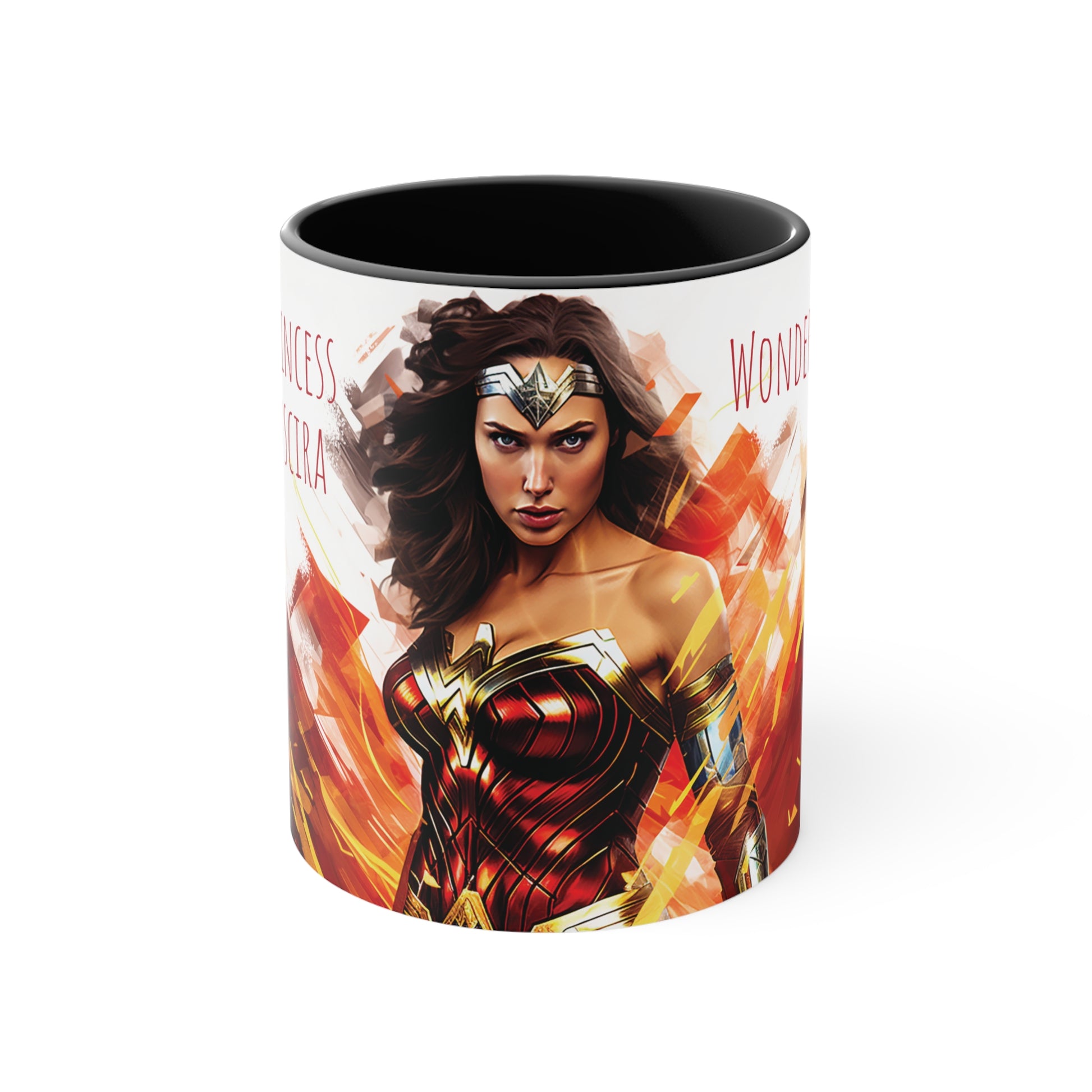 Keywords: Wonder Woman mug, Gal Gadot mug, Bicolor design, Diana Prince, Princess of Themyscira, Amazonian warrior, Empowering spirit, Iconic phrase, Favorite beverage, Superhero fan, Coffee or tea, Drinkware collectible, Strength and beauty.