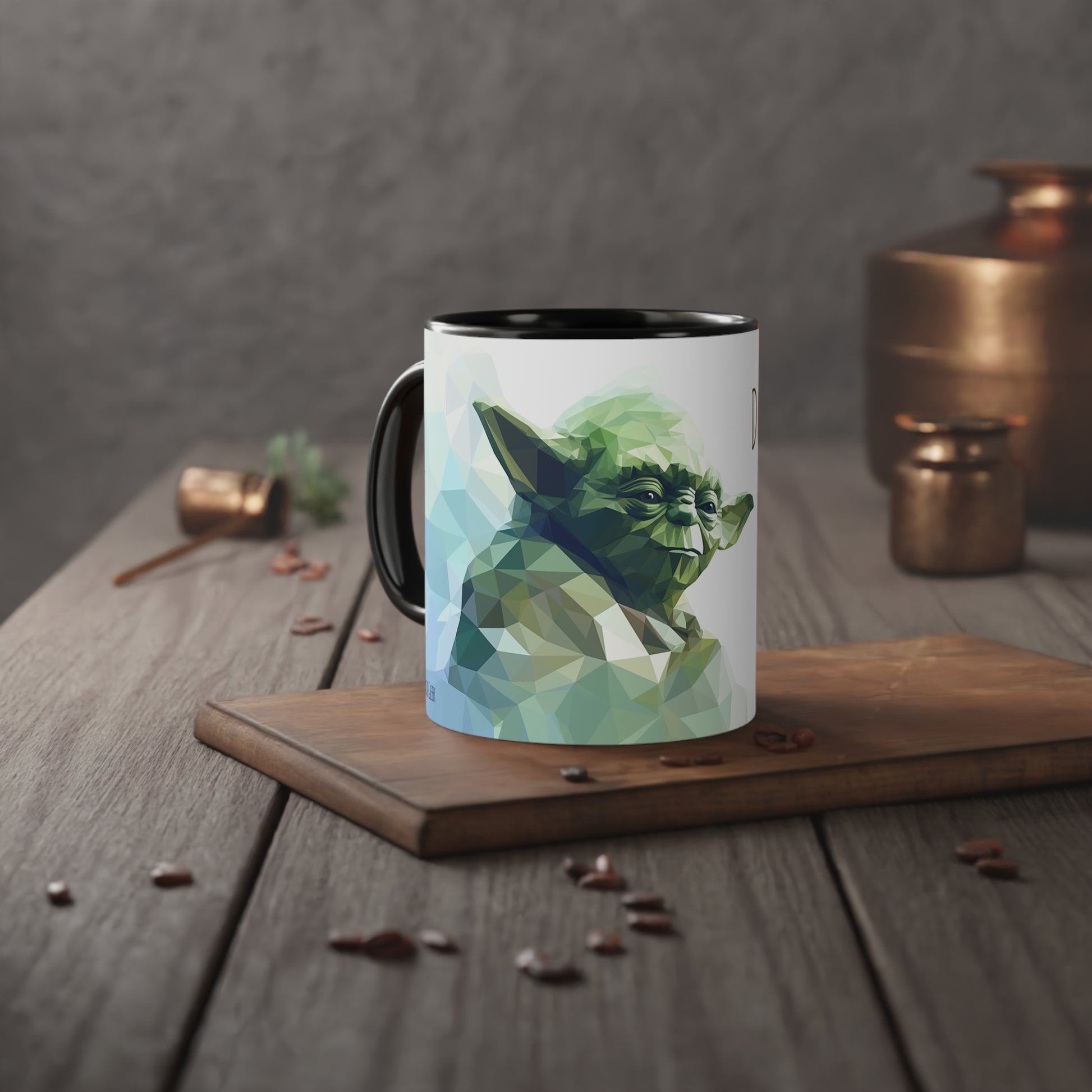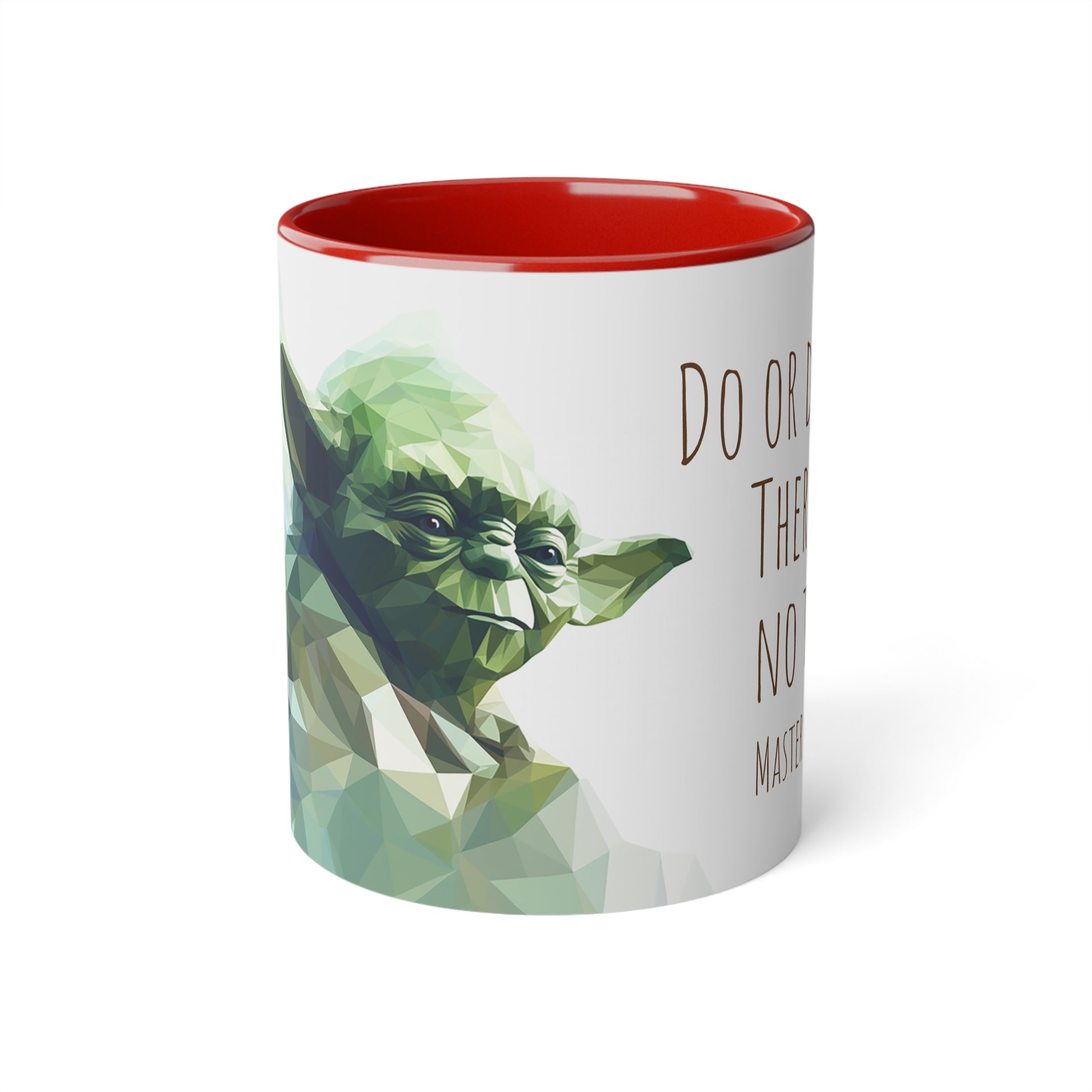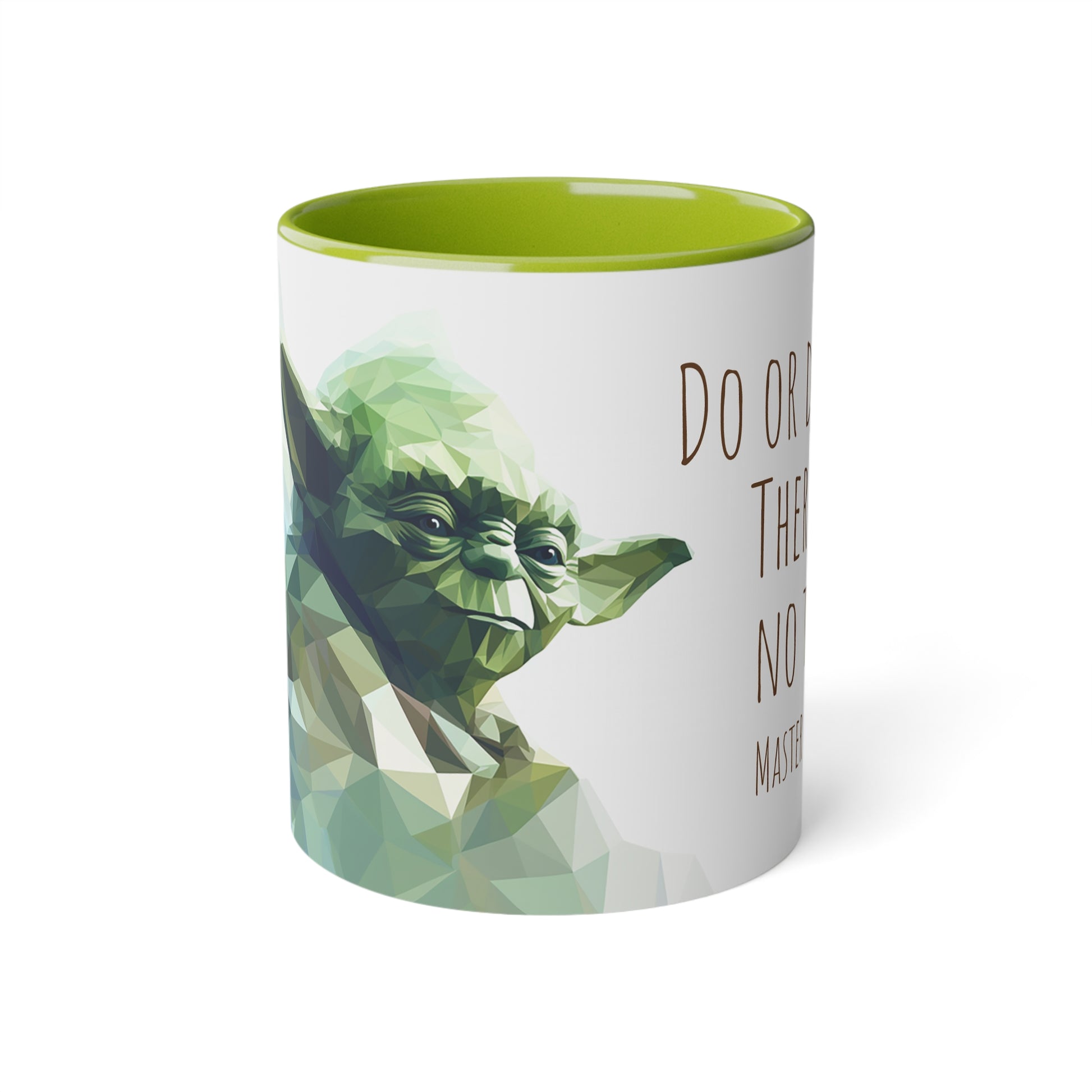 Keywords: Yoda mug, Geometric style, Bicolor design, Do or Do Not, No Try, Inspiring wisdom, Jedi Master, Iconic character, Profound guidance, Conquer challenges, Daily reminder, Beverage enjoyment, Drinkware collectible, Star Wars vibes.