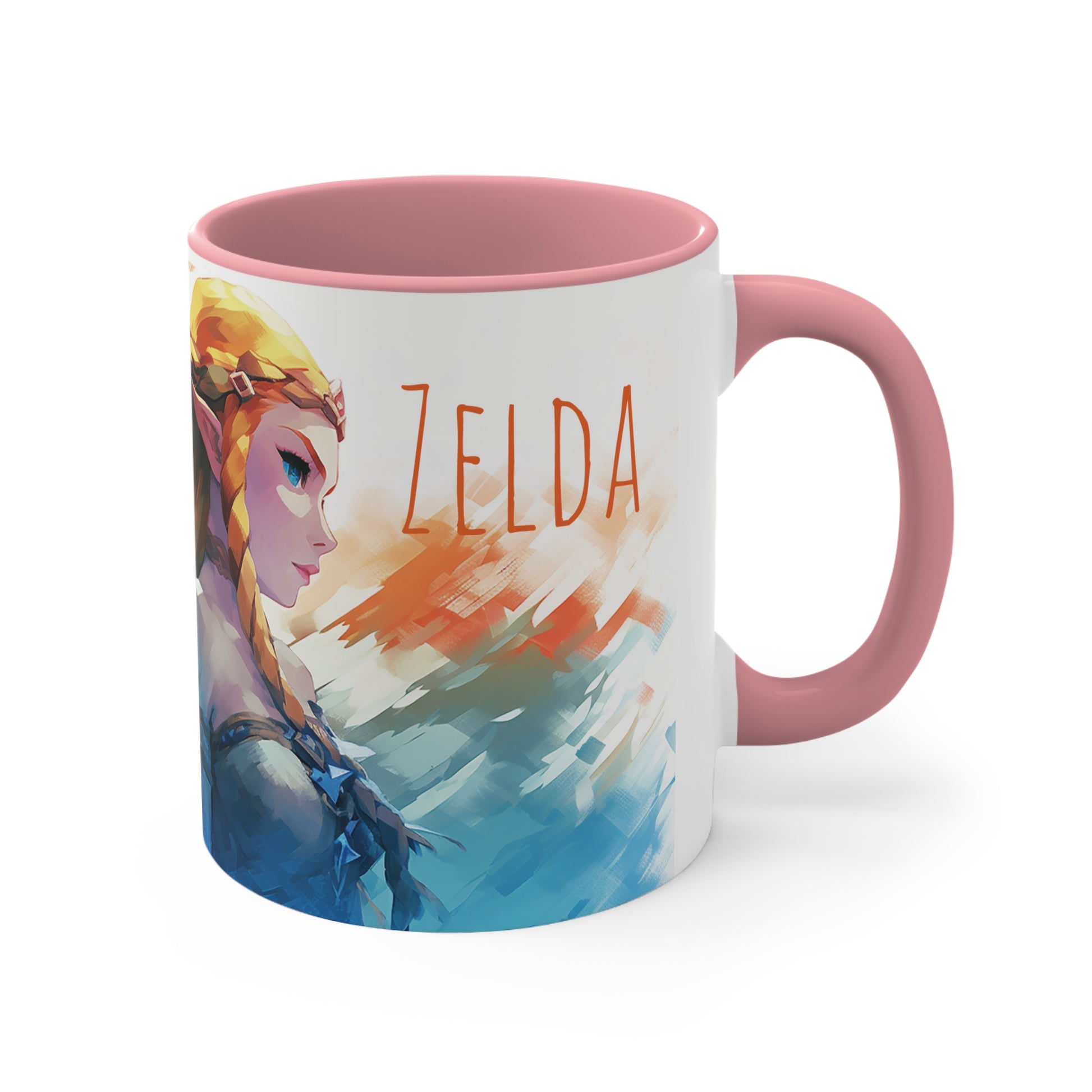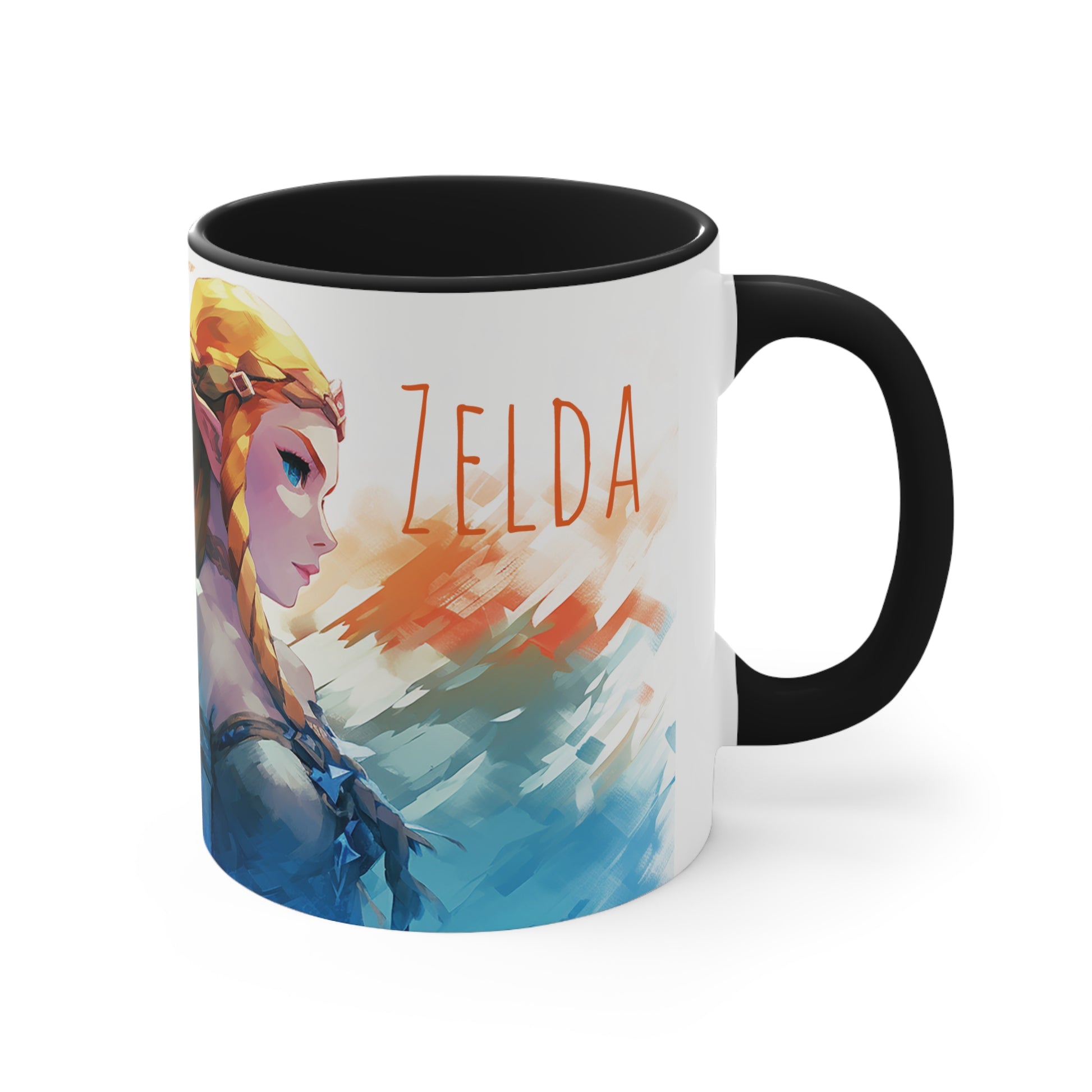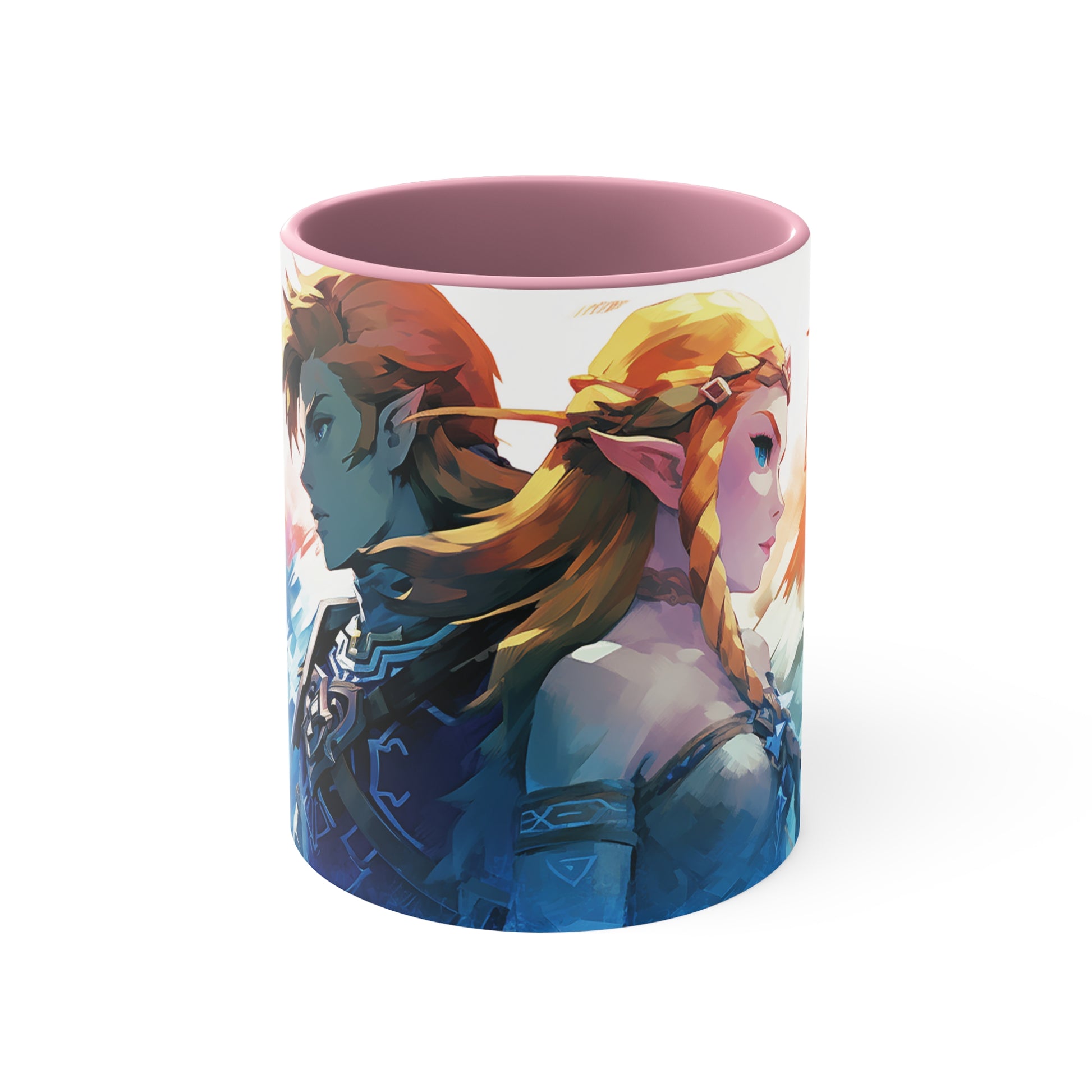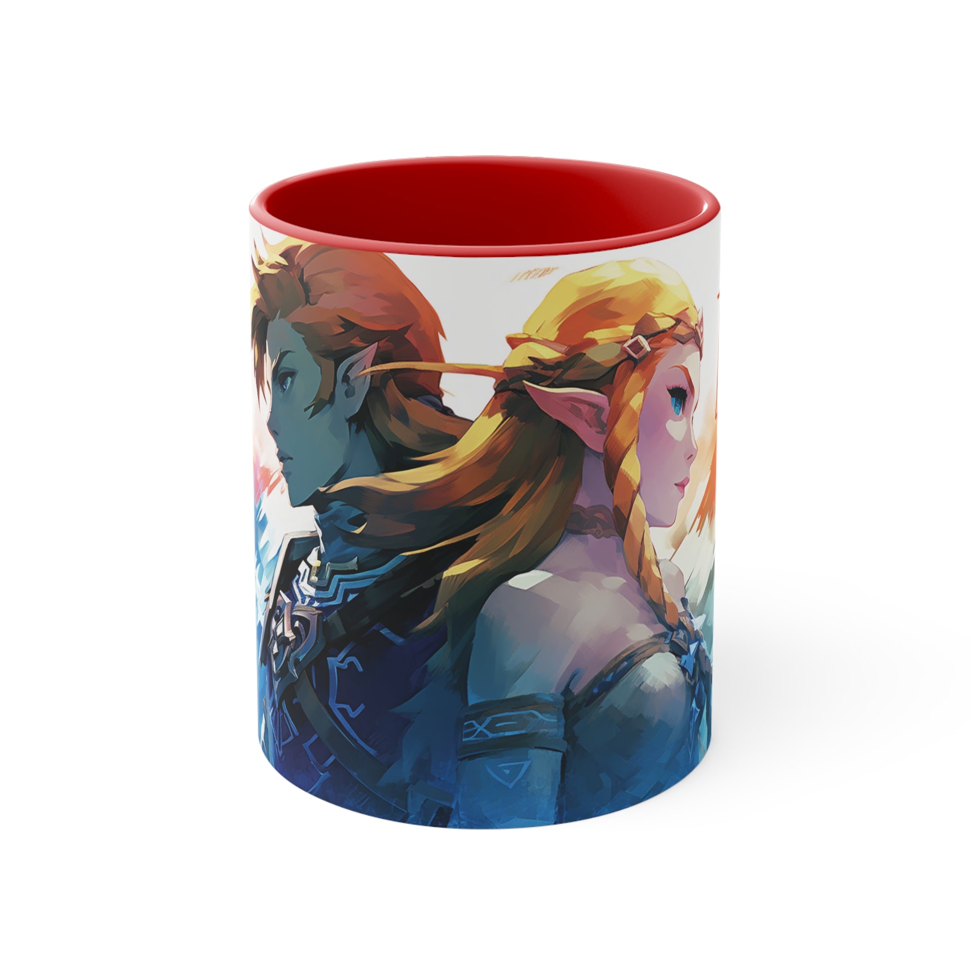Embark on a legendary adventure with this 11 oz bicolor mug featuring Princess Zelda and Link in a captivating geometric style. Celebrate the timeless tale of courage, friendship, and destiny with every sip. Crafted with high-quality materials, this mug showcases the iconic characters in a visually stunning design. Perfect for fans of the beloved Legend of Zelda series, this mug is a must-have addition to any collection or gift for gamers and fantasy enthusiasts. Keywords: Princess Zelda, Link, Legend of Zelda, geometric style, adventure, timeless tale, courage, friendship, destiny, high-quality materials, visually stunning design, fans, collection, gift, gamers, fantasy enthusiasts. Add some color to your routine with this two-tone, custom accent coffee mug. This 11oz mug features an accented C-Handle that is comfortable to use, as well as an accented interior to add more contrast and character. With your design on this mug, you get an instant winner of a product. .: White ceramic with colored interior and handle .: C-handle .: Eye-catching color contrast .: Lead and BPA-free